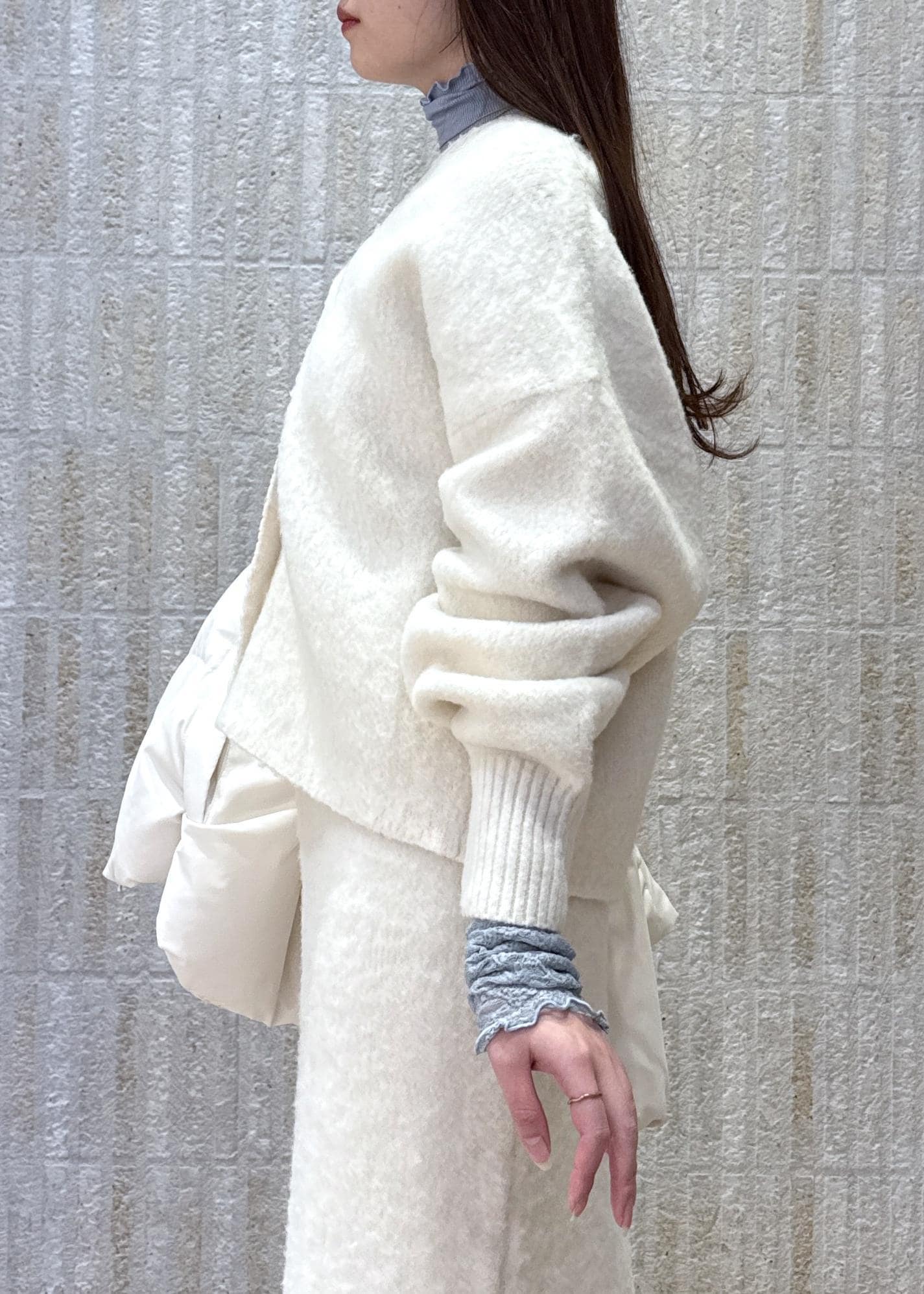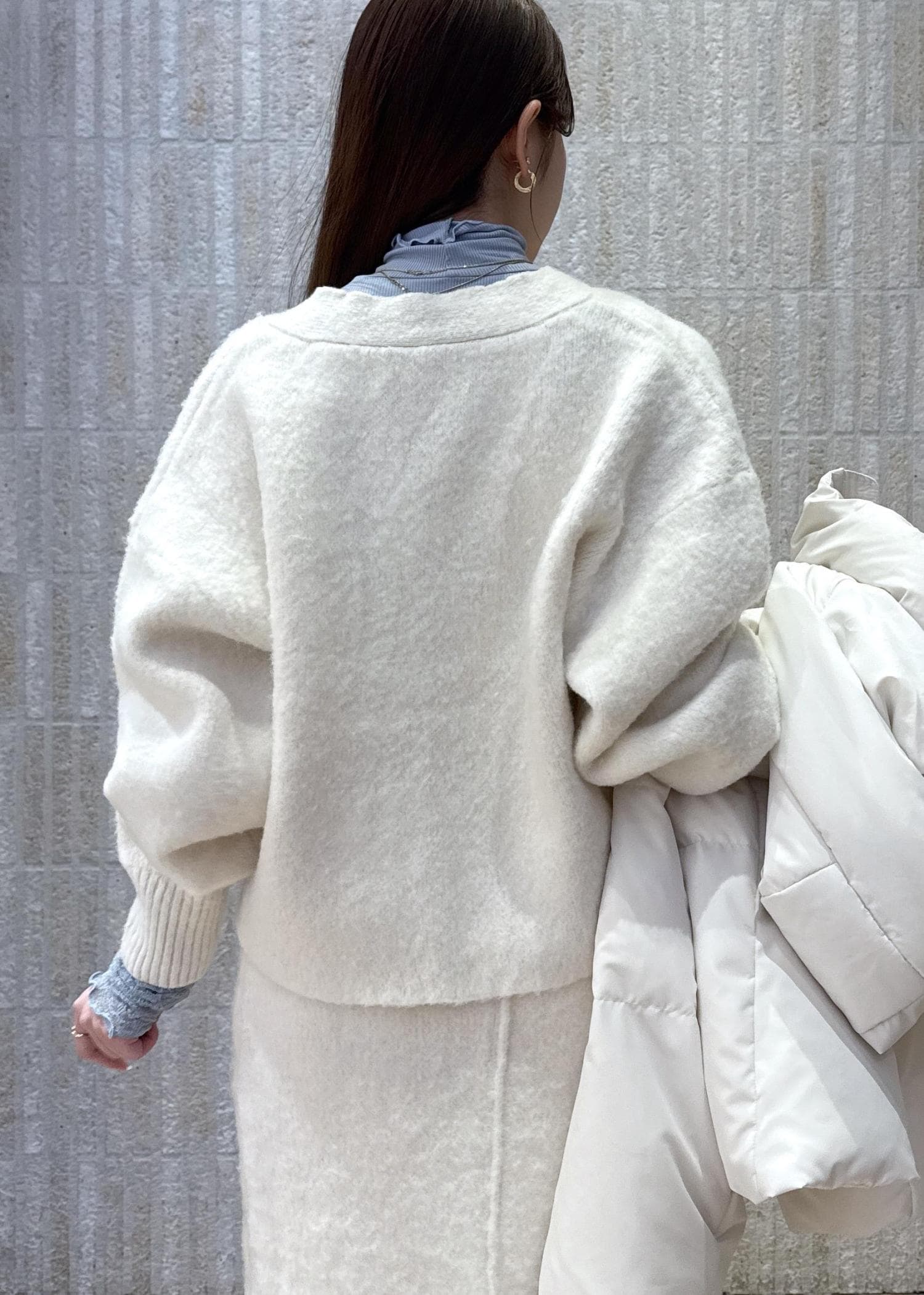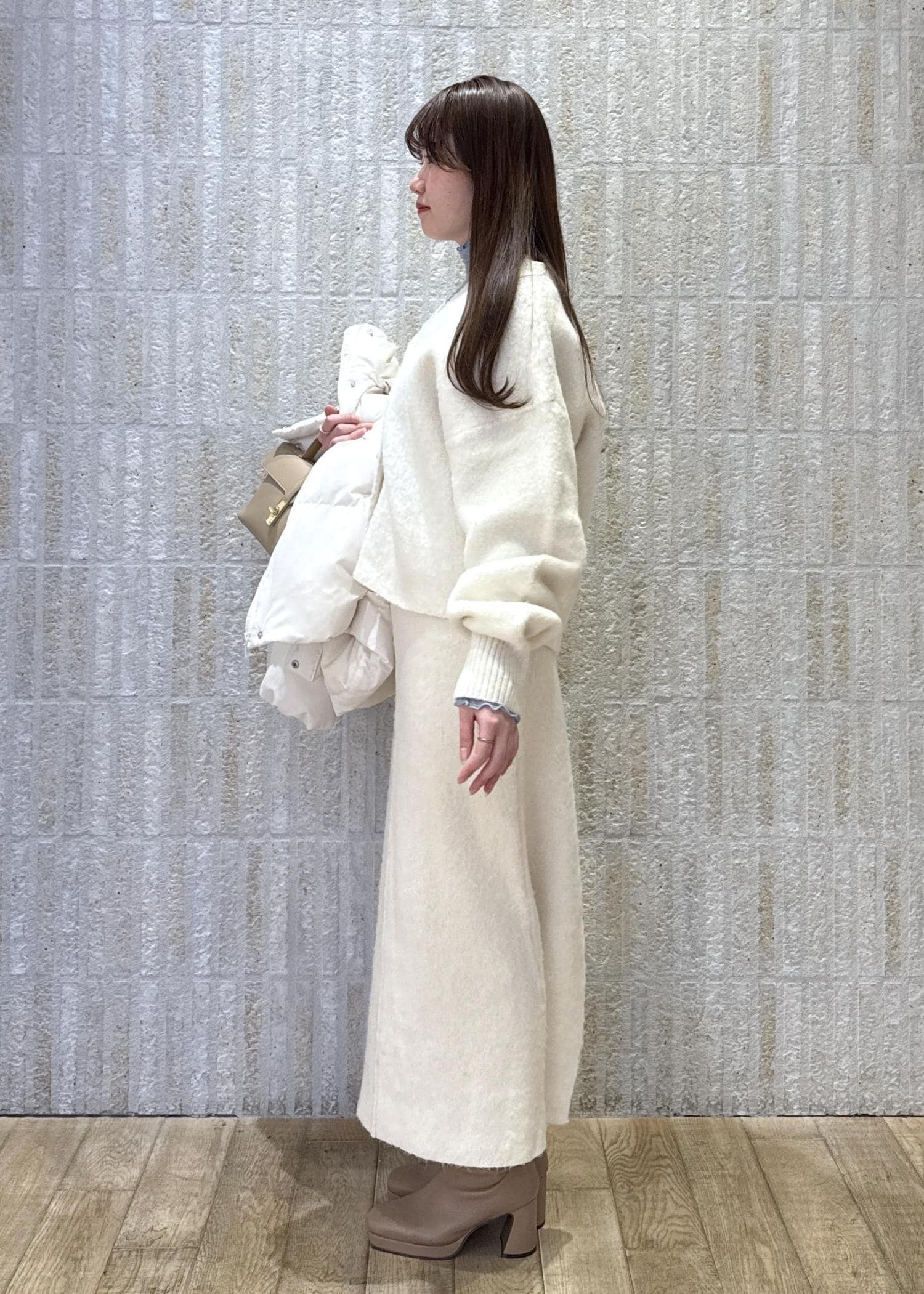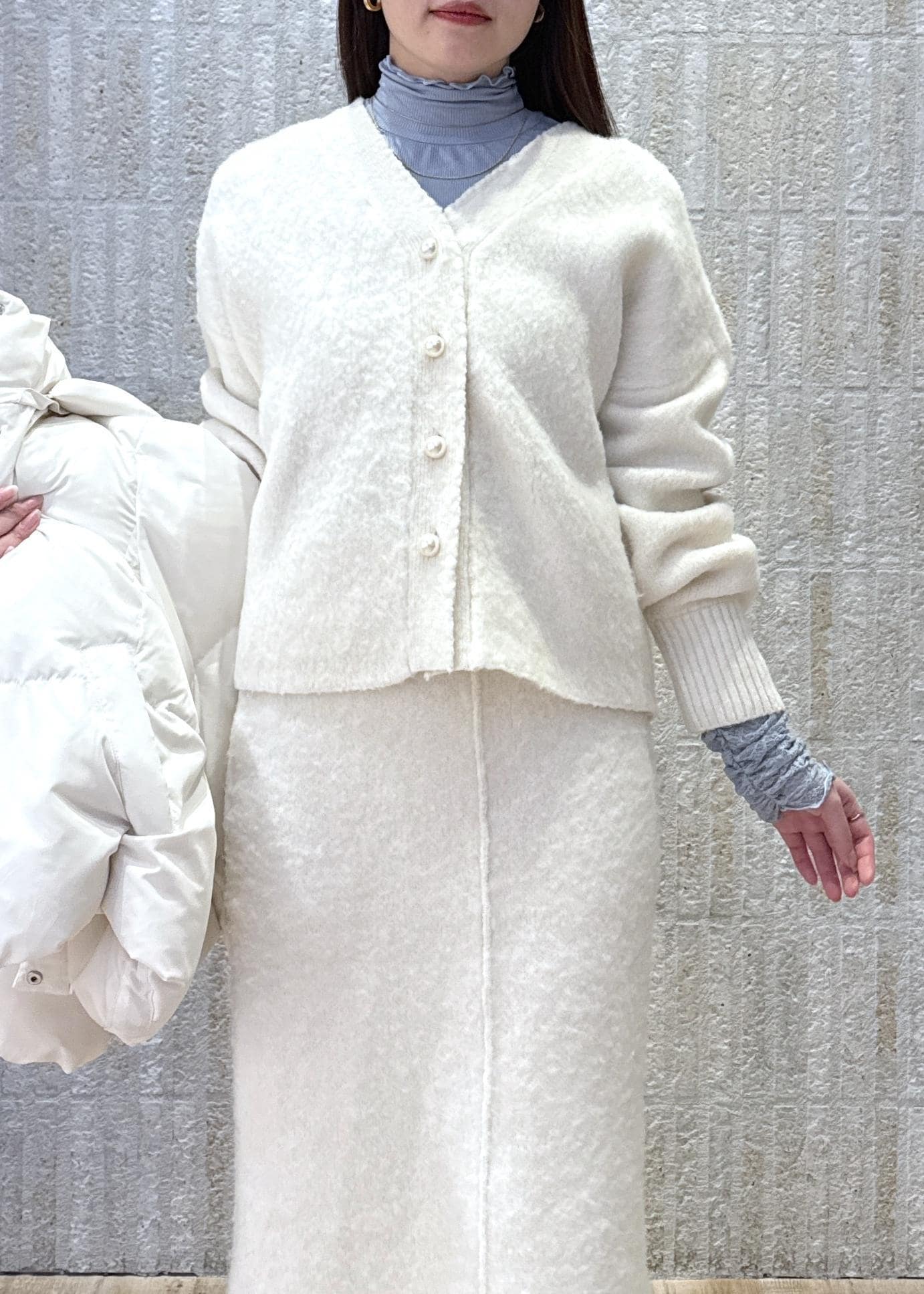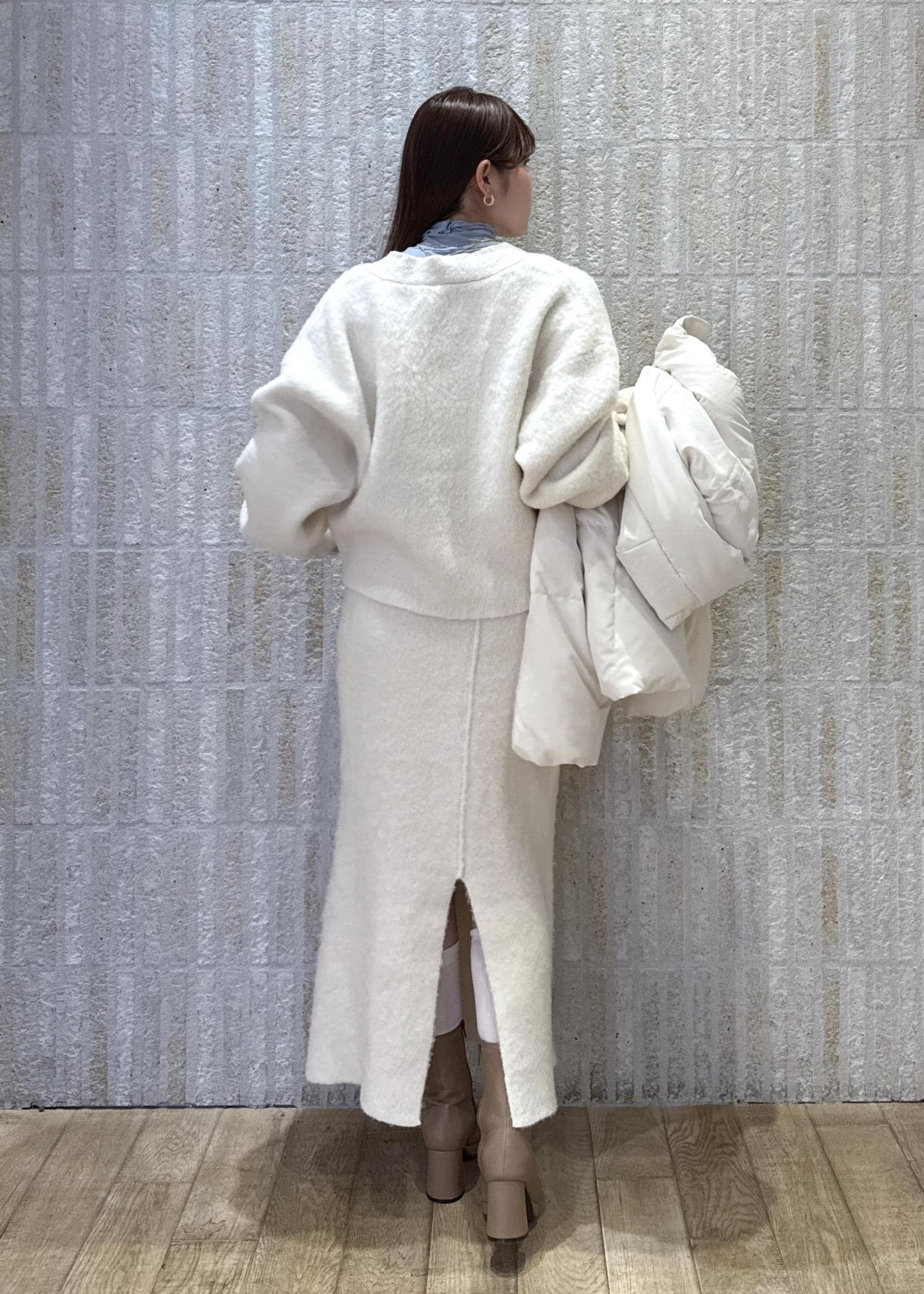 冬らしいシャギーニットのセットアップをメインに、ホリデーシーズンにもぴったりなホワイトコーデでまとめてみました♡