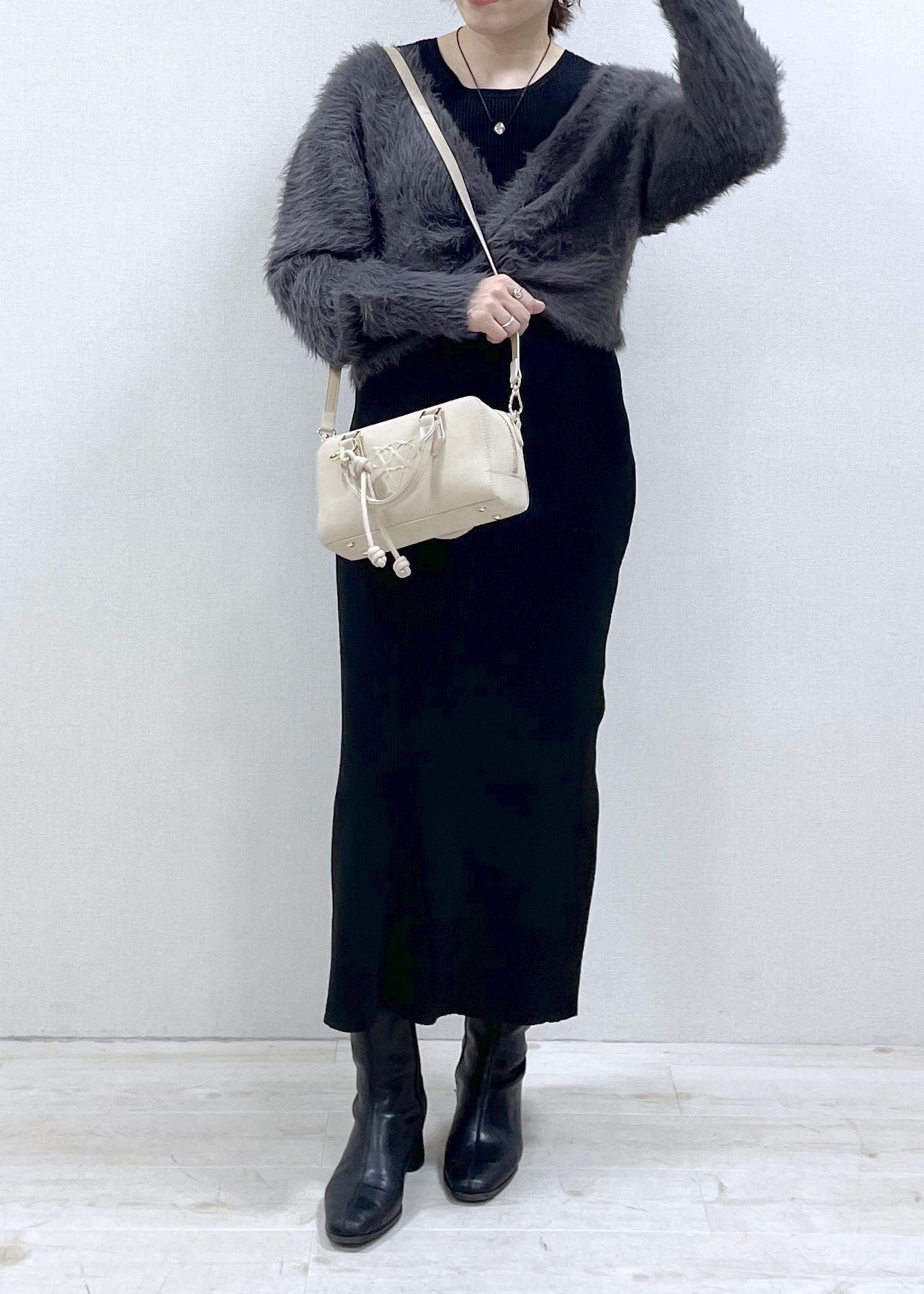 VISねじりショートトップス付きロングニットワンピース/イージーケアチャコール / F¥9,999レビュー柔らかいフェザーのトップスと、伸縮性のあるニットワンピースのセットアイテムです!