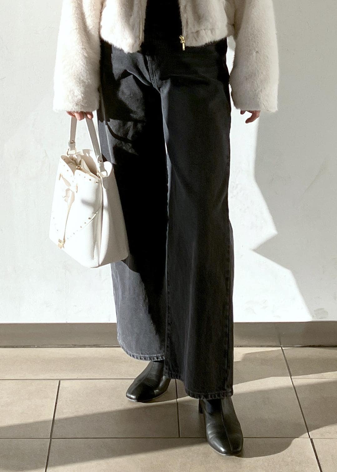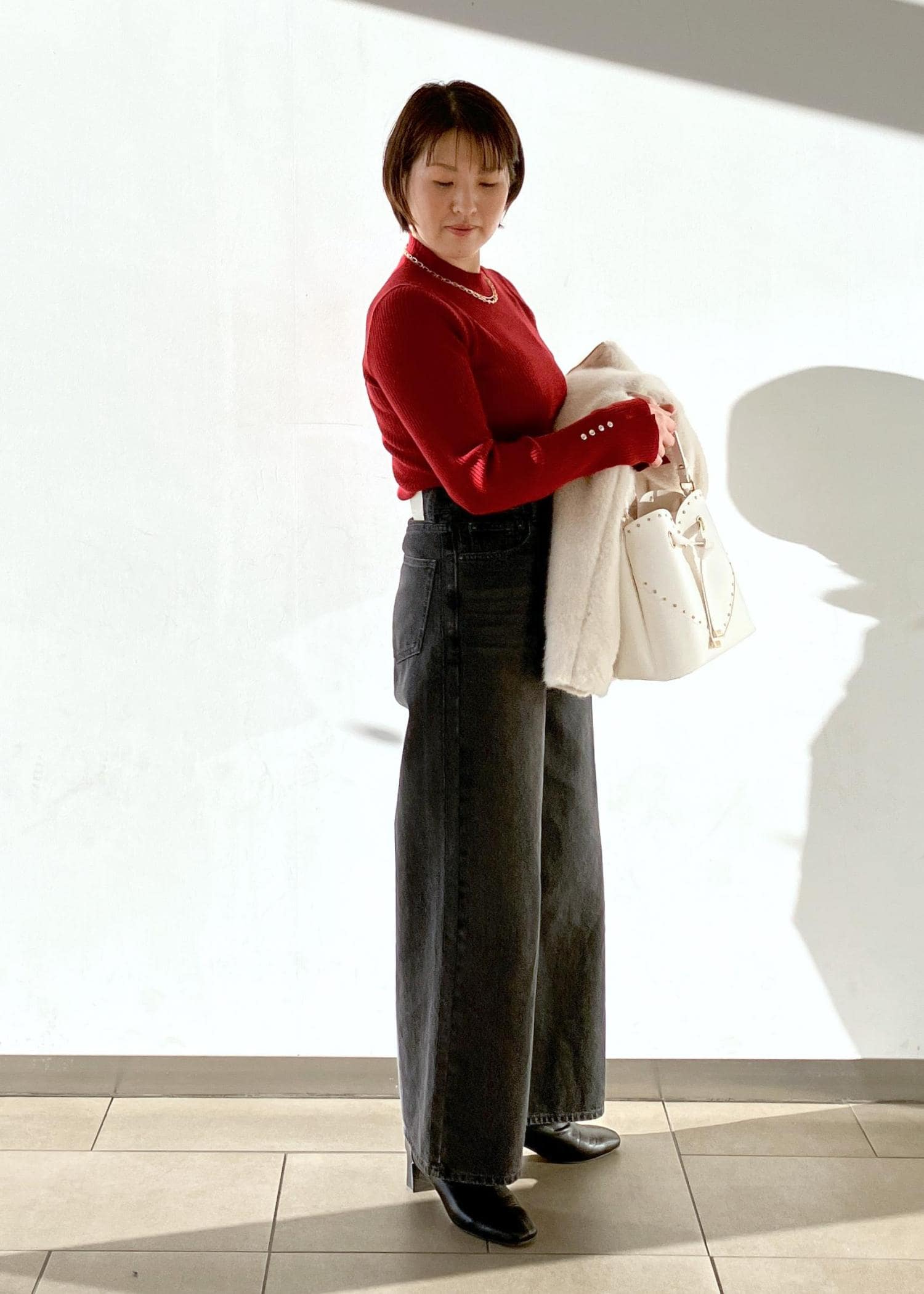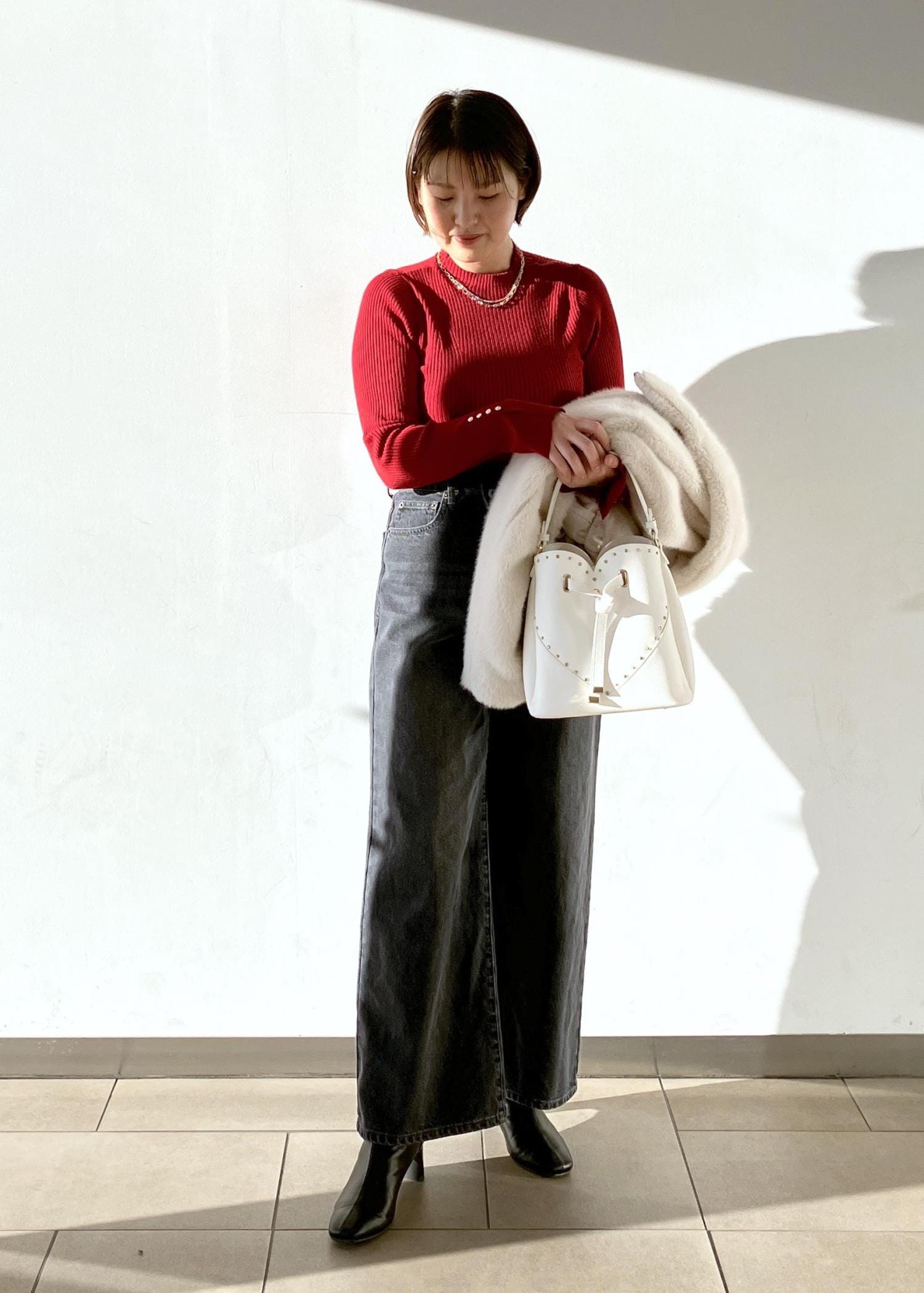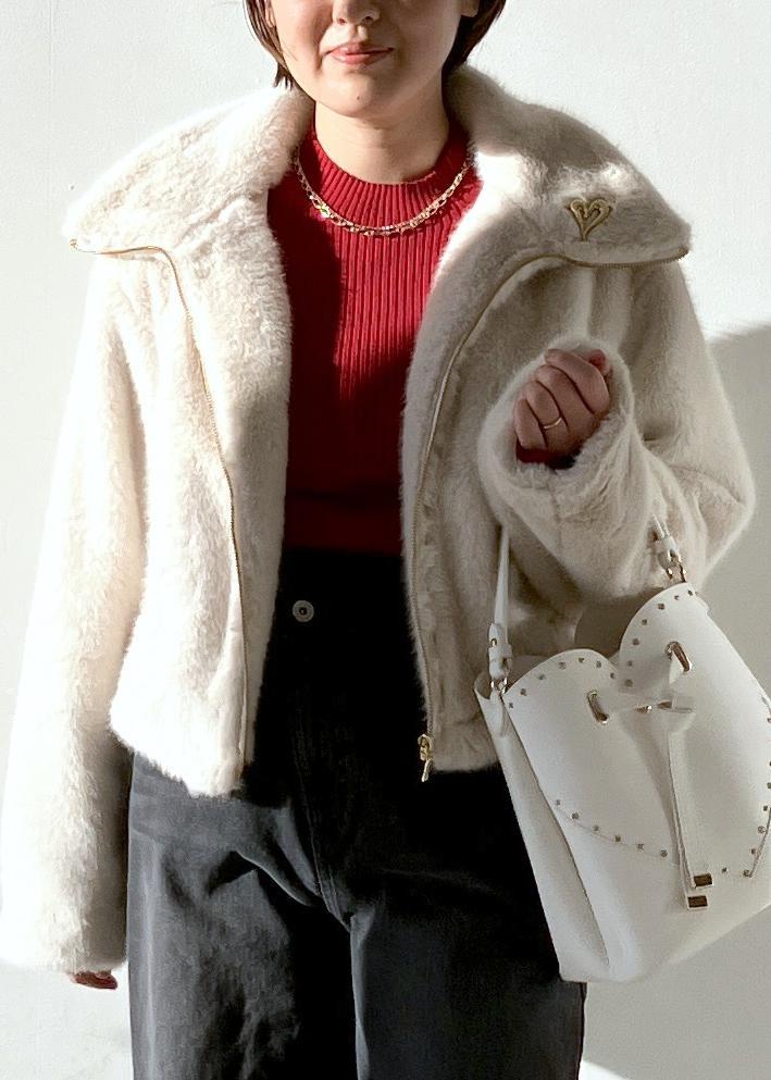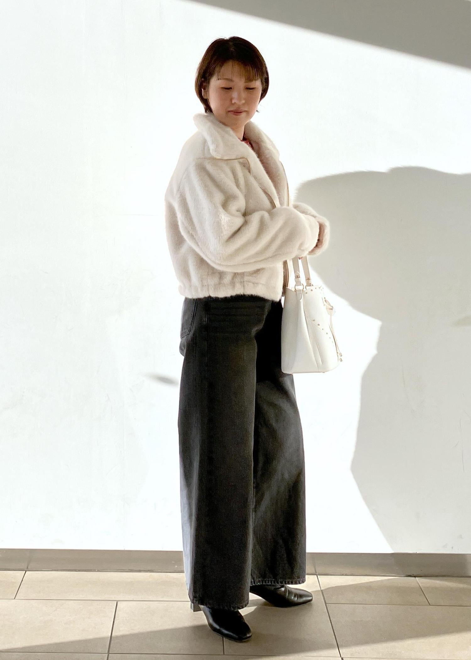 ボドムスを選ばないショート丈のアウターはふわふわな毛並みがつい触りたくなるこの時期おすすめの1着です!インナーは赤、アクセサリーはゴールドでクリスマスが近いので意識して取り入れてみました!
