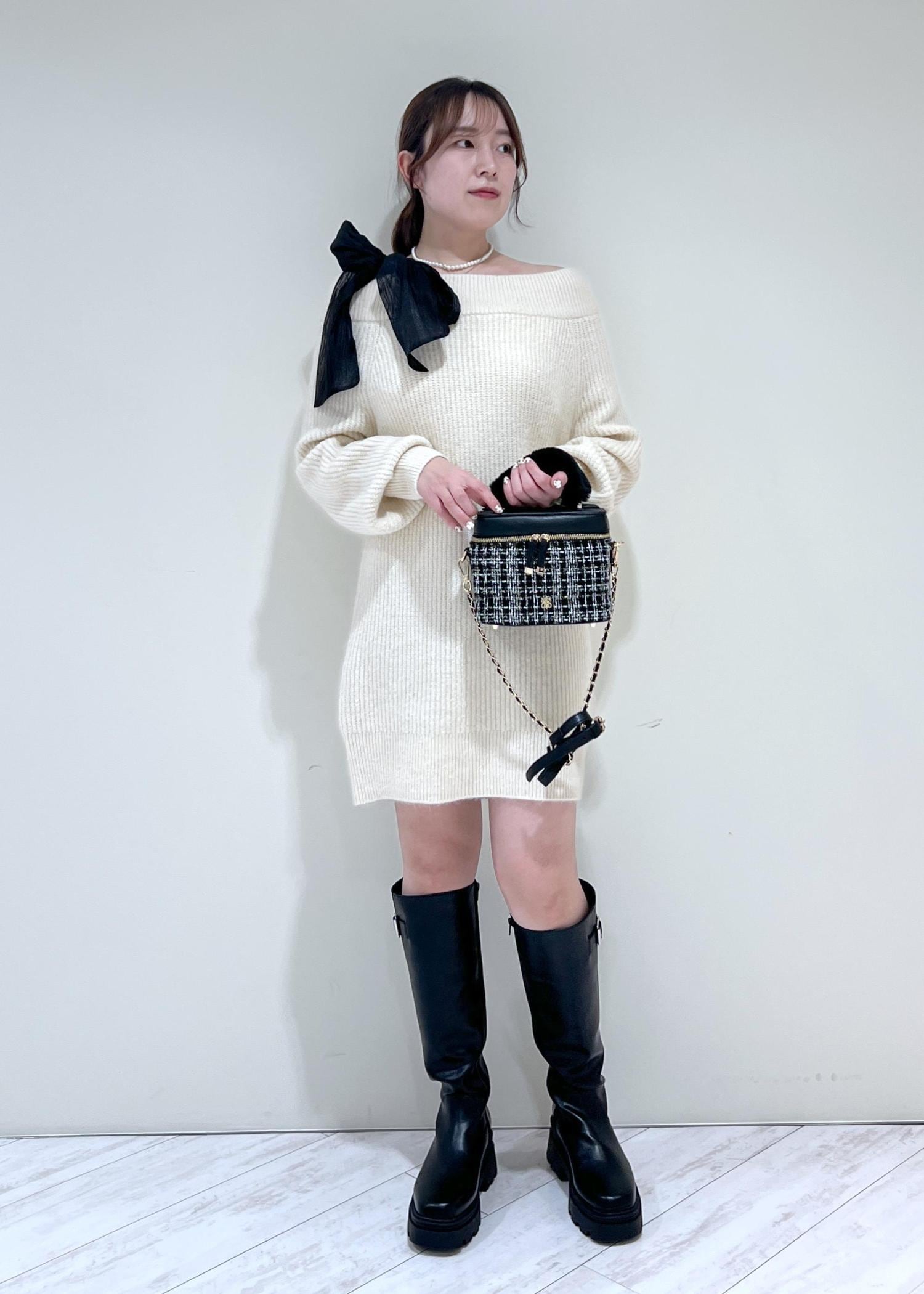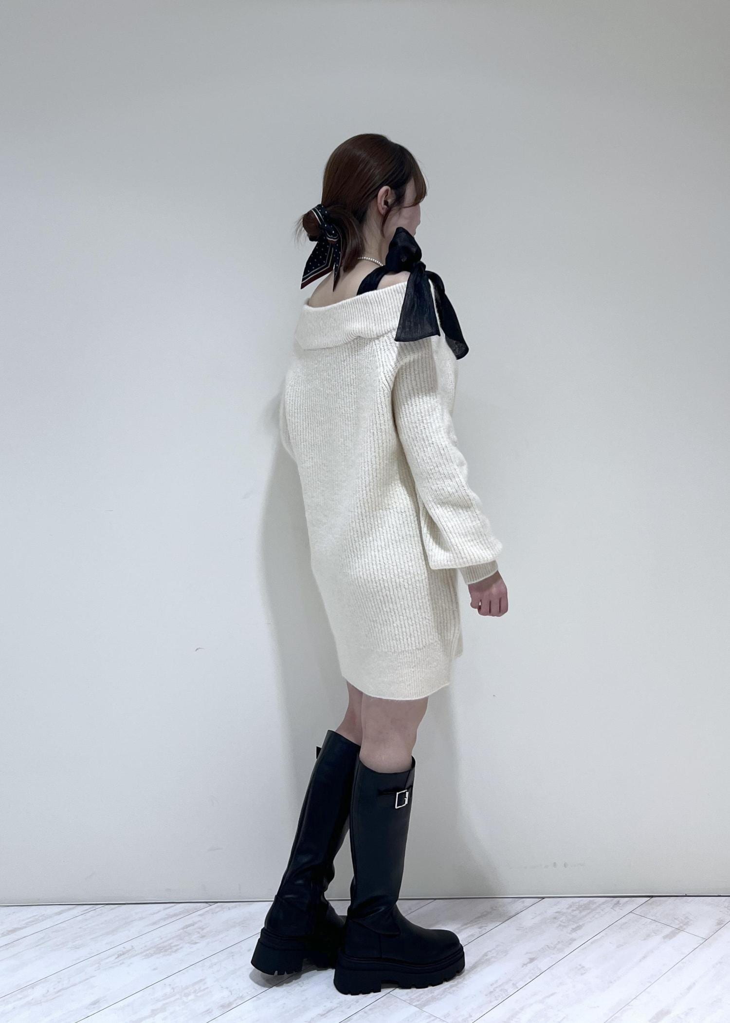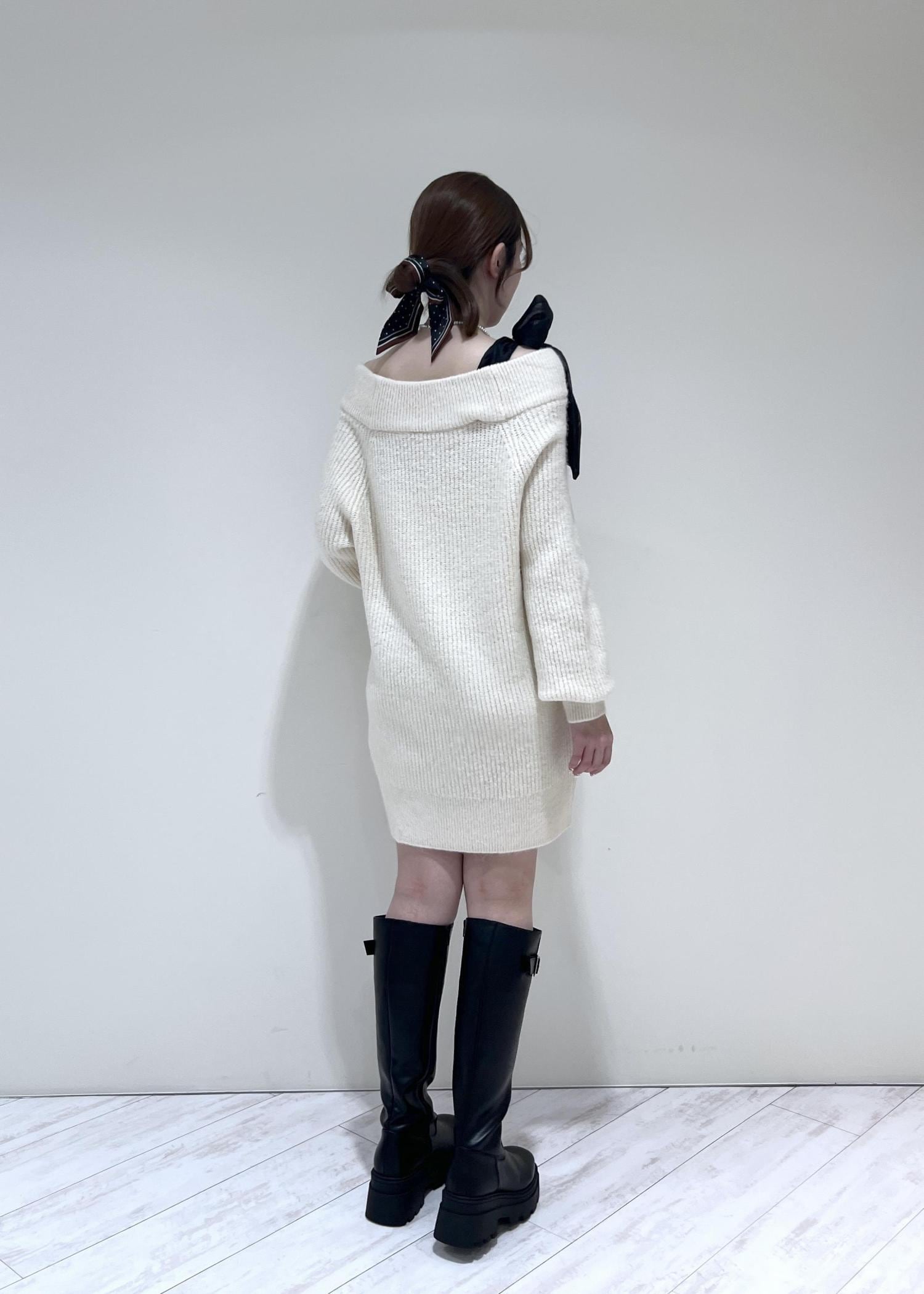 VIS肩リボンミニ丈ニットワンピース/2WAYキナリ / F¥7,909レビュー程よくゆとりのあるサイズ感です!身長164cmで1枚でも着られる丈でした。生地感はチクチク感のない柔らかニットで、伸縮性もあり着心地◎