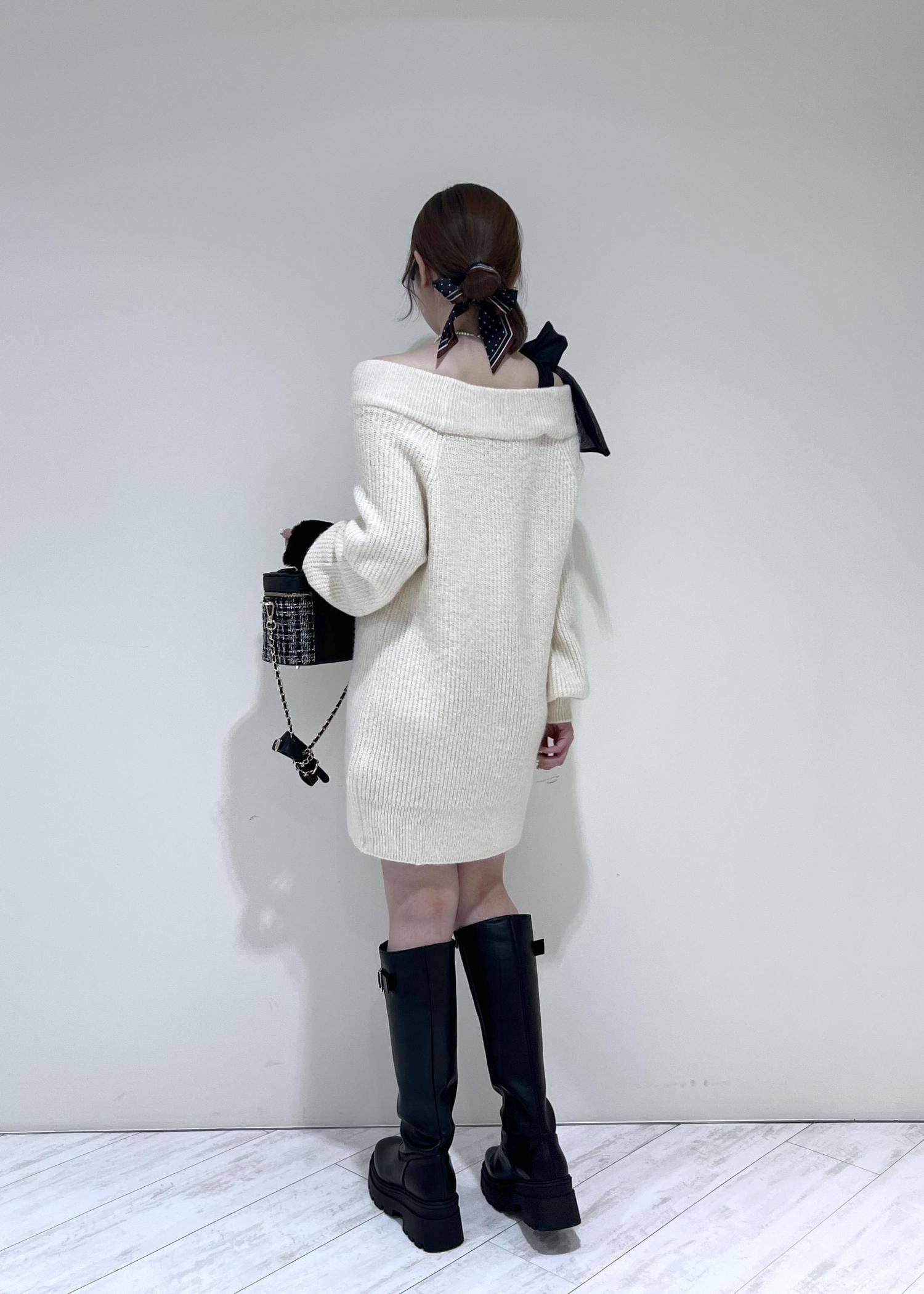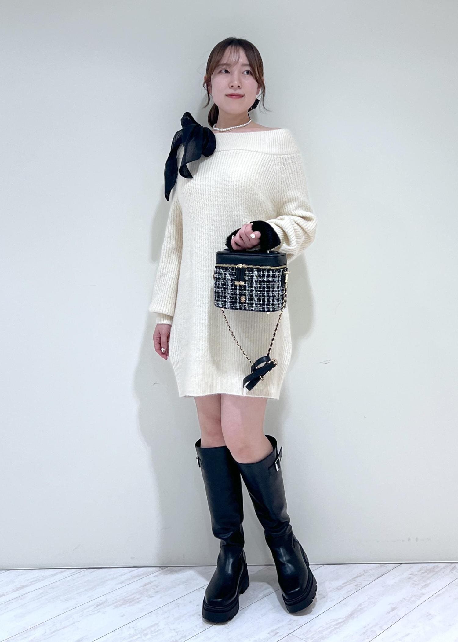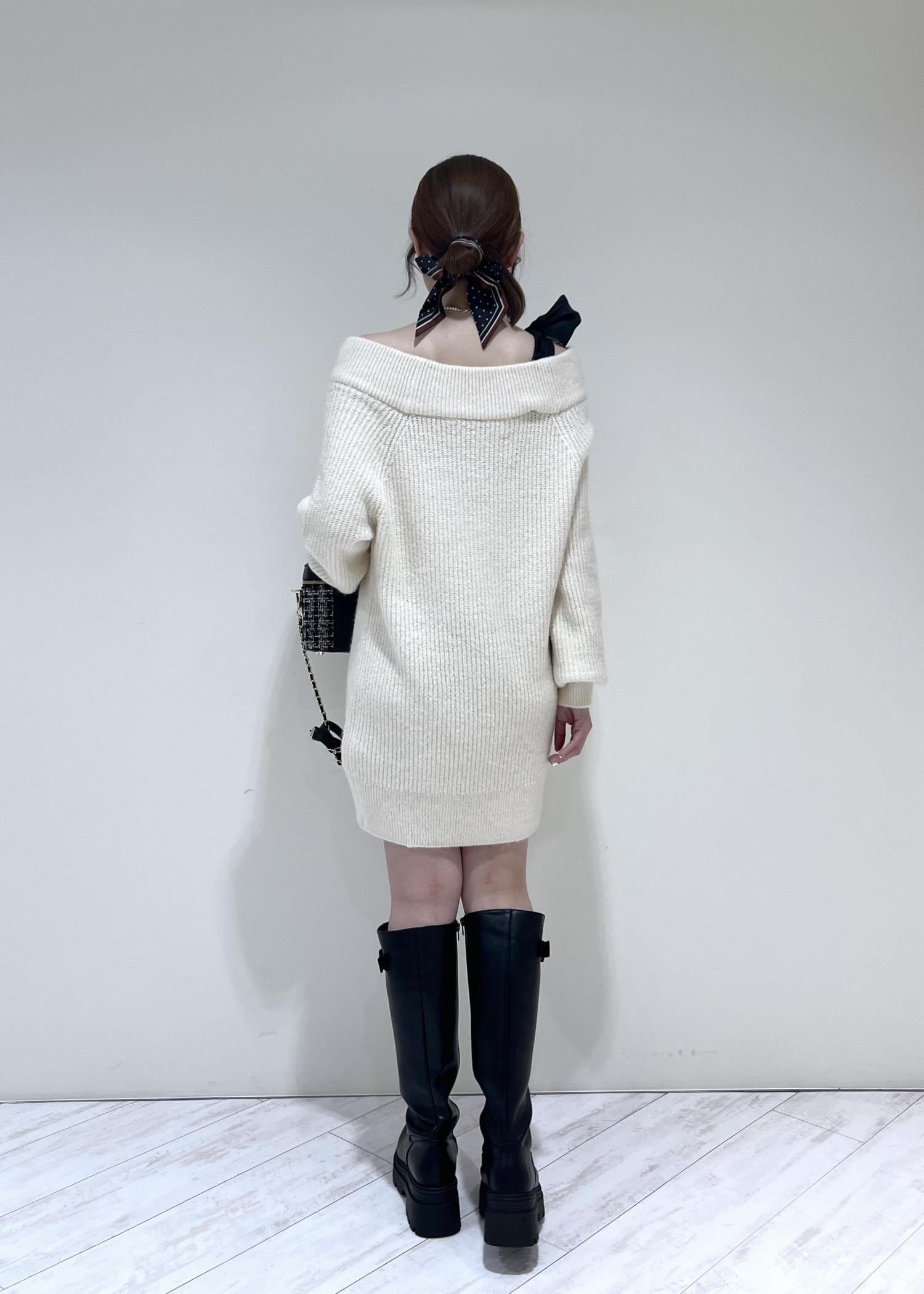 VIS肩リボンミニ丈ニットワンピース/2WAYキナリ / F¥7,909レビュー程よくゆとりのあるサイズ感です!身長164cmで1枚でも着られる丈でした。生地感はチクチク感のない柔らかニットで、伸縮性もあり着心地◎