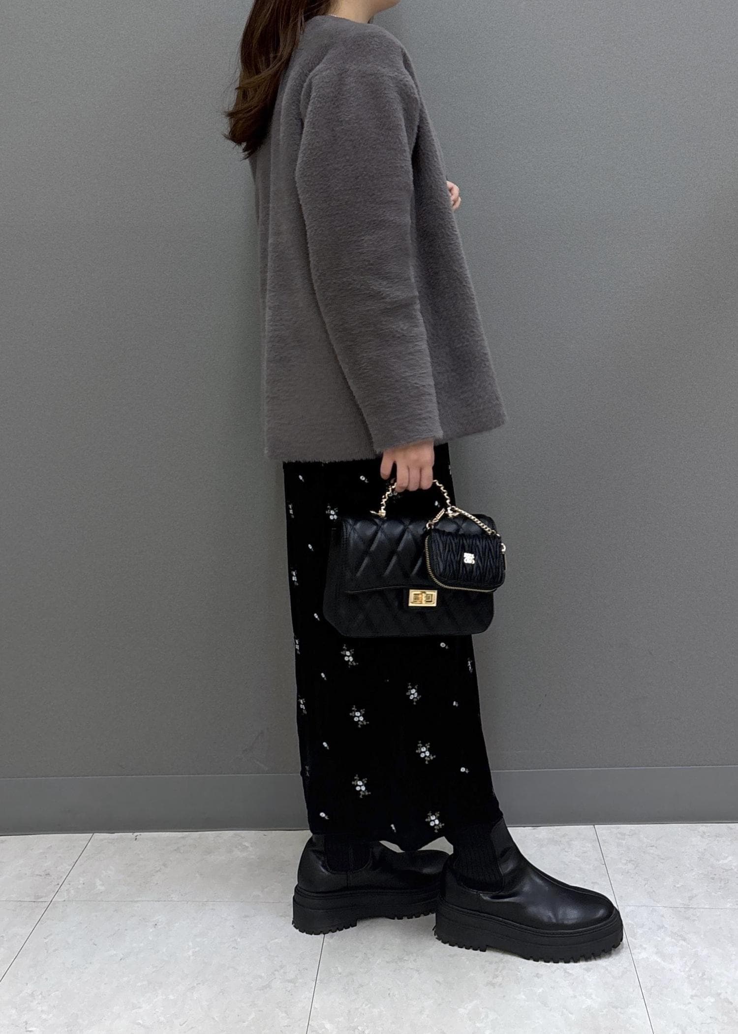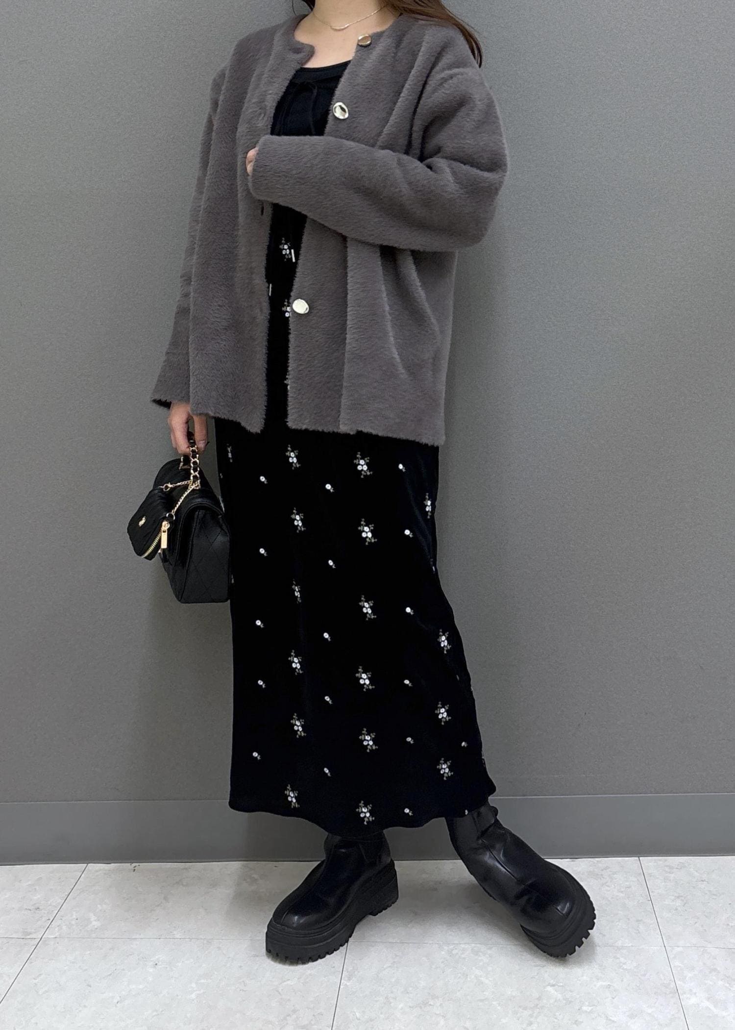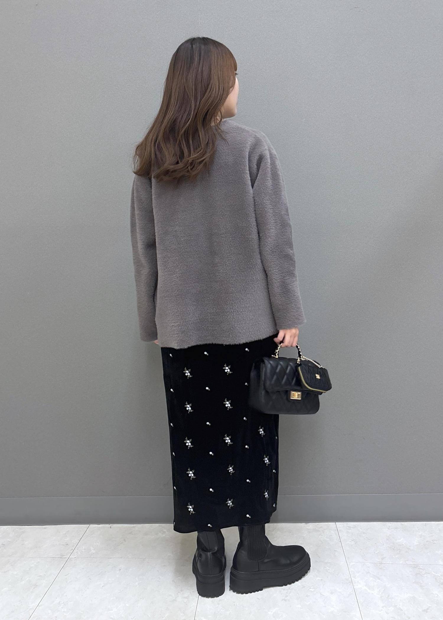ふわふわ素材のニットコートを合わせて、