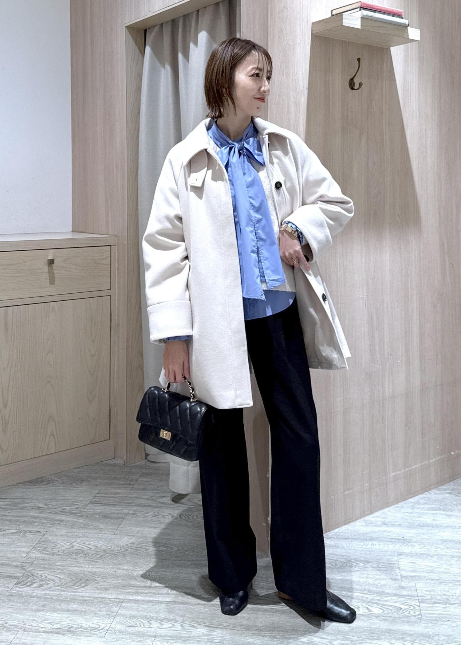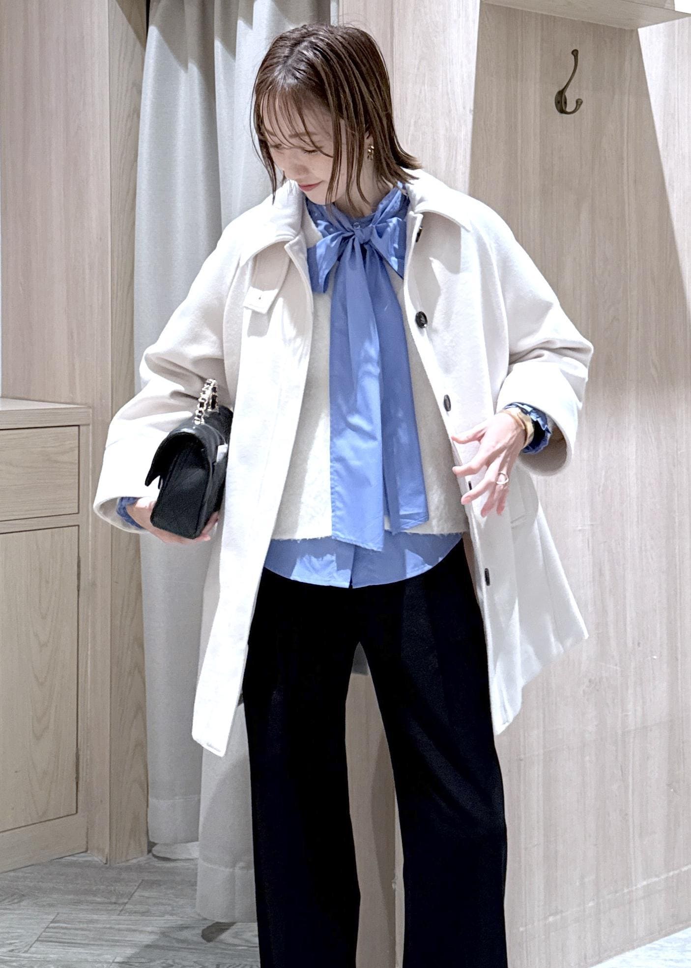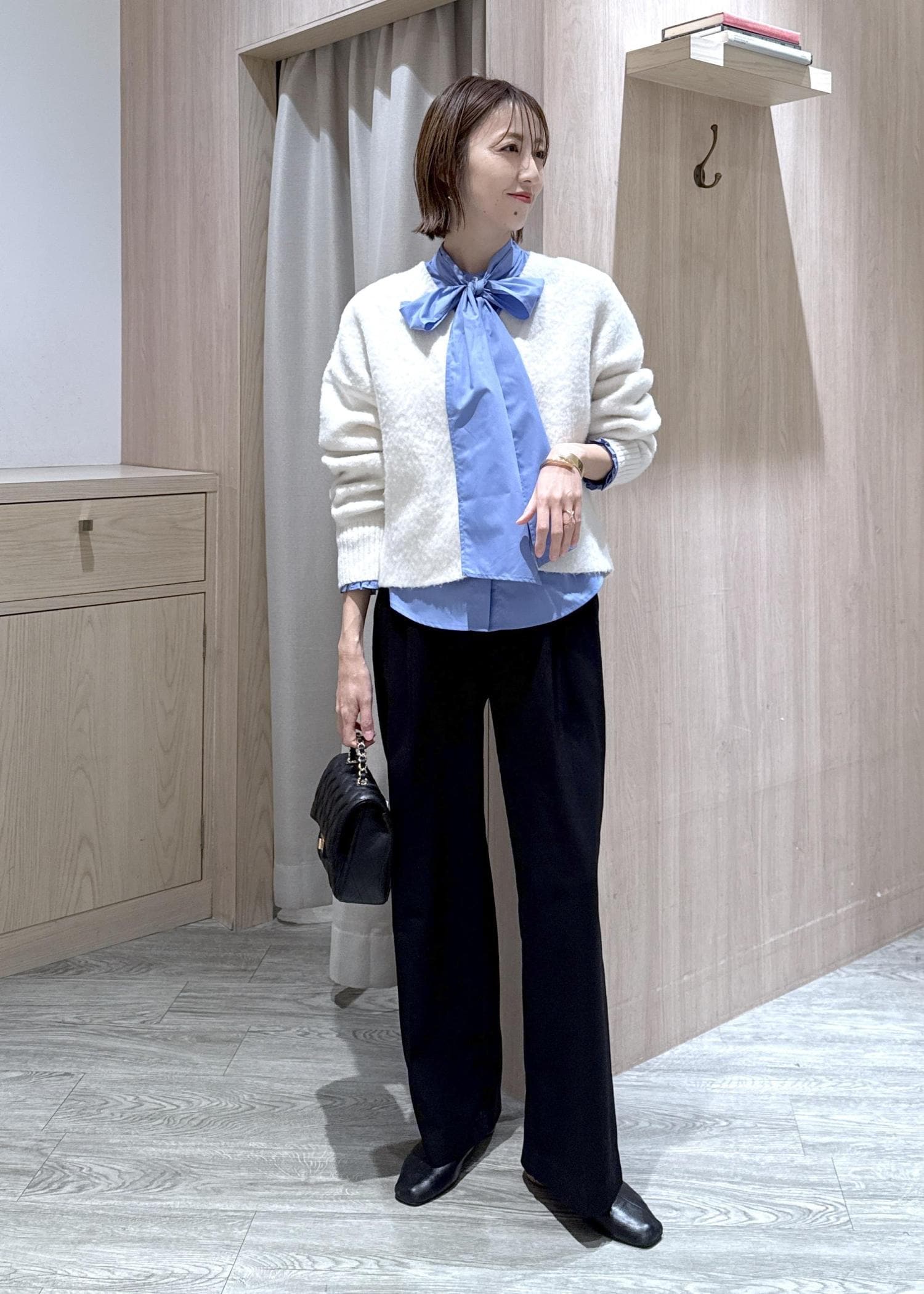 ブルーのボウタイシャツに白カーディガンをレイヤードしたオフィスカジュアルコーデです!