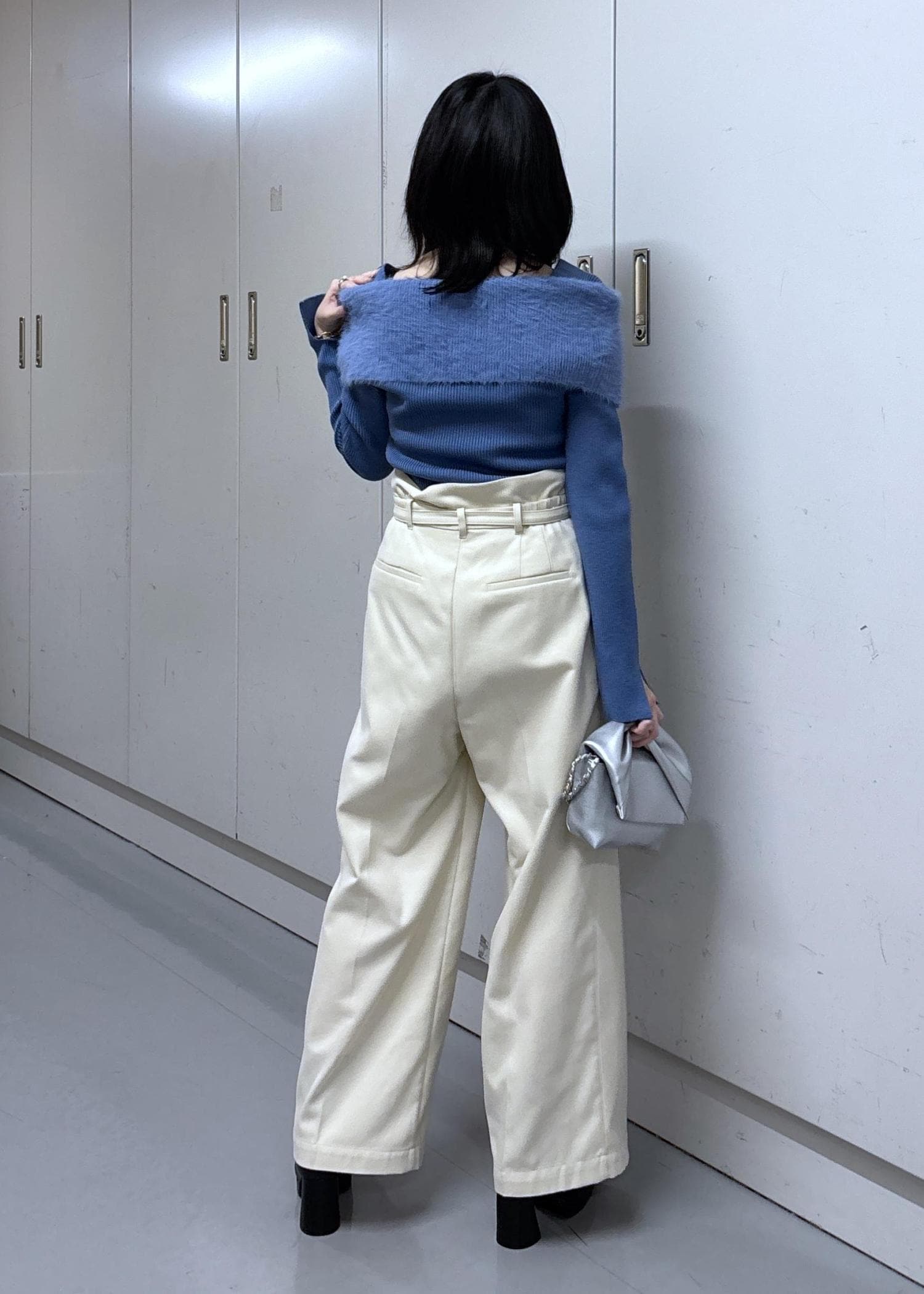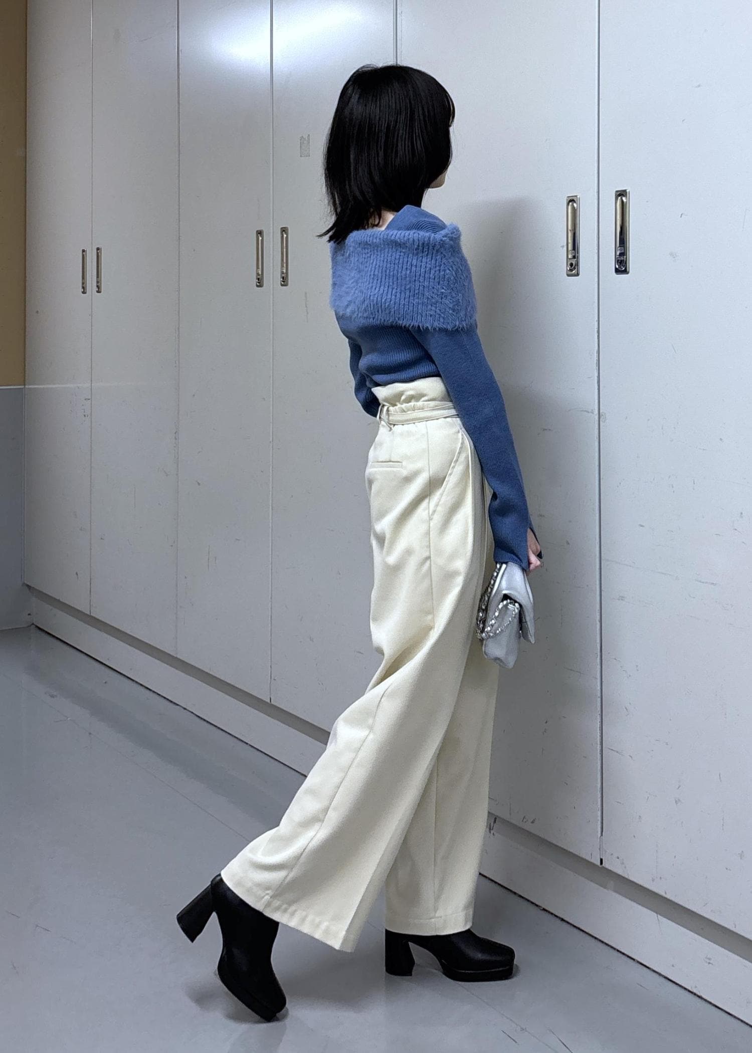 トップスに目を引くブルーを着て、ボトムはハイウエストパンツを選ぶことで脚長効果✨
