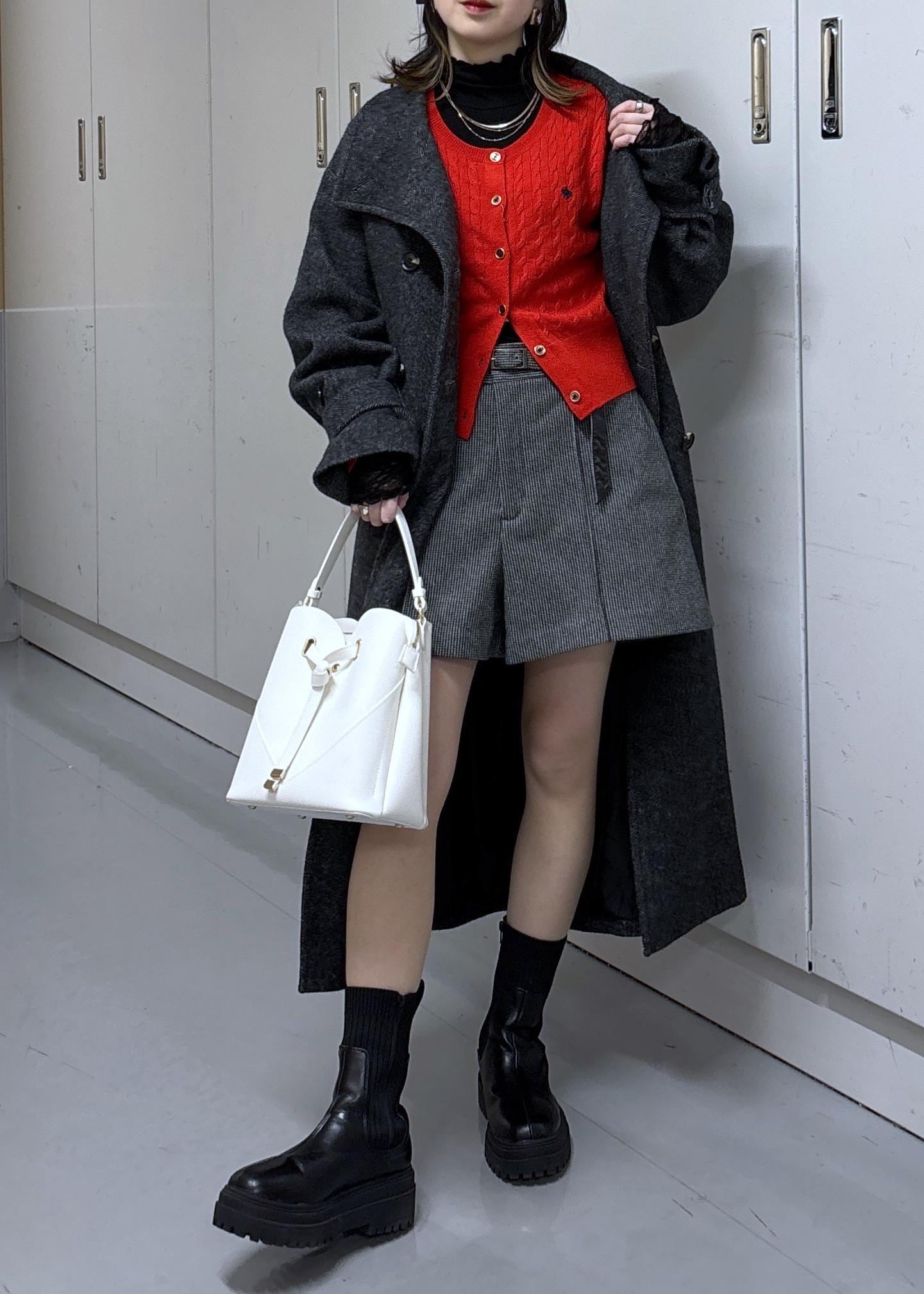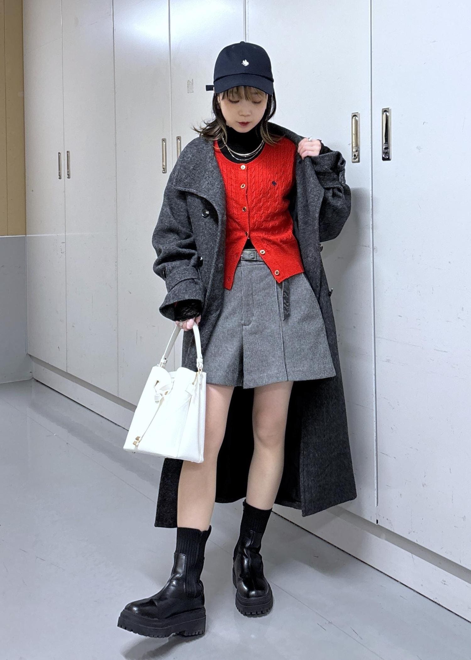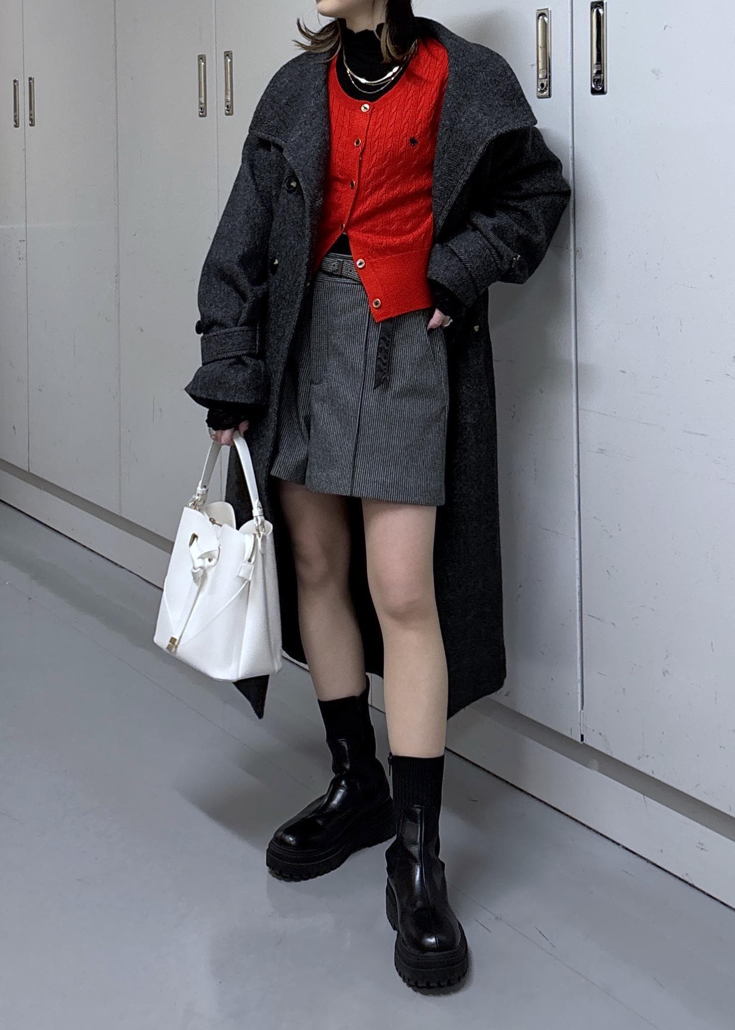 ロングコートを着ると着られている感が出てバランスが取りにくいのが悩みですが、コンパクト丈トップス×ミニ丈ボトム×ショートブーツの合わせだといい感じでした◎