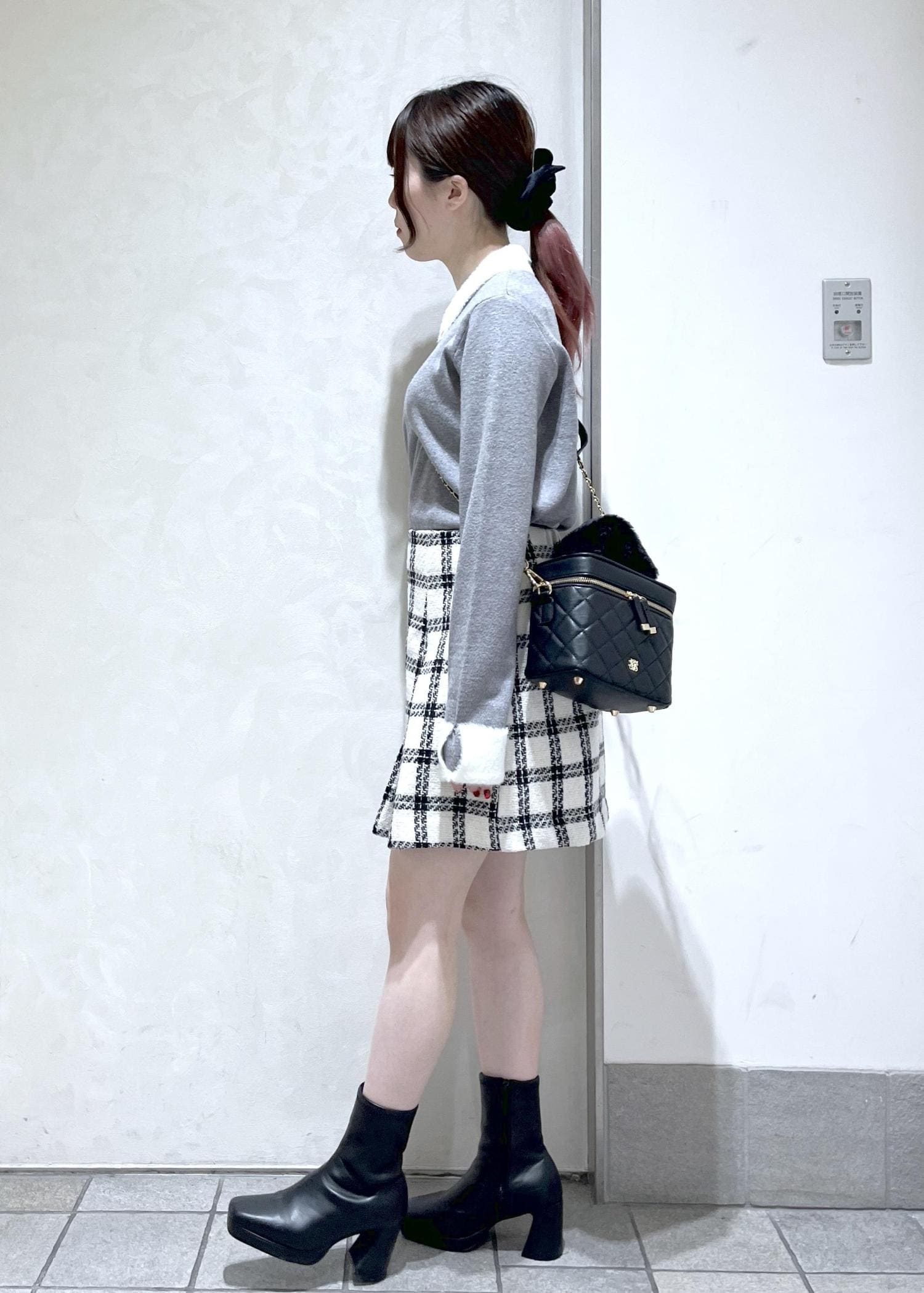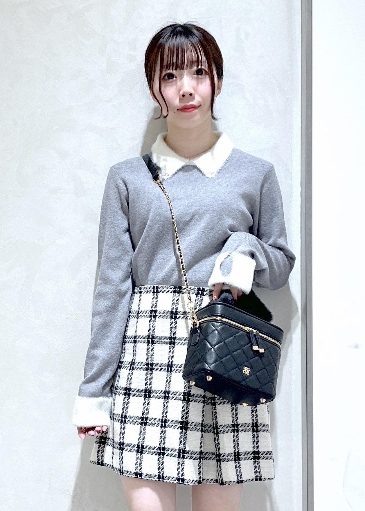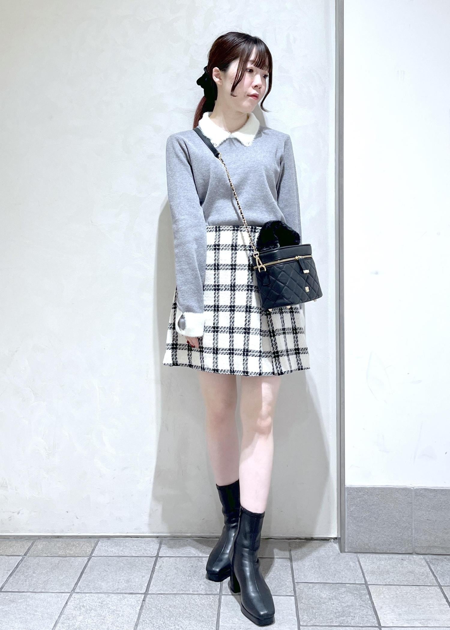 ふわふわのビジューがついたグレーのニットにミニスカート合わせでデートコーデを組んでみました!