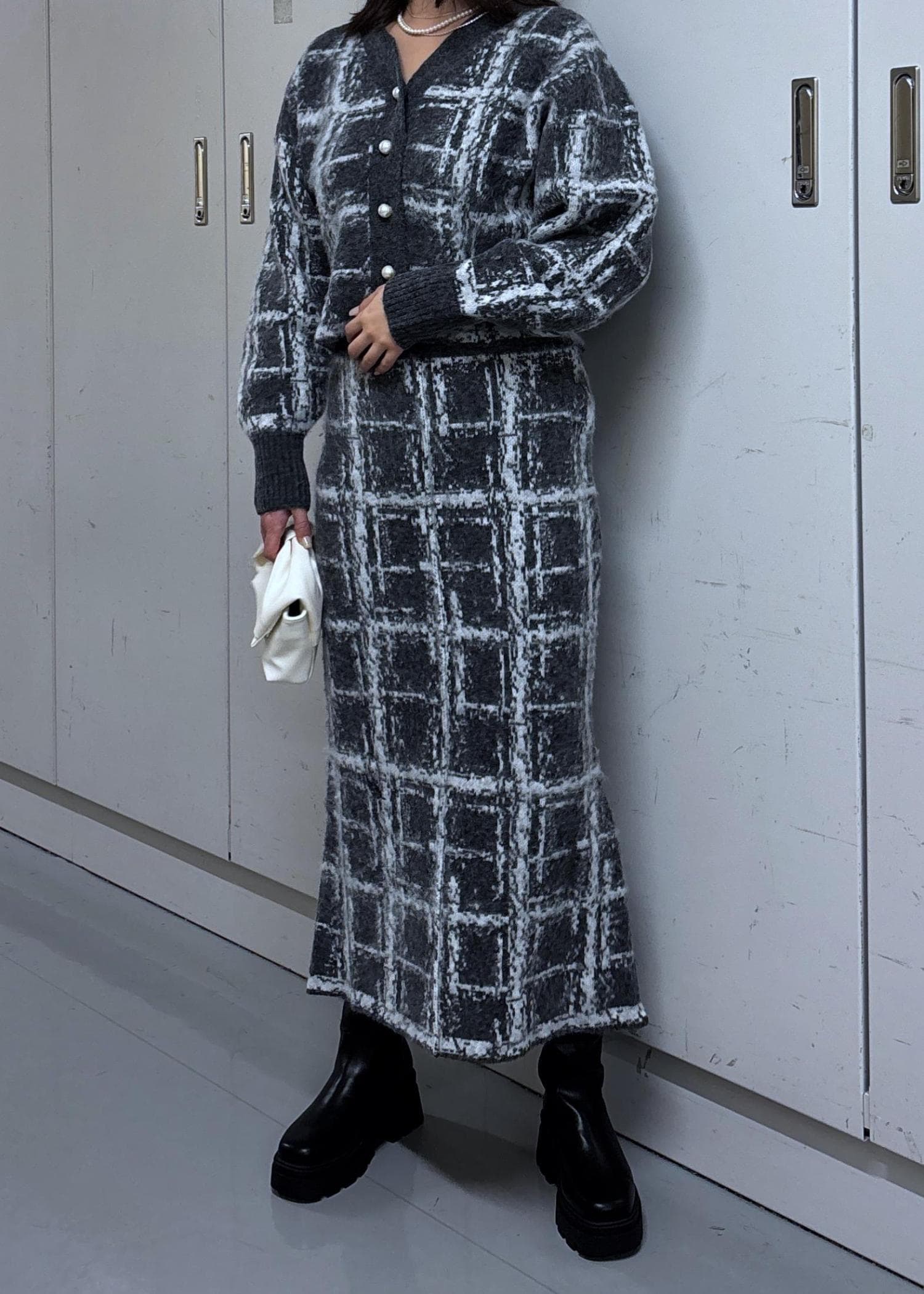 VISチェックアソートシャギーニットスカート/セットアップ対応グレー / F¥6,589レビュー丈長めなので、スニーカー合わせでもバランス良いです。ウエストはかなりぴったりですが、軽いので締め付け感なく着れました。