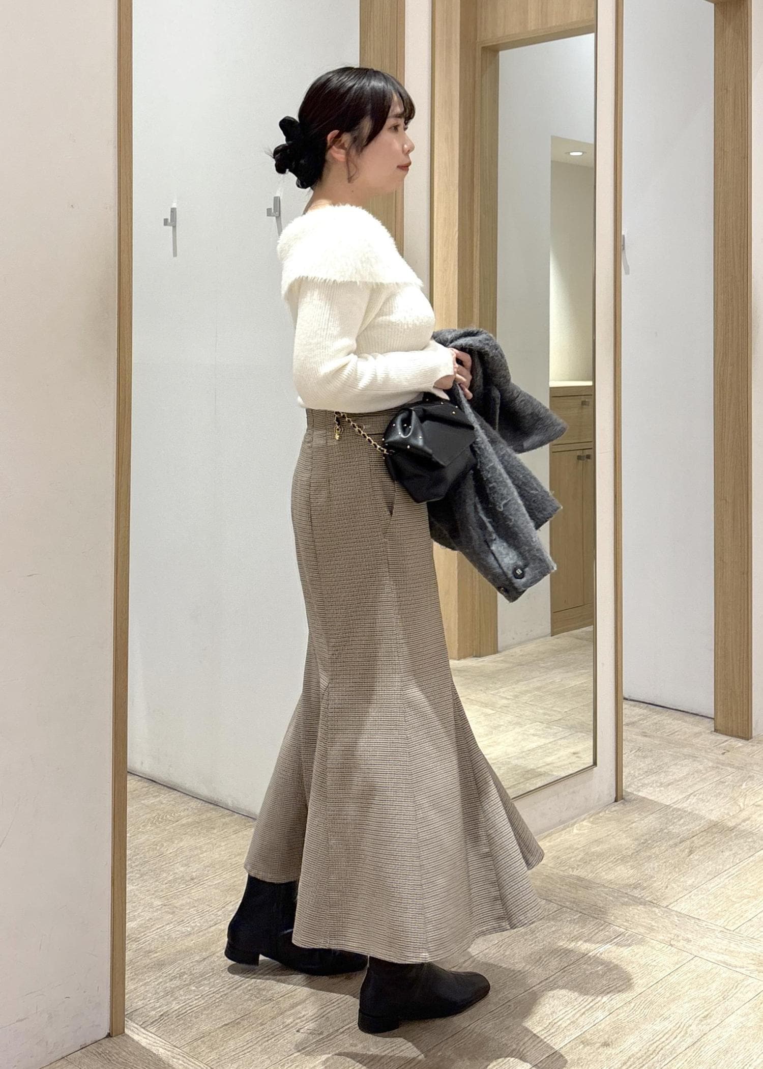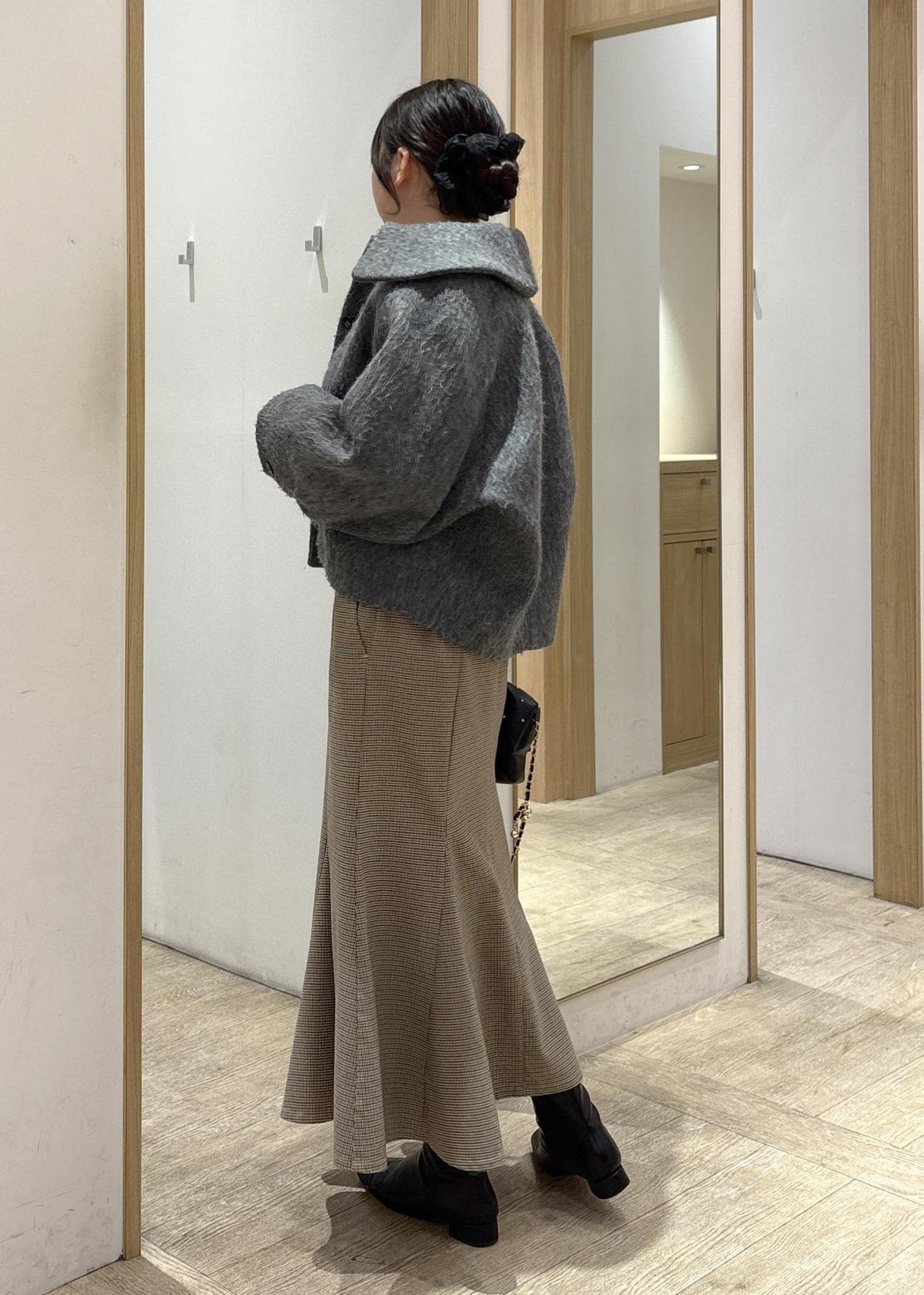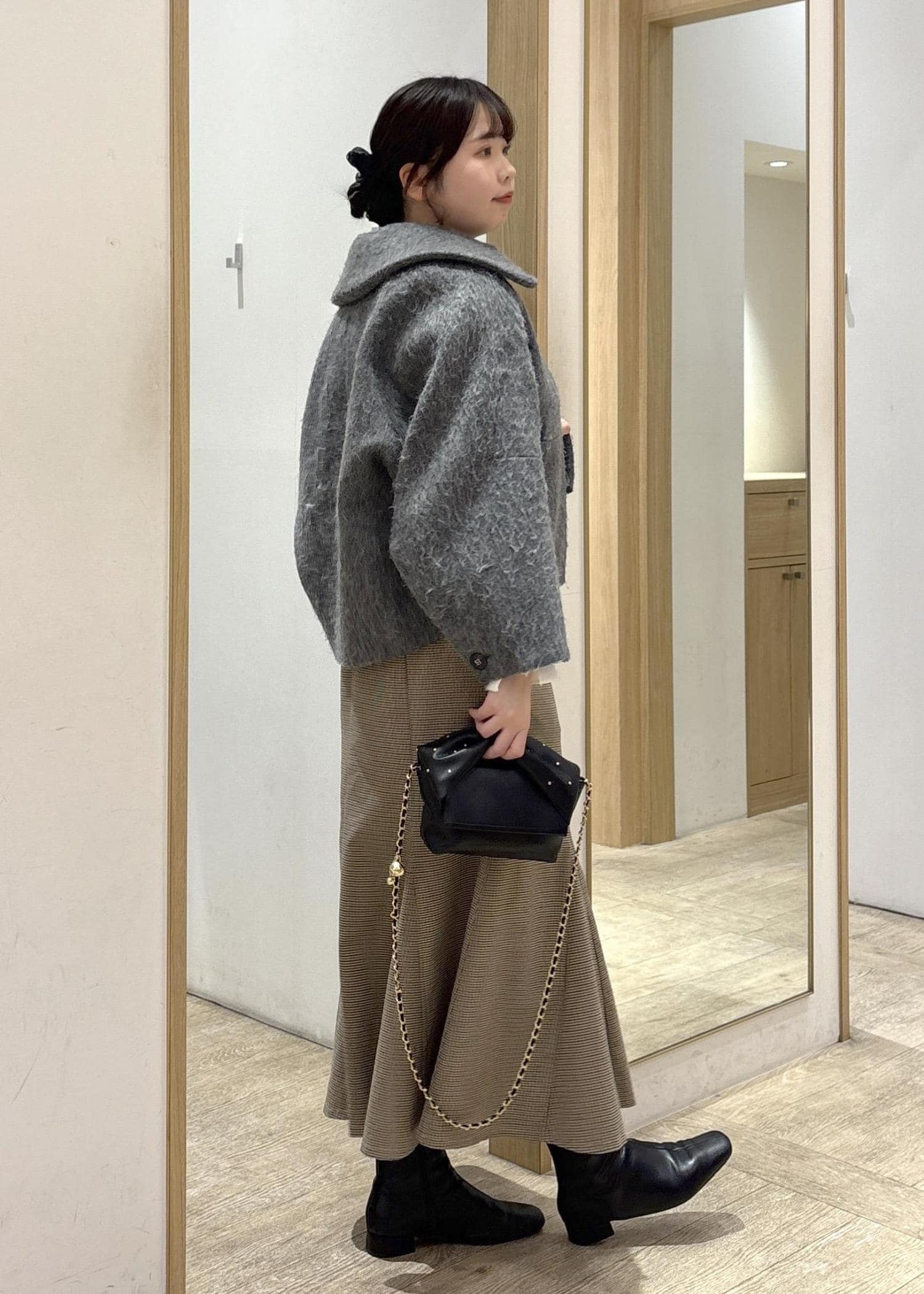 起毛素材のアウターとマーメイドスカートを合わせた、季節感たっぷりのきれいめカジュアルコーデです♪