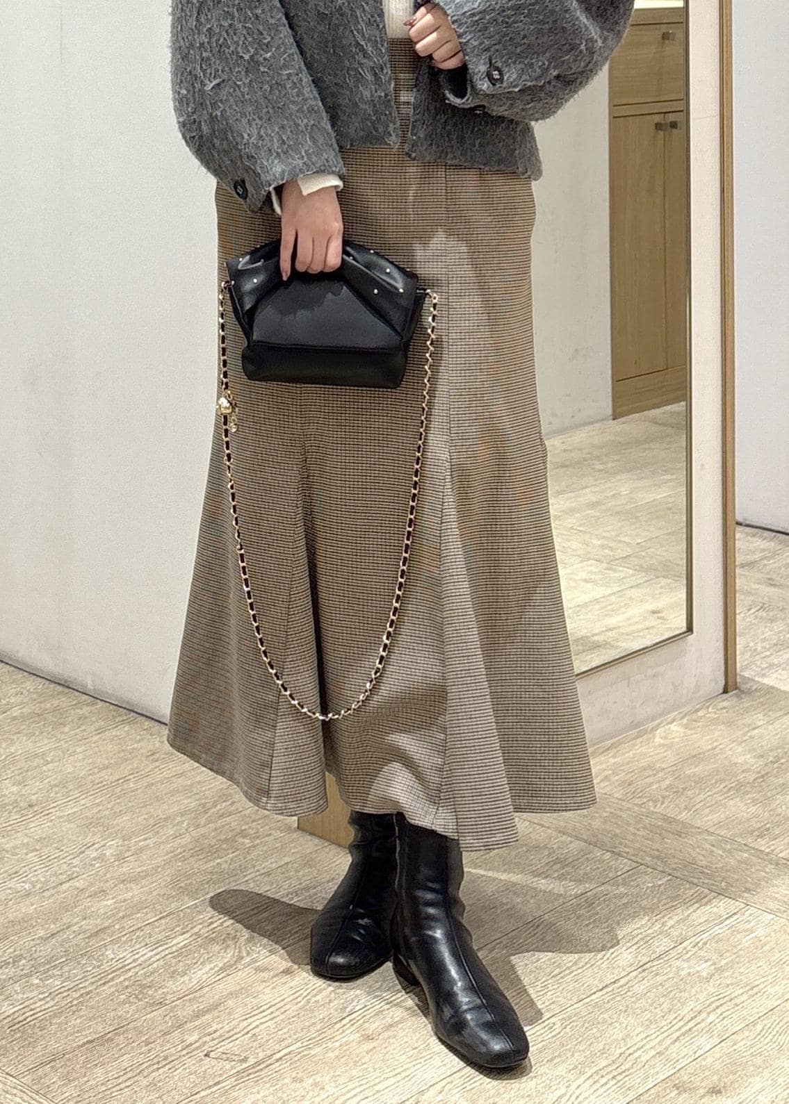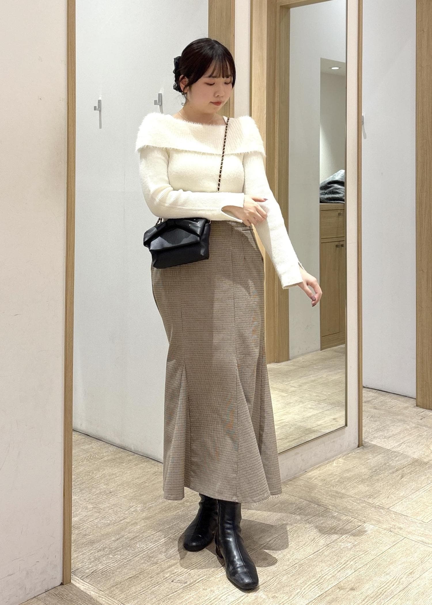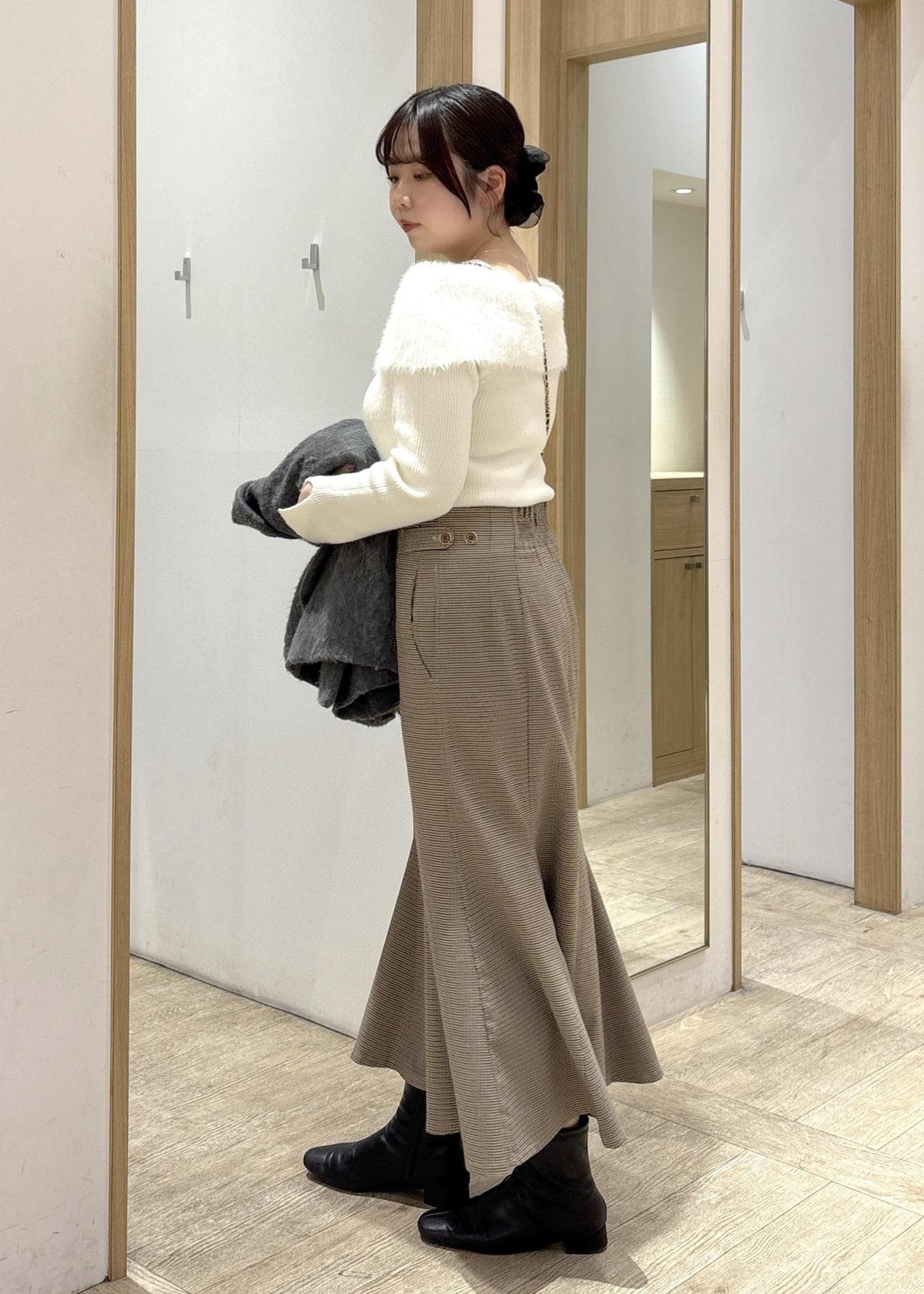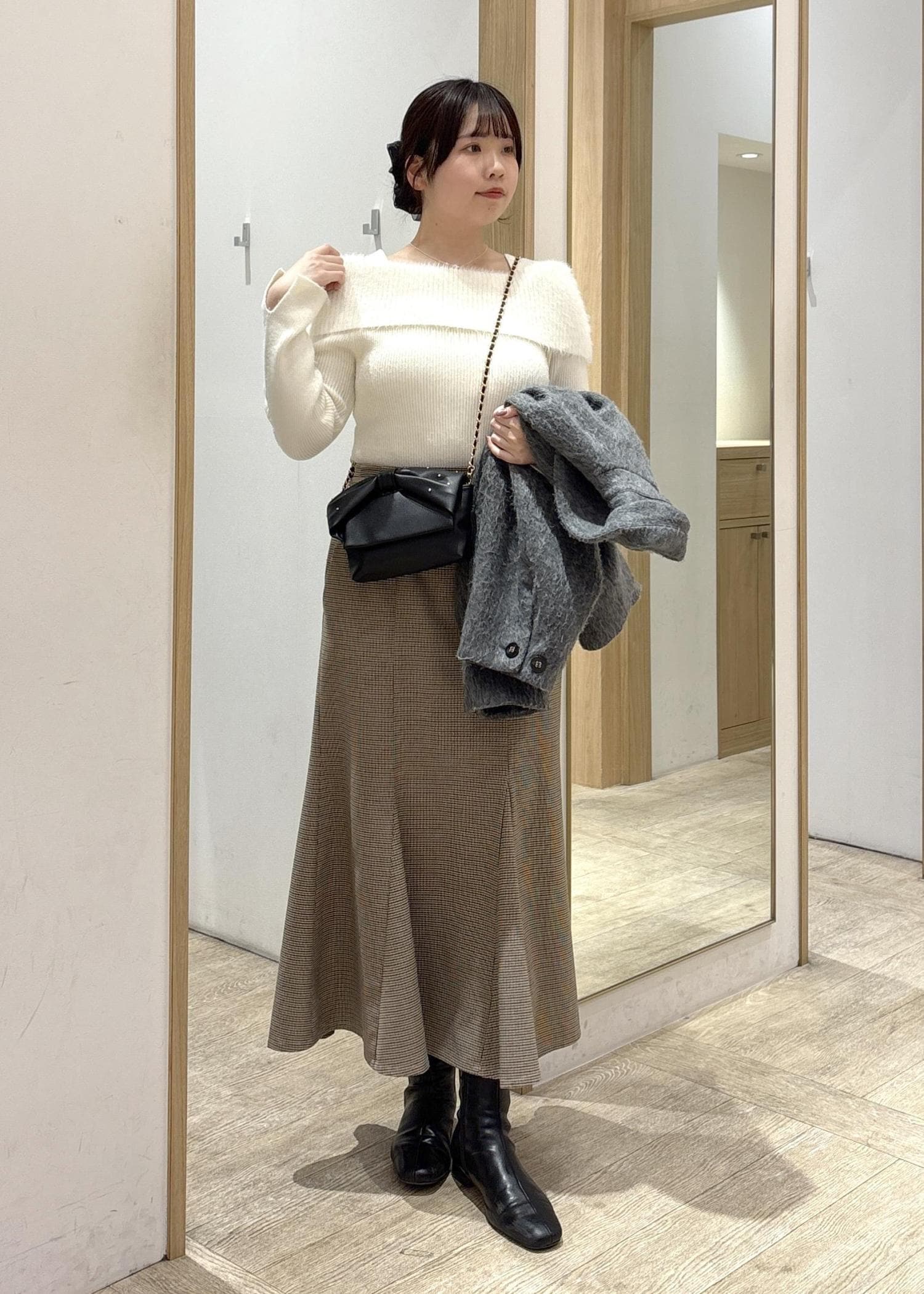 起毛素材のアウターとマーメイドスカートを合わせた、季節感たっぷりのきれいめカジュアルコーデです♪
