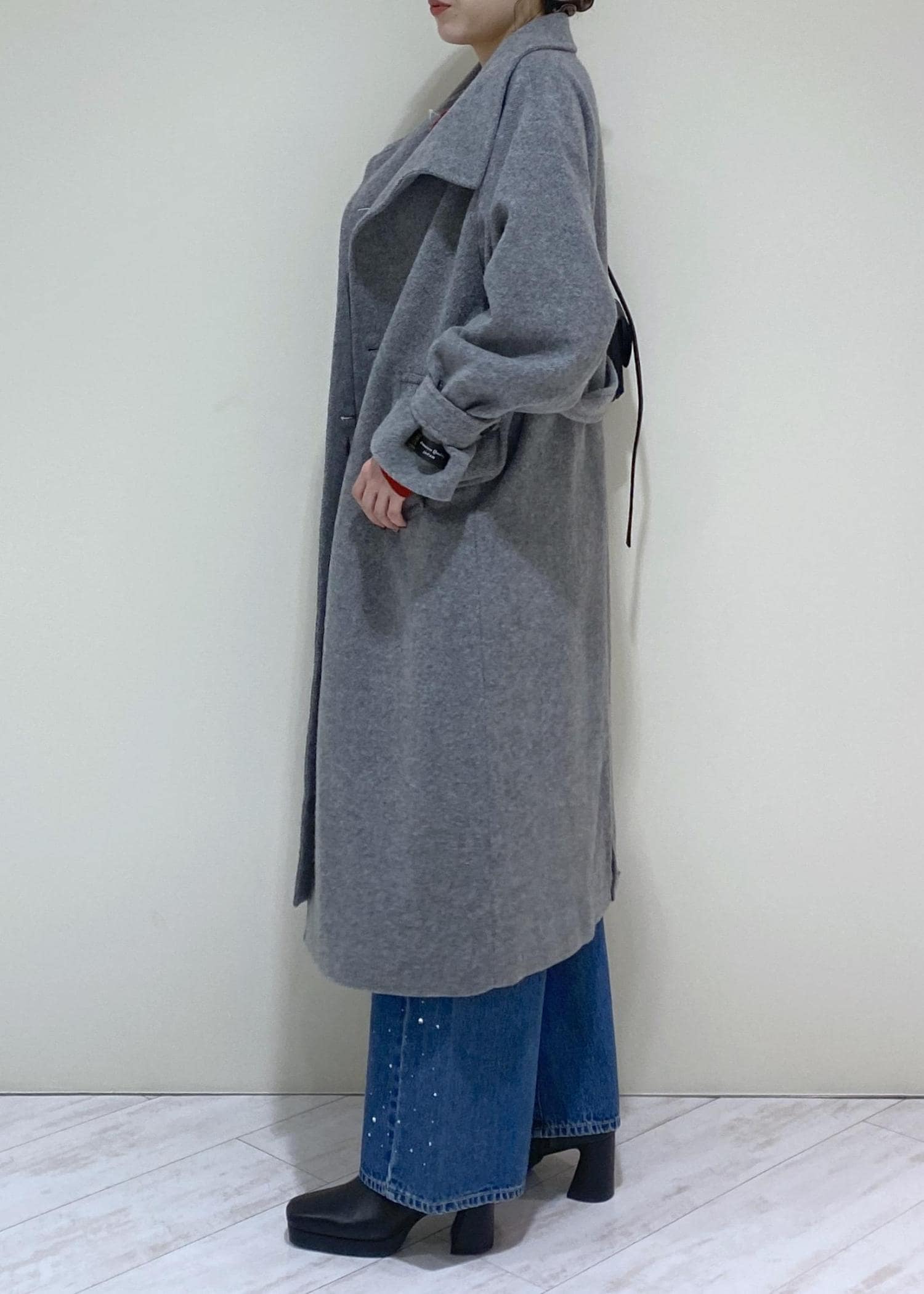 スタンドカラーにしたり、袖を絞ったり、ウエストの紐の縛り方で色んな着こなしが楽しめるのでスタメン間違いなしのコートです。 -