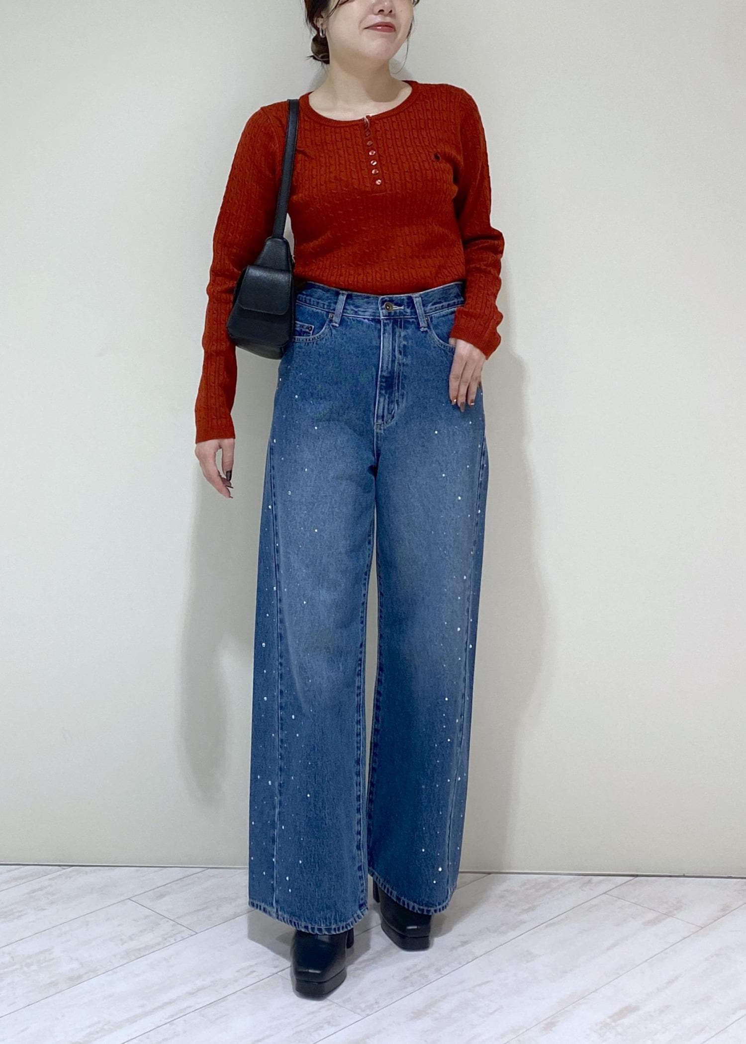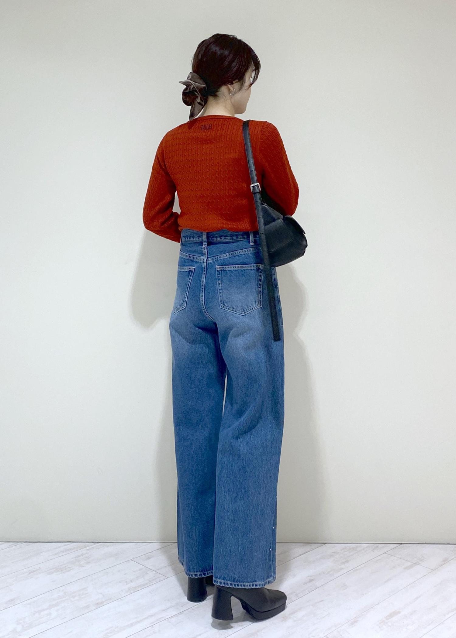 ウエストは薄手のトップスだと少しゆとりがある感じで、中肉厚なニットと合わせてぴったり履けそうという感じでした。