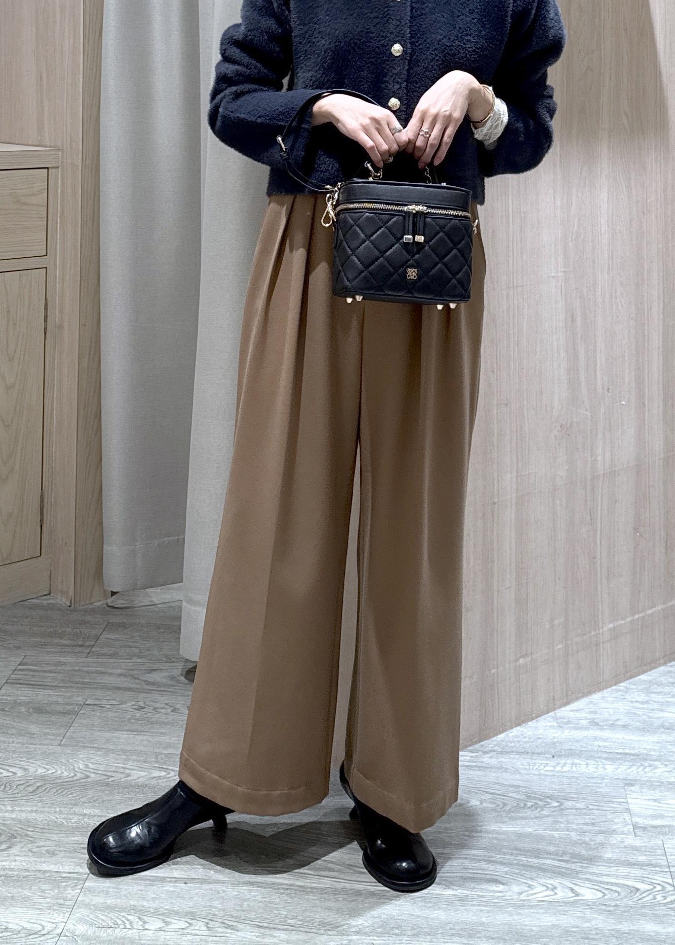 2タックで裾に向かって緩やかに広がるワイドパンツで足を長く見せてくれます!ストレッチが入っているので立ったり座ったりが楽でシワにもなりにくいです!