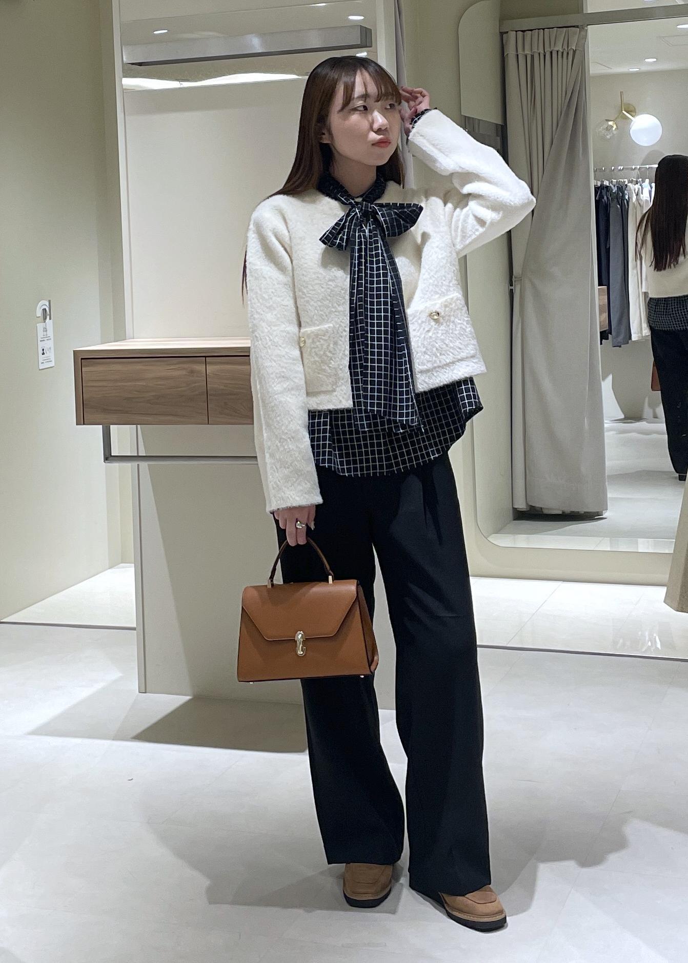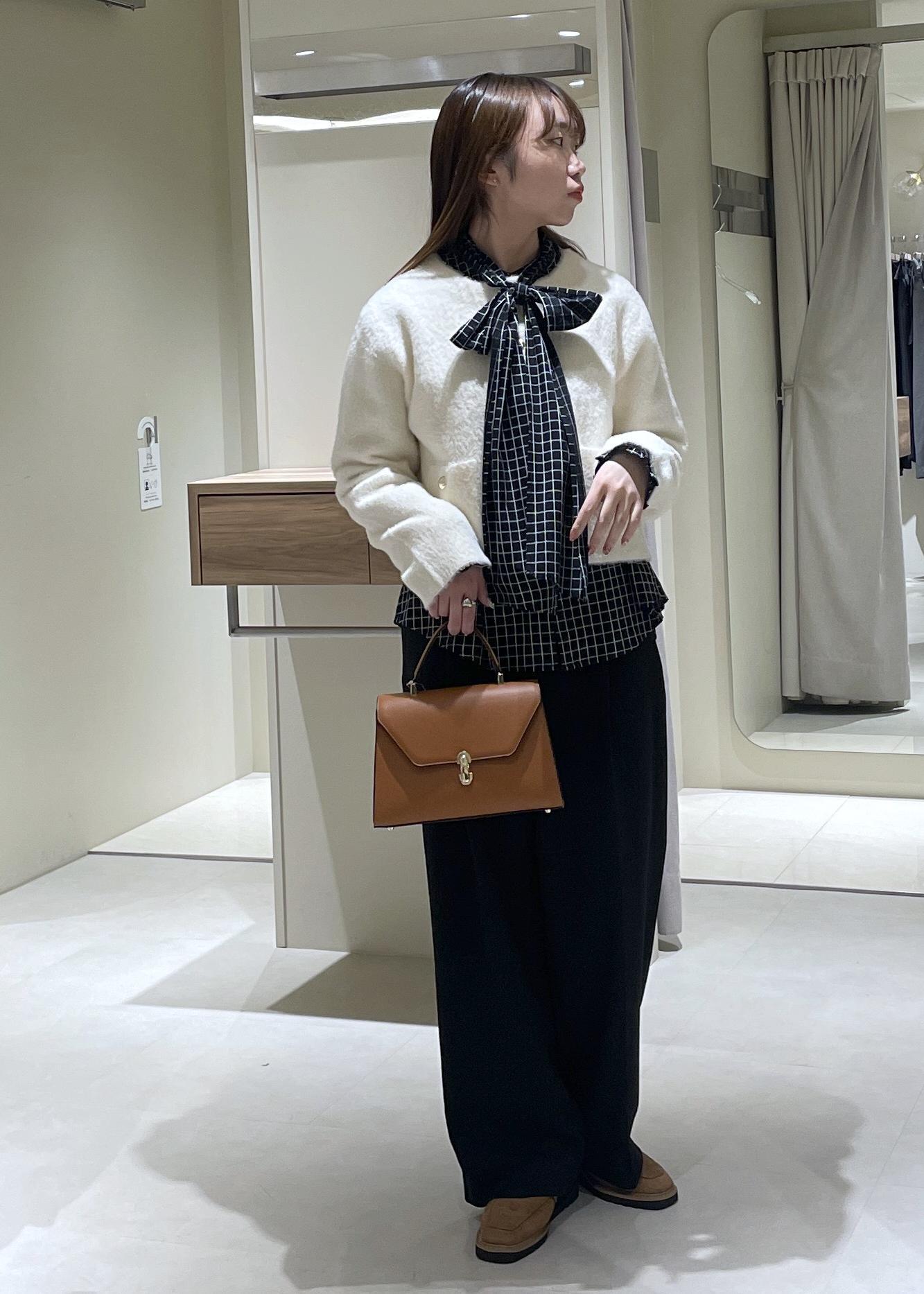 ボウタイ付きブラウスにフェザーカーディガンを合わせたキレイめコーデです。無地ではなく柄物のシャツを合わせることでワンポイントになります。小物をブラウンで合わせて柔らかい雰囲気にしたのもポイントです。