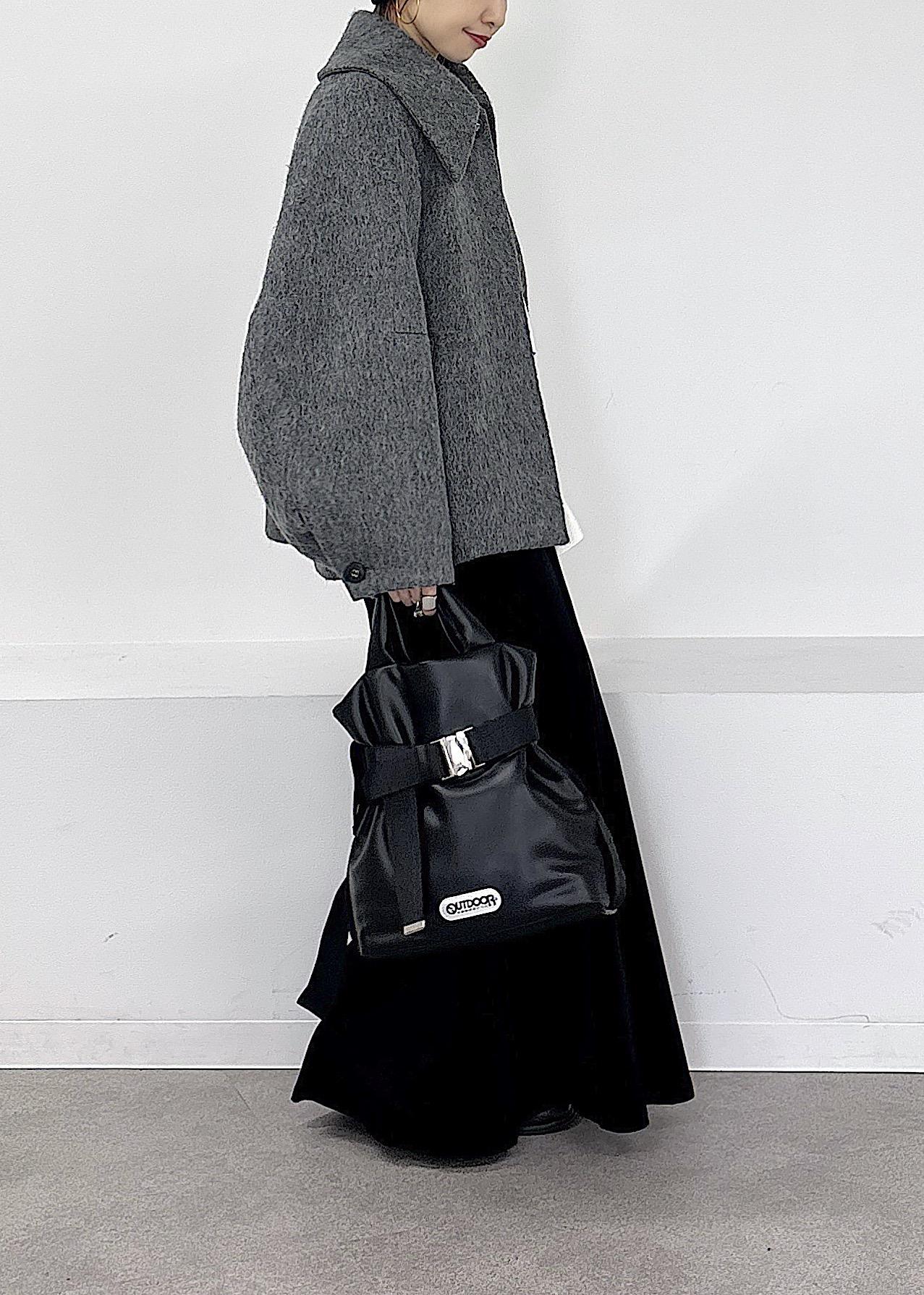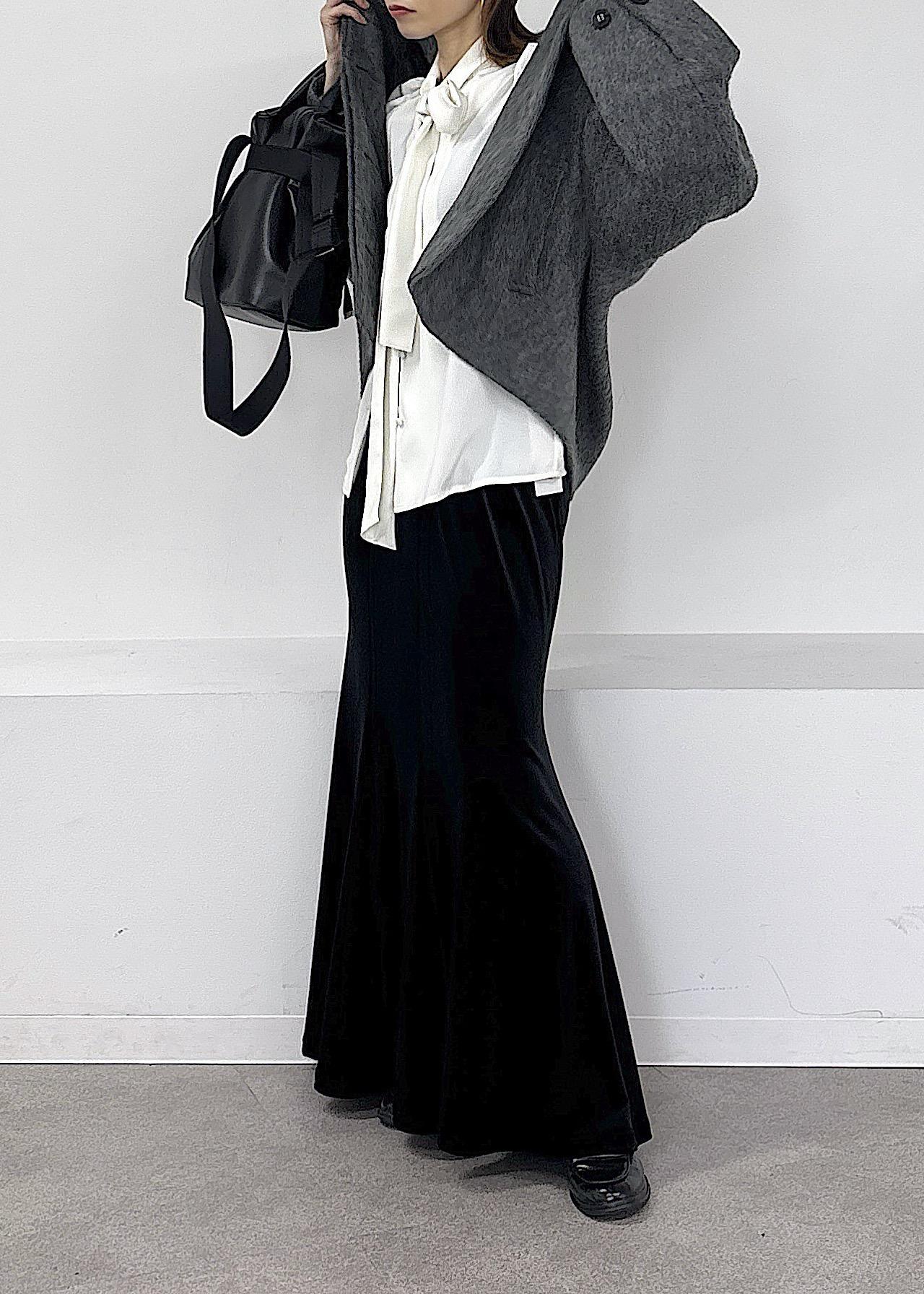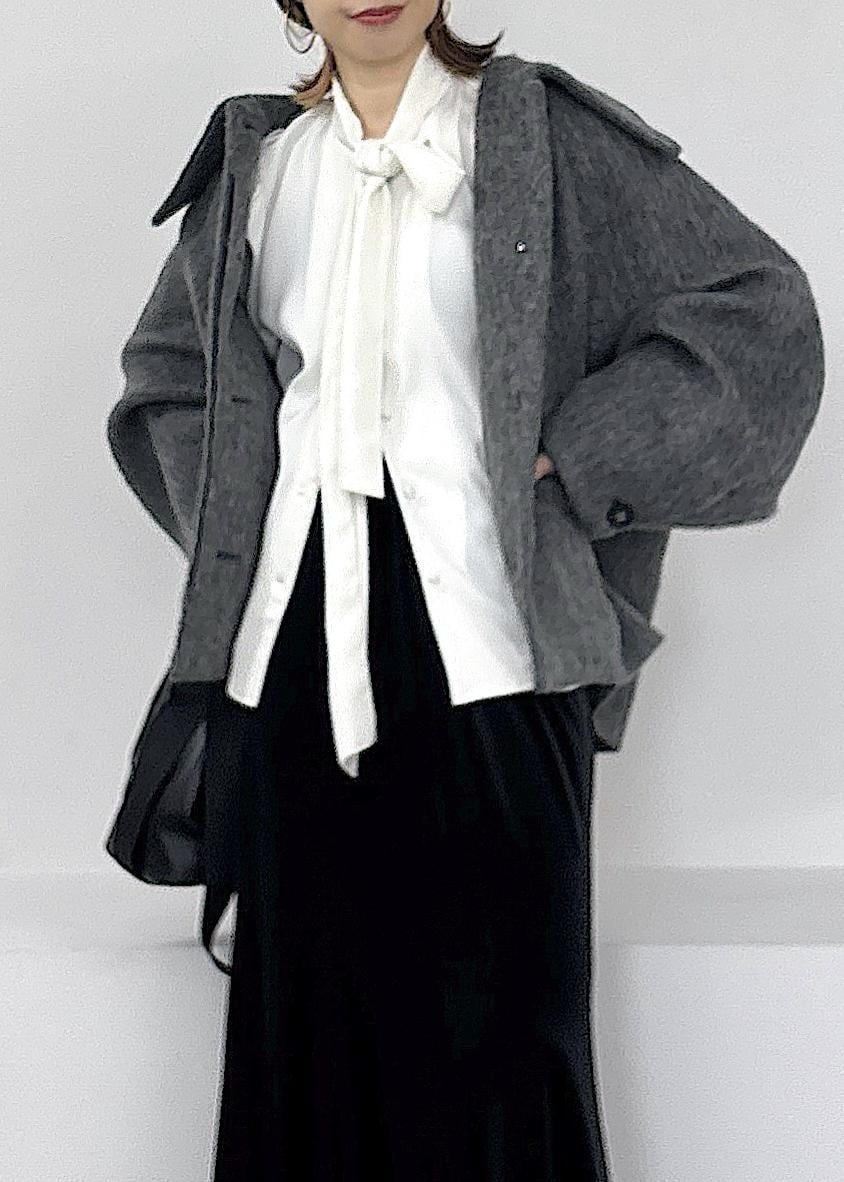 大人気のバックカラーショートコートをポイントに、サテンブラウスとベロアスカートと、今年らしいきれいめカジュアルスタイル♪モノトーンでもデザイン性のあるアイテムを合わせることで女性らしい印象に◎冬のお出かけにぴったりな大人カジュアルコーデ。