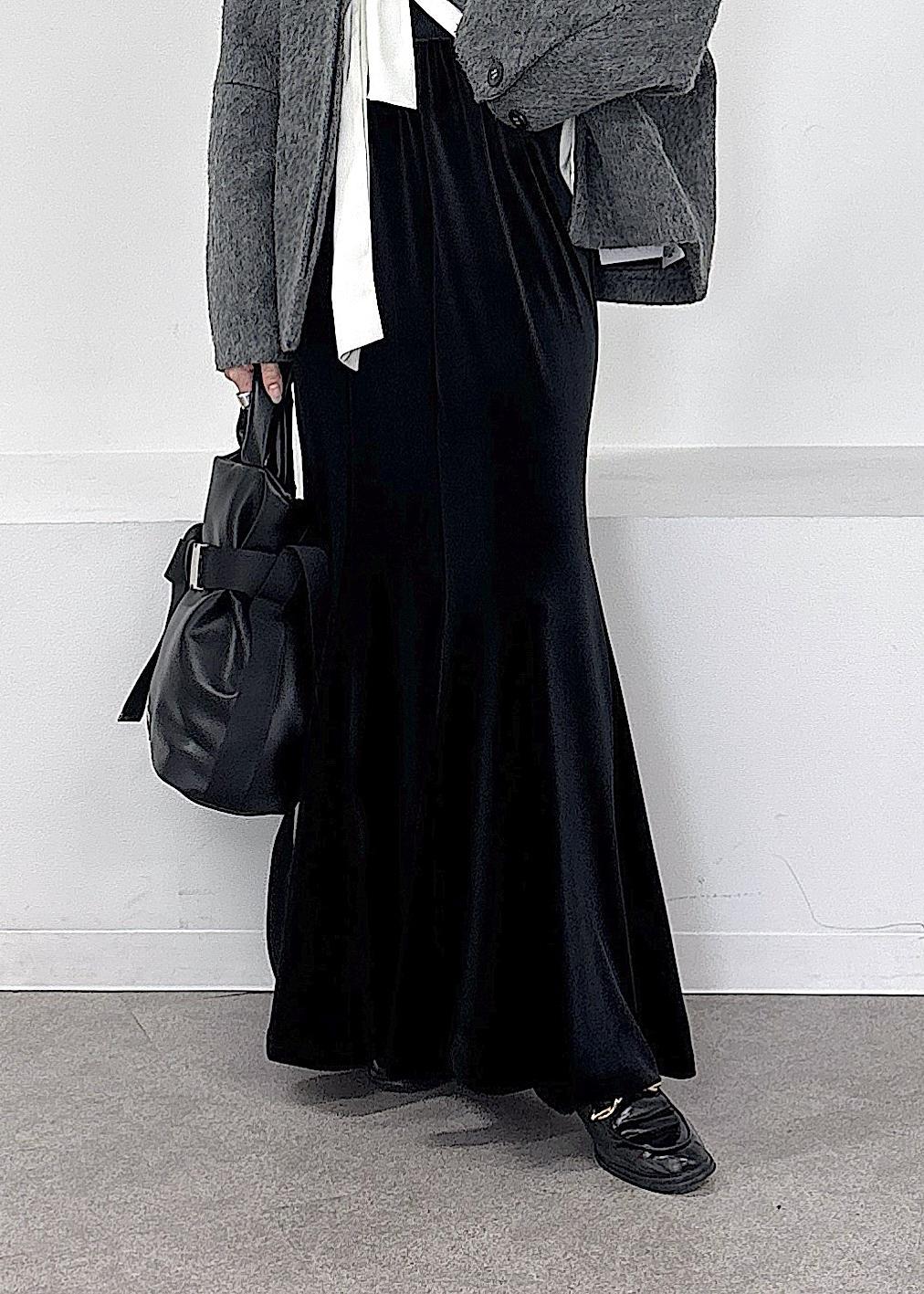 VISベロアナロースカートブラック / M¥6,589レビュー今年らしいベロア素材の大人可愛いスカート♪マーメイドシルエットでシルエットがとてもきれいです。ウエストはゴム仕様で、なんと内側に折ることができるので長さ調整が可能と低身長さんにも嬉しいポイント◎ベロアの落ち感が女性らしい一枚です。全体的にほどよくフィット、Mサイズ着用で着丈は今回2つ折り、足首がしっかり見える長さでした。