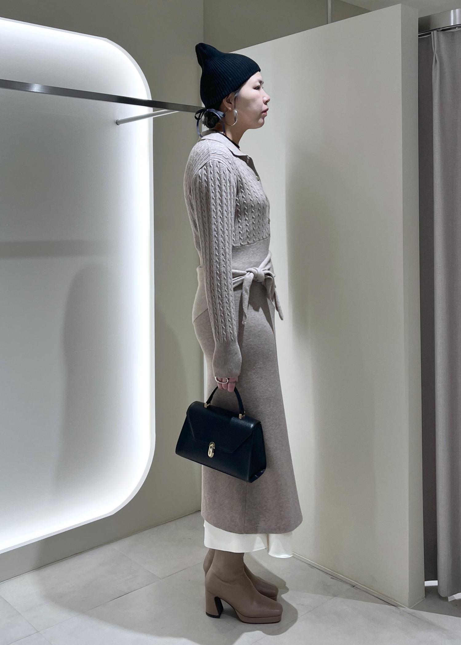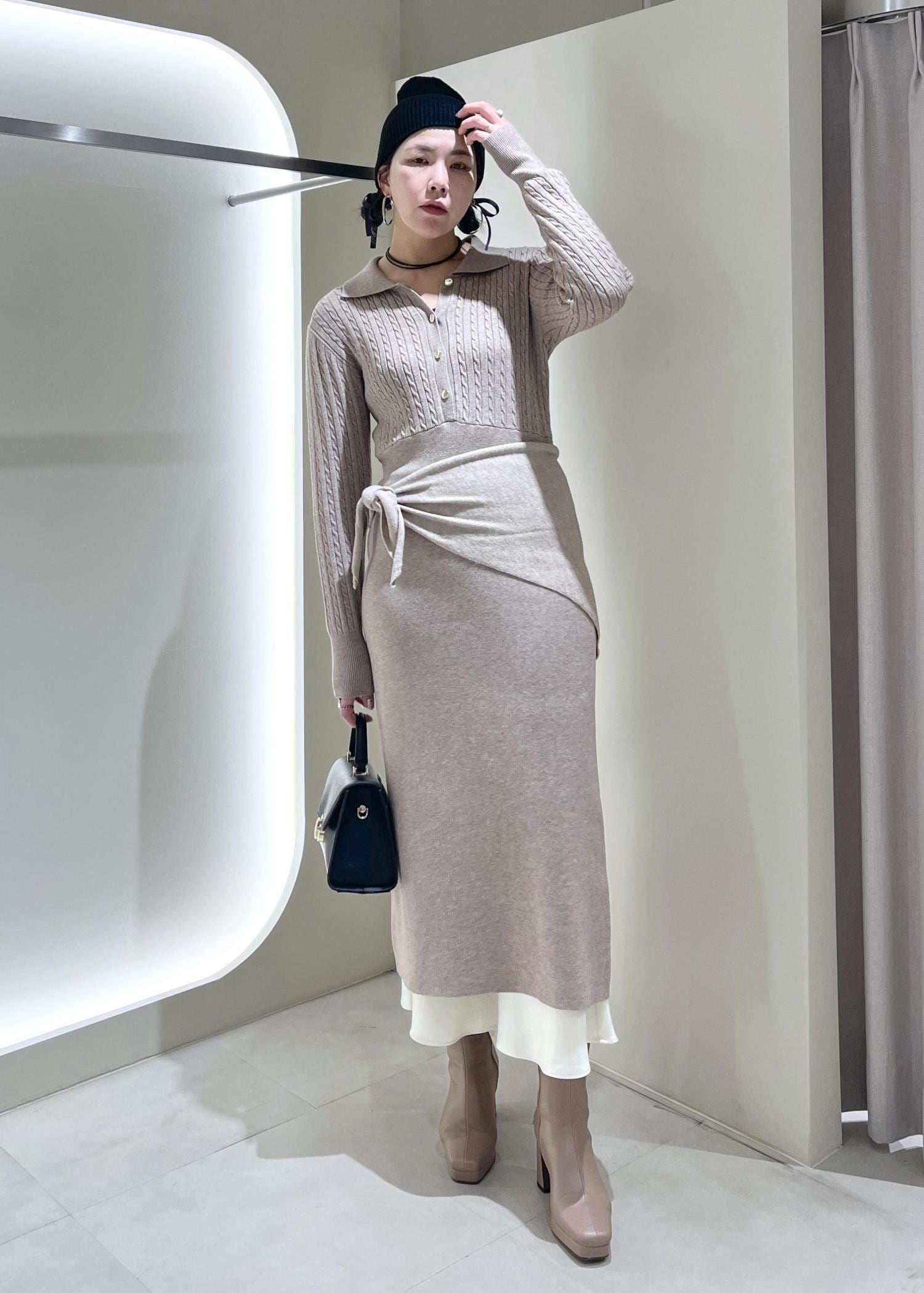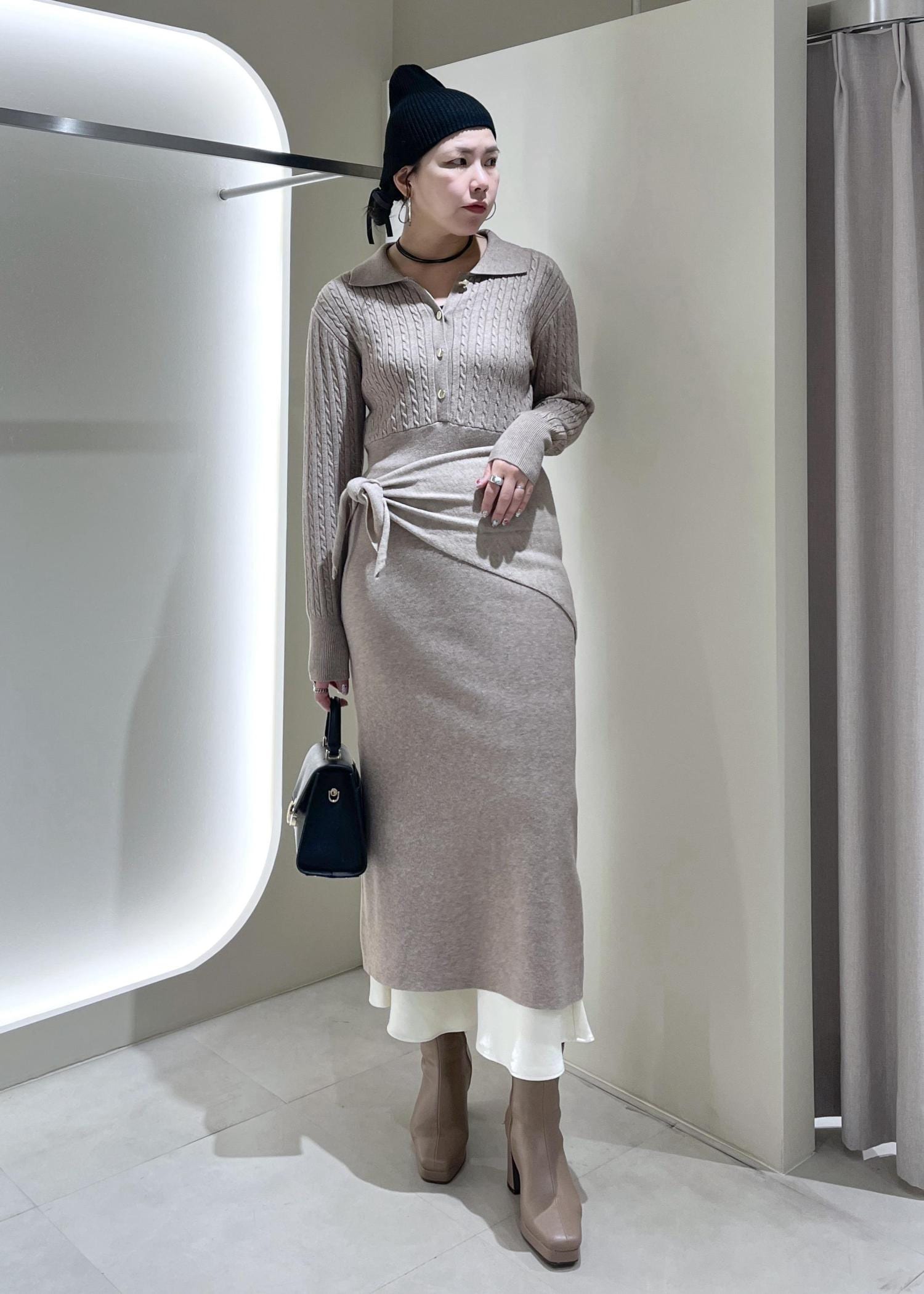 VISポロケーブルモチモチニットワンピースベージュ系 / F¥8,899レビューもちもちとした柔らかい素材感と程よい肉厚感で着やすいです!首元もボタンで開けられるので好みに合わせて抜け感を出すのも◎
