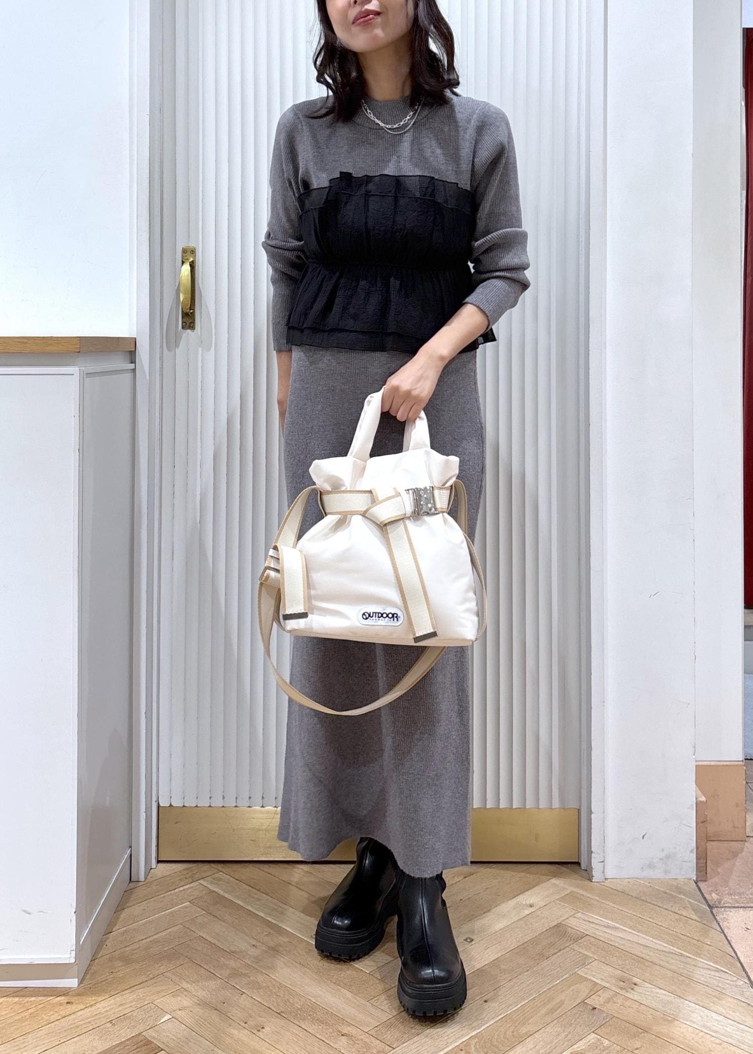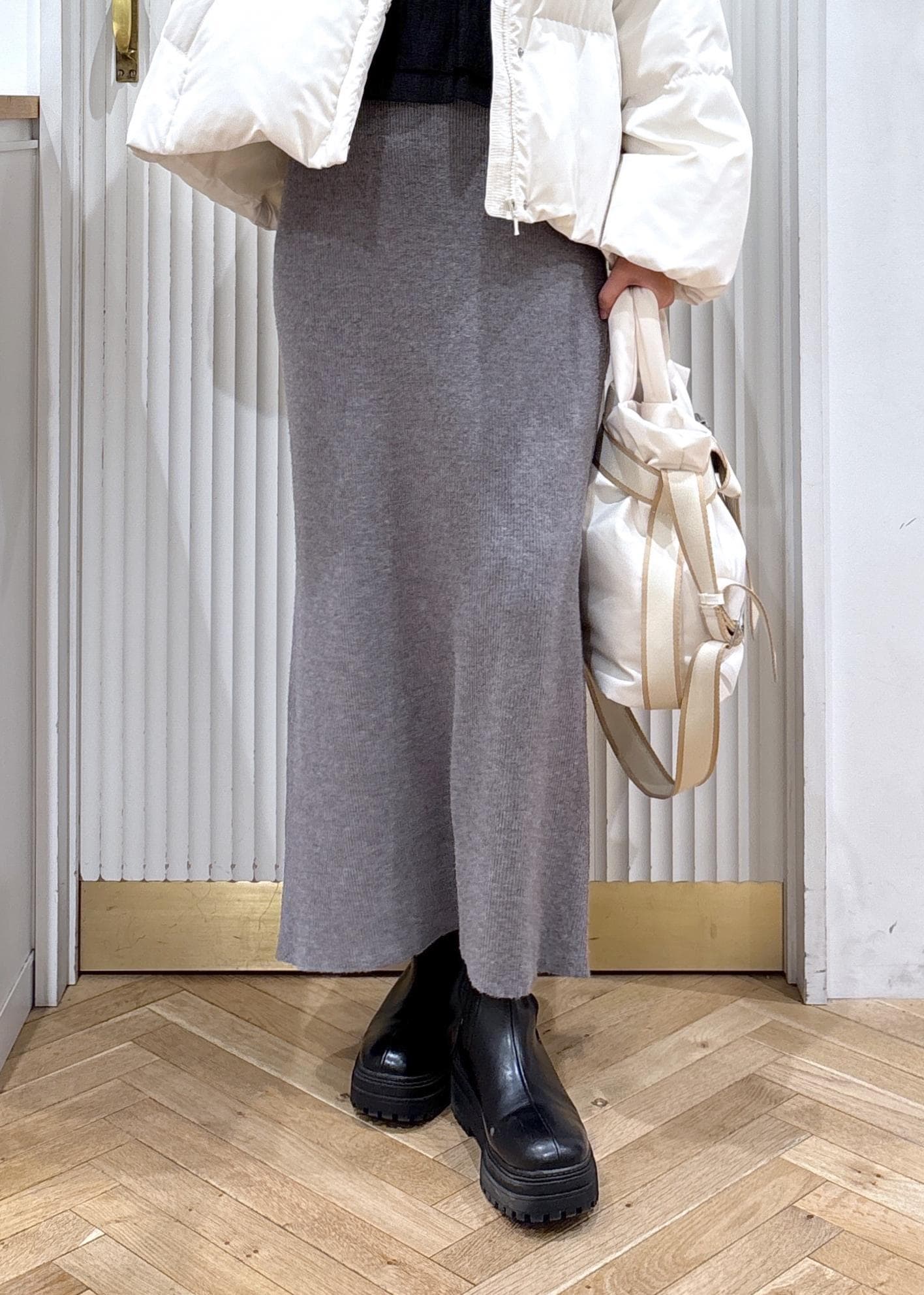 ビスチェドッキングのニットにスカートを合わせたセットアップスタイリングです。
