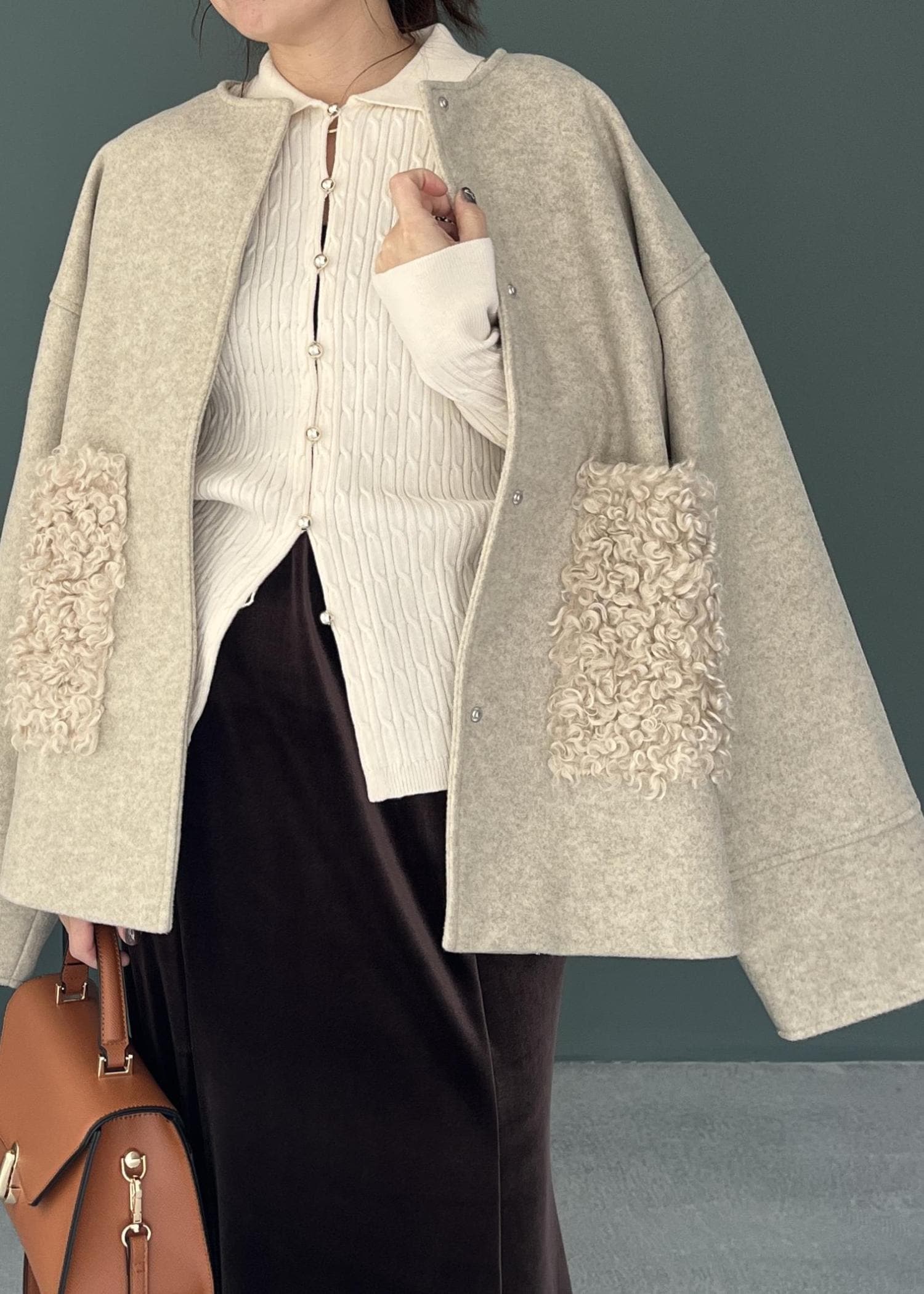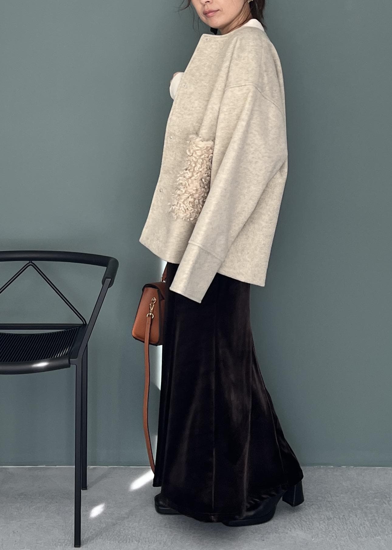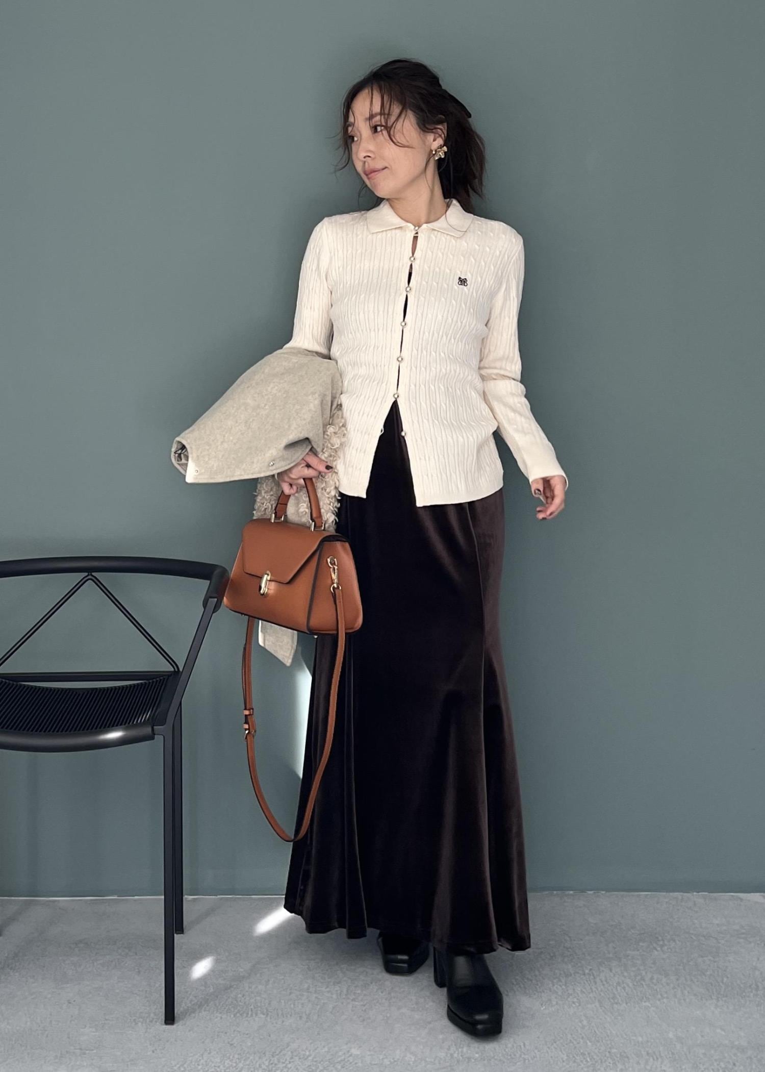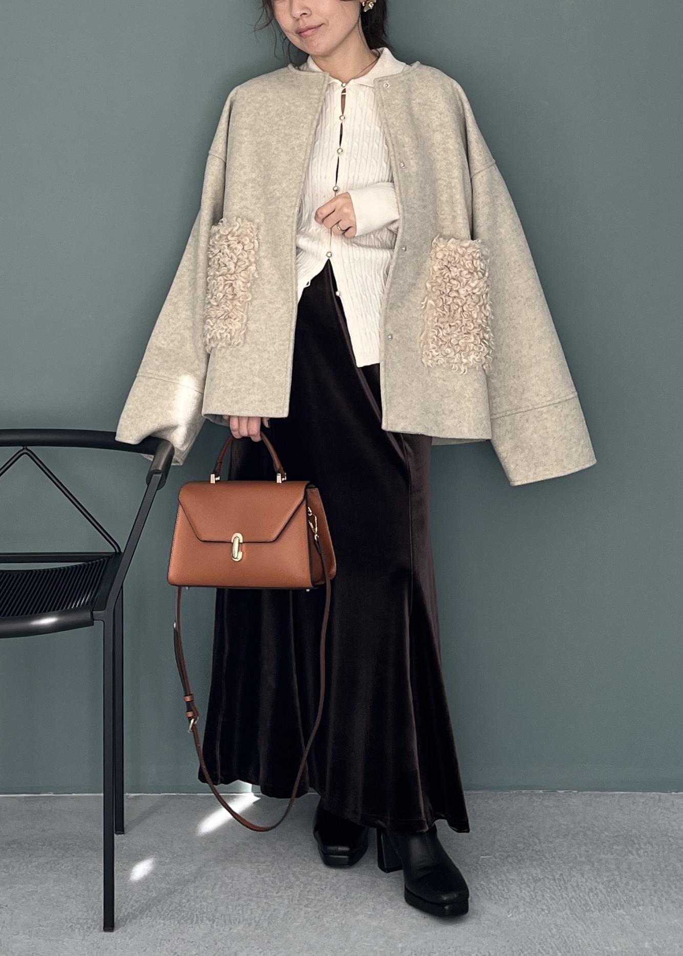 ウール調のコート、もこもこのファー、艶やかなスカート。 異なる質感を掛け合わせることで、同系色のトーンでも奥行きのあるお洒落な表情が生まれます。