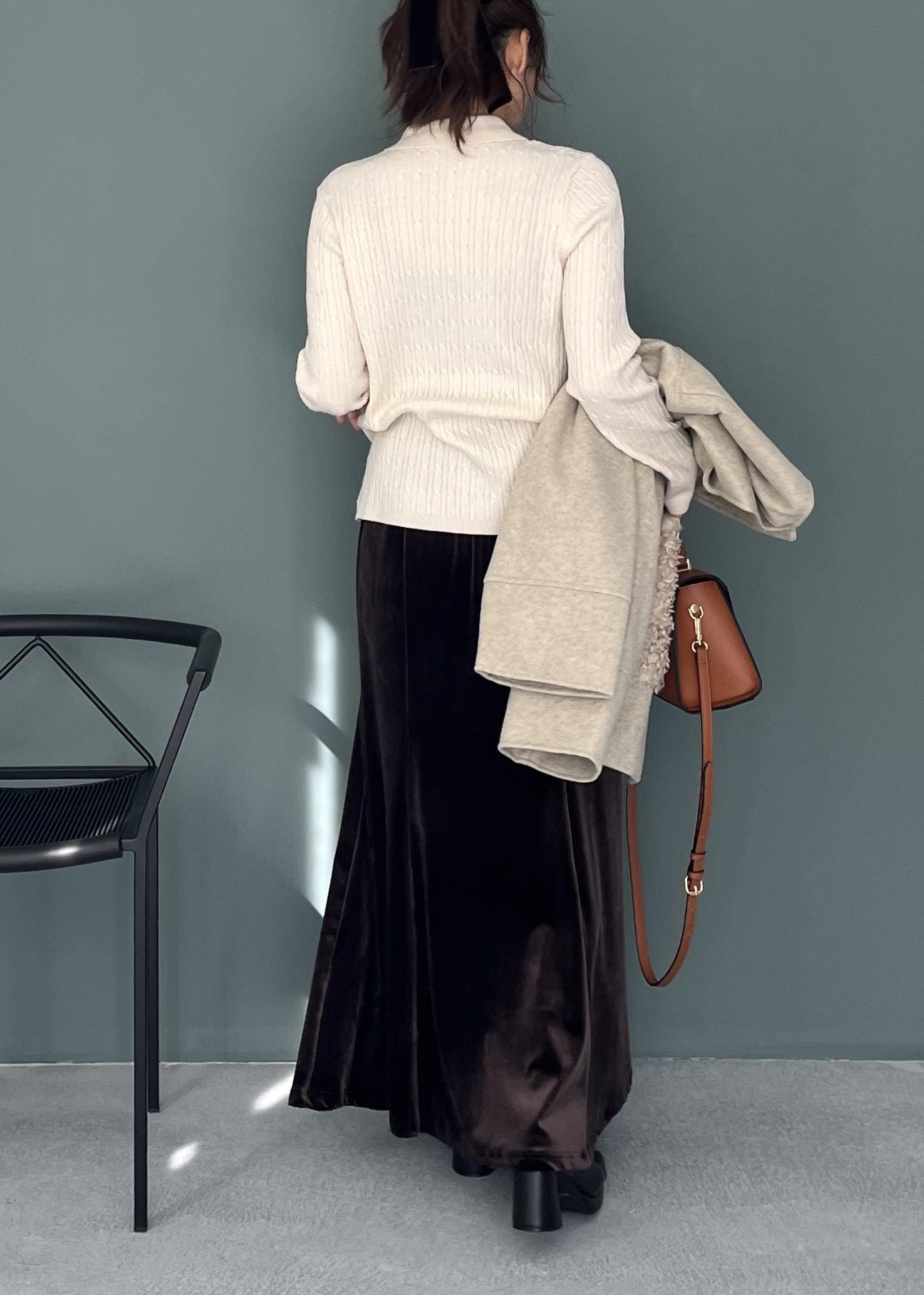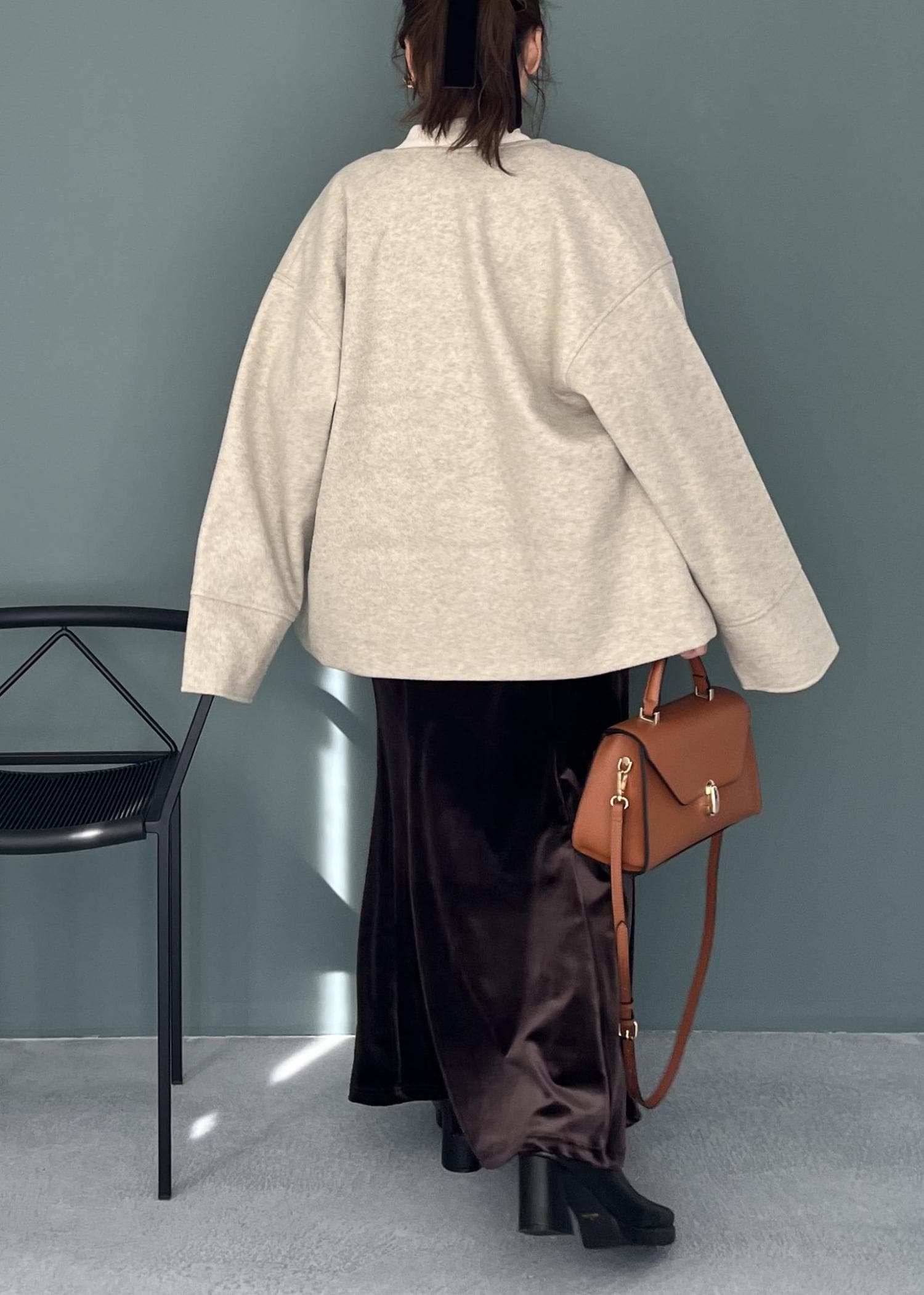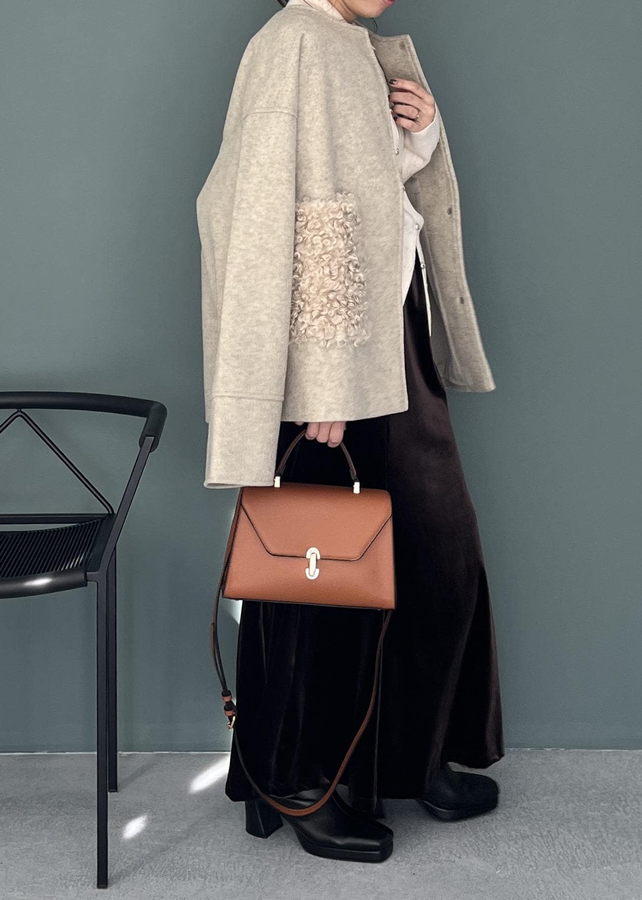 コートは肩の落ちたドロップショルダーなので、カチッとしすぎず程よいリラックス感を演出。 仕上げにキャメルカラーのバッグを投入して、全体にメリハリのあるアクセントをプラスしました。 「シンプルだけど、どこか違う」を叶える、周りと差がつくお出かけスタイルです。