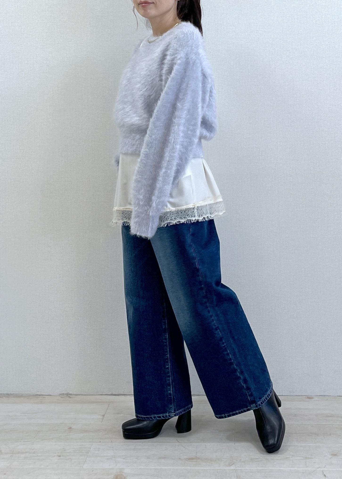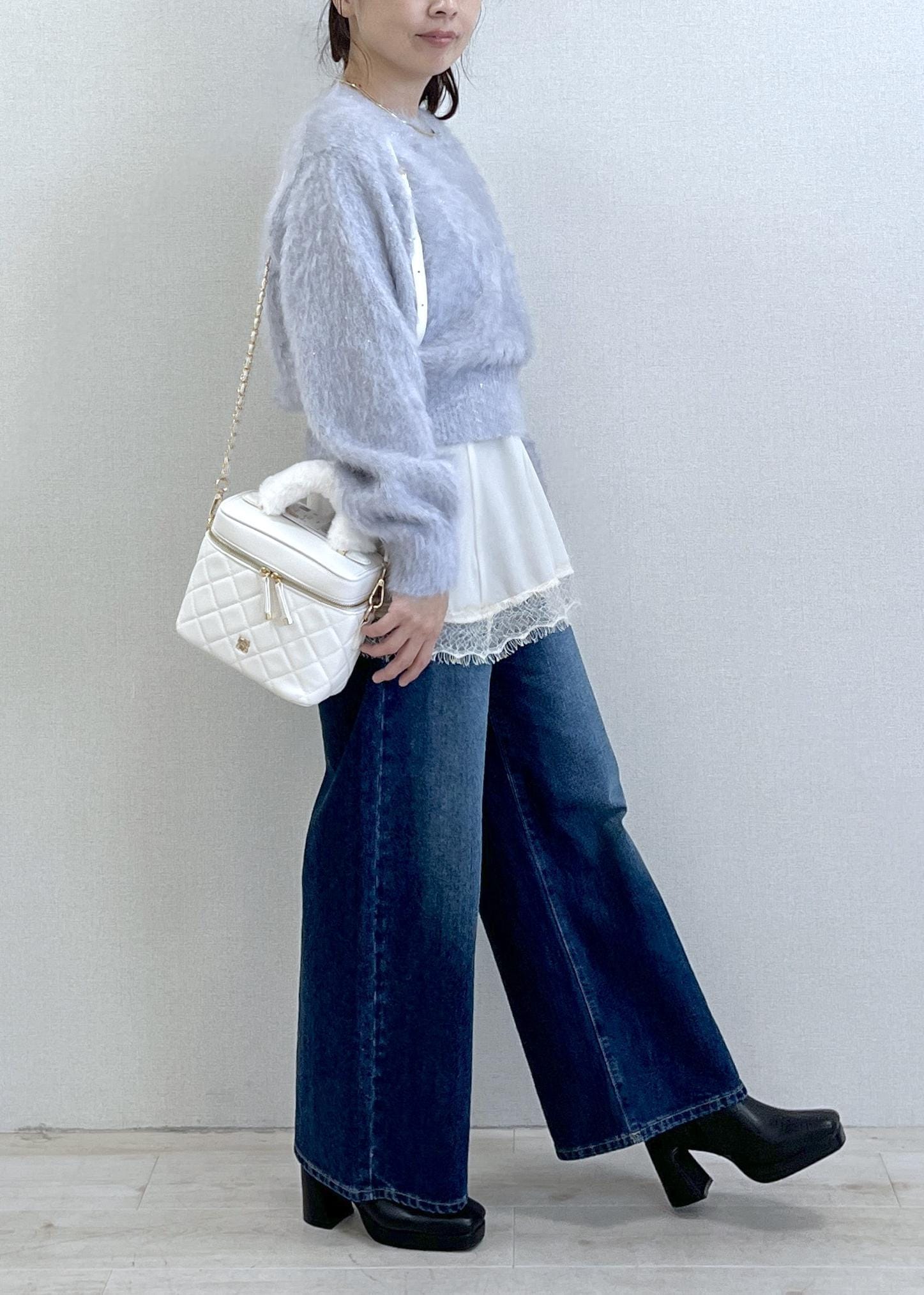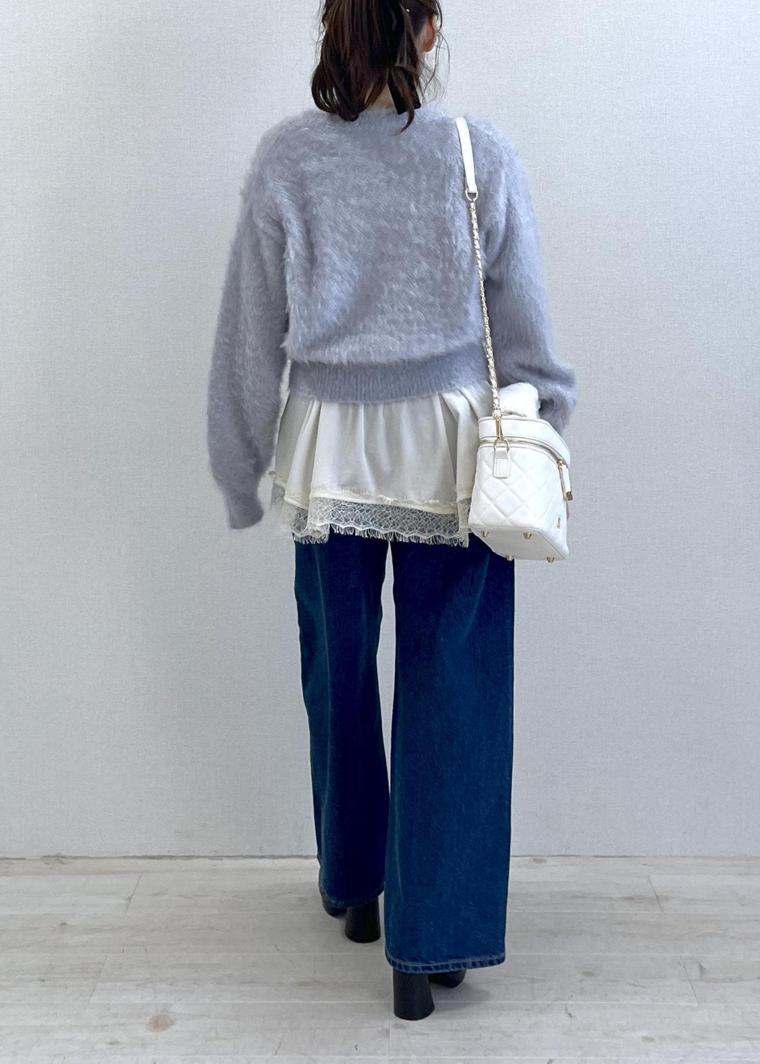 ダウンを脱いだ瞬間、思わず「可愛い!」と褒められること間違いなしのスタイリング。 今季トレンドのグレーのフェザーニットは、毛足の長いふわふわ感が女性らしさを引き立てます。