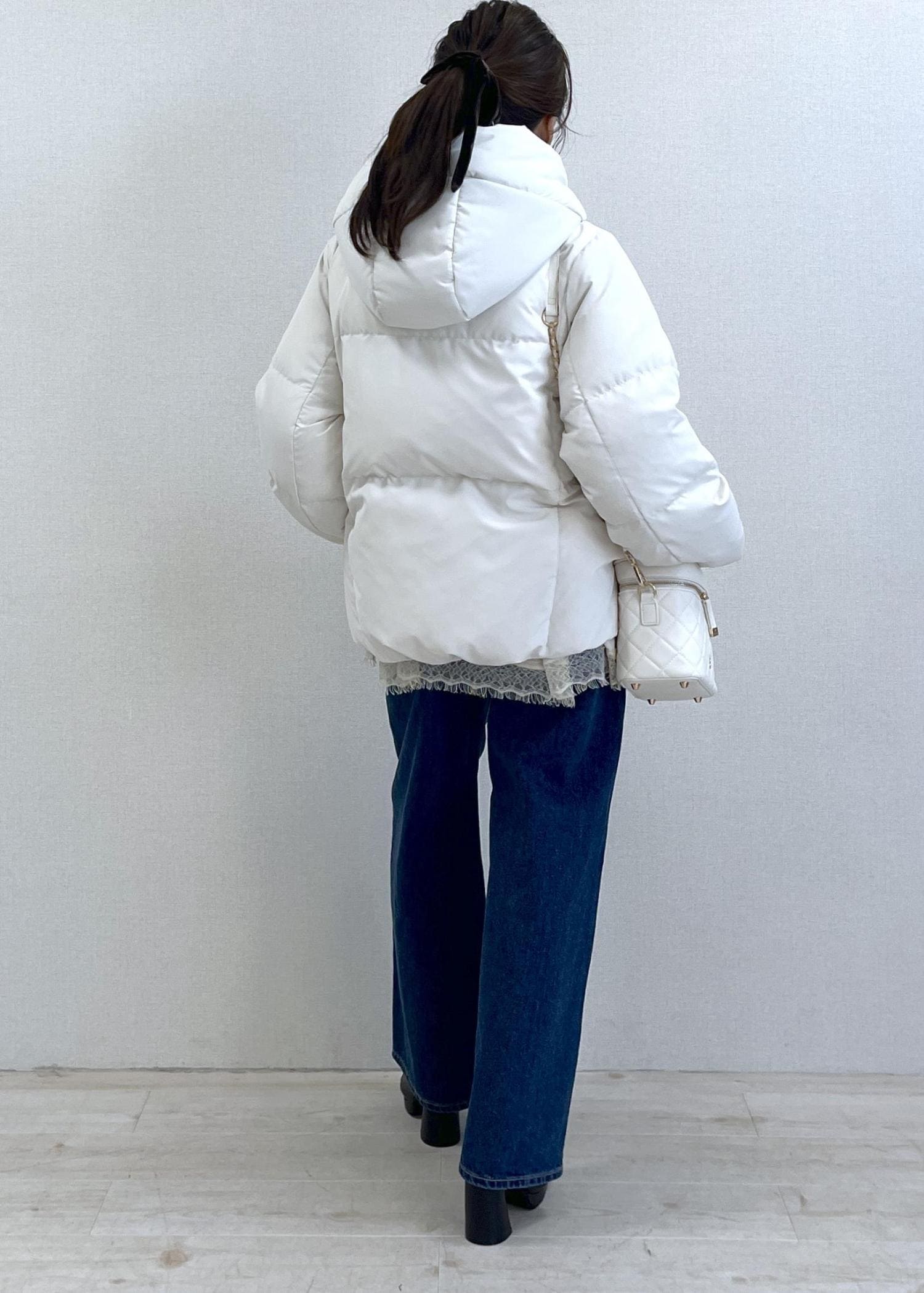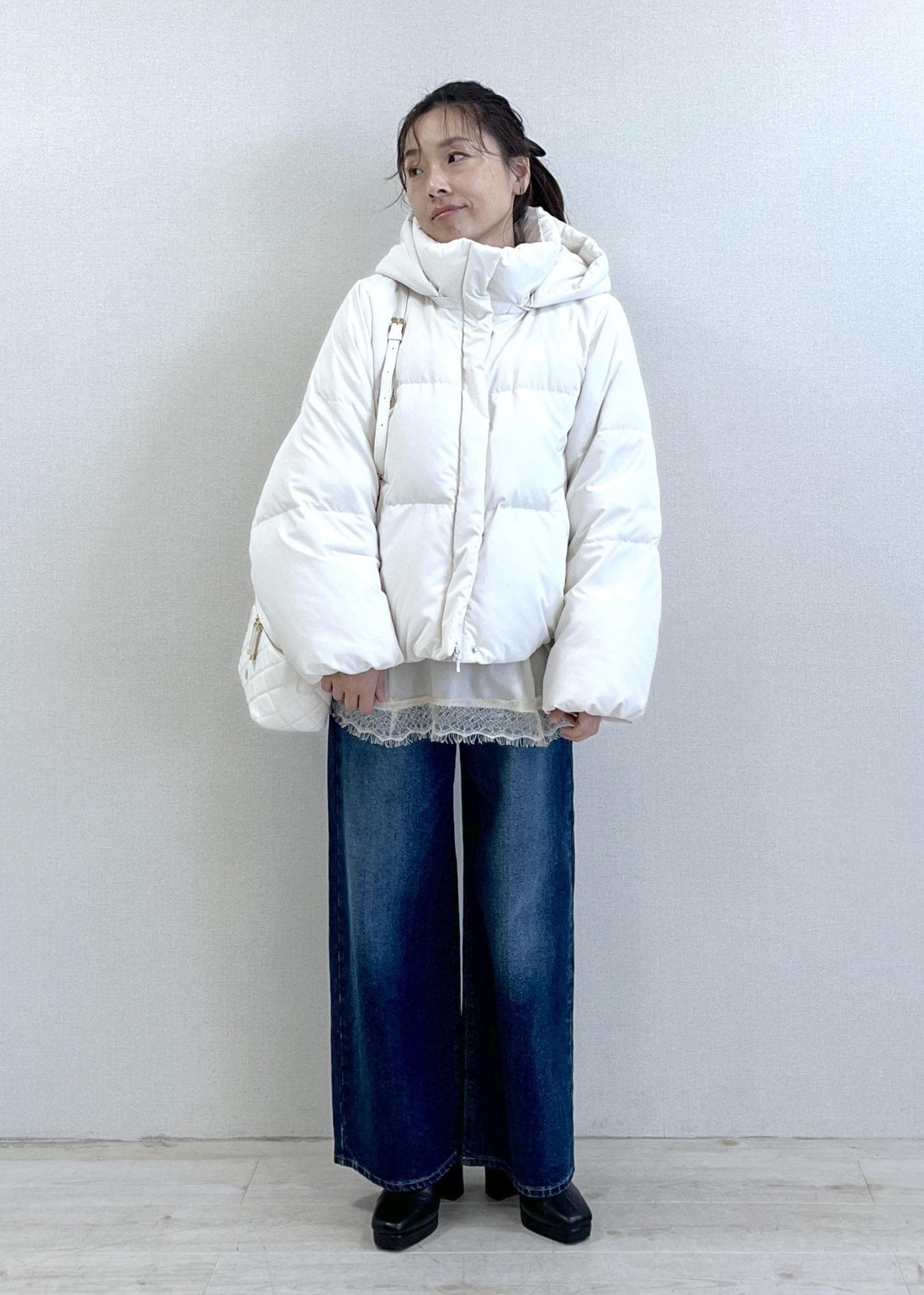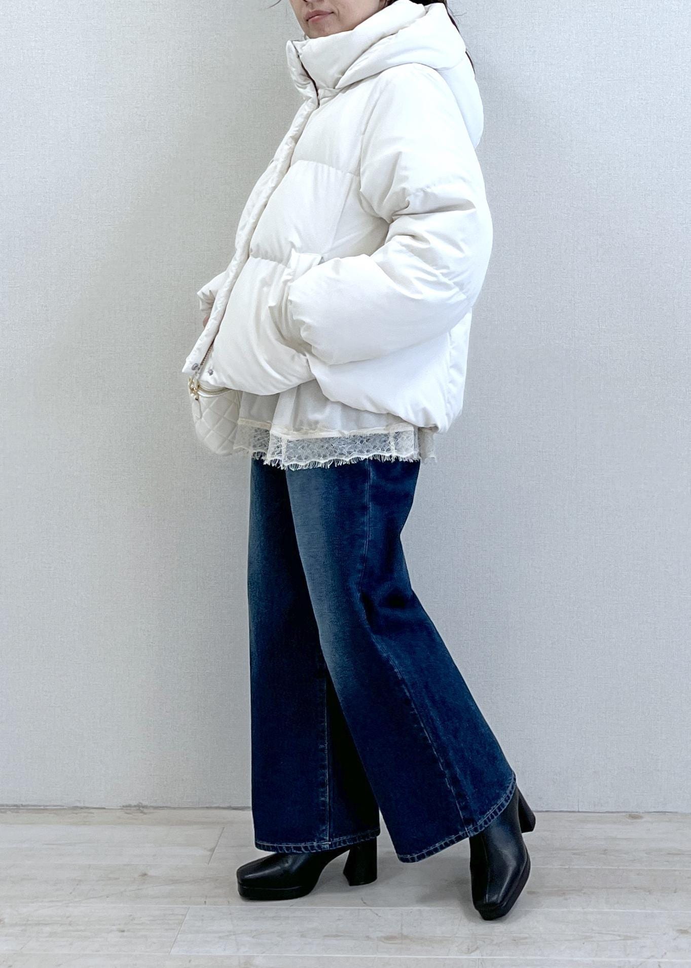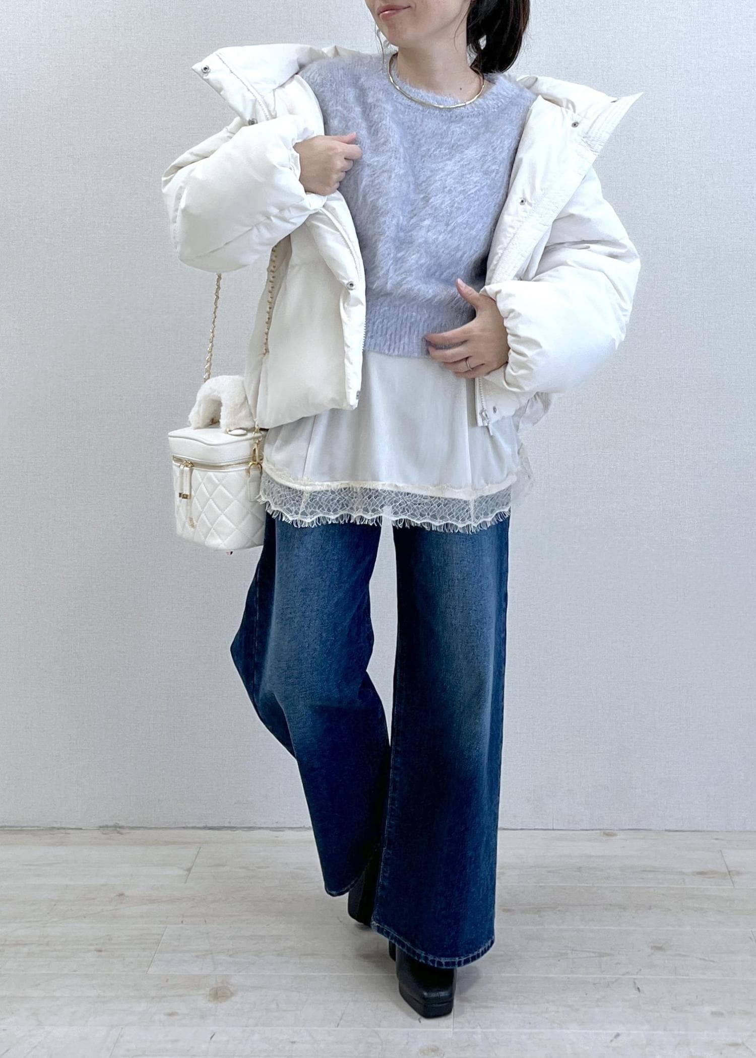 短め丈のニットに、あえて長めのレースキャミをレイヤードすることで、気になる腰回りをカバーしつつお洒落度もUP! 首元がスッキリしたクルーネックなので、ダウンのボリューム襟とも相性抜群。室内外どちらでも◎なスタイル