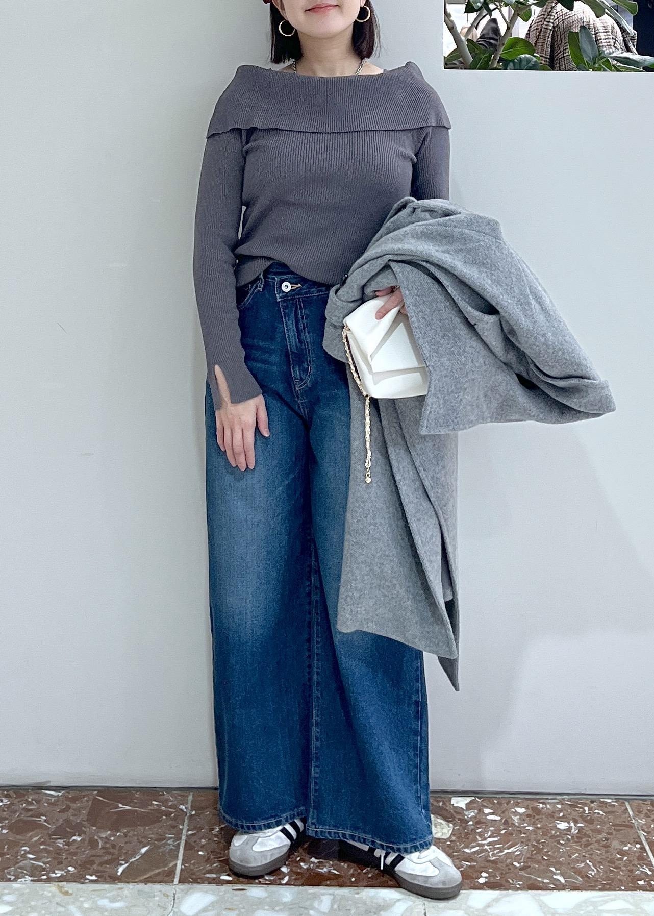 NEW!VIS【美得】オフショルダーモチモチリブニット/好評につき再入荷グレー / F¥5,489レビュー160cm着用で着丈はジャストウエストの位置です。