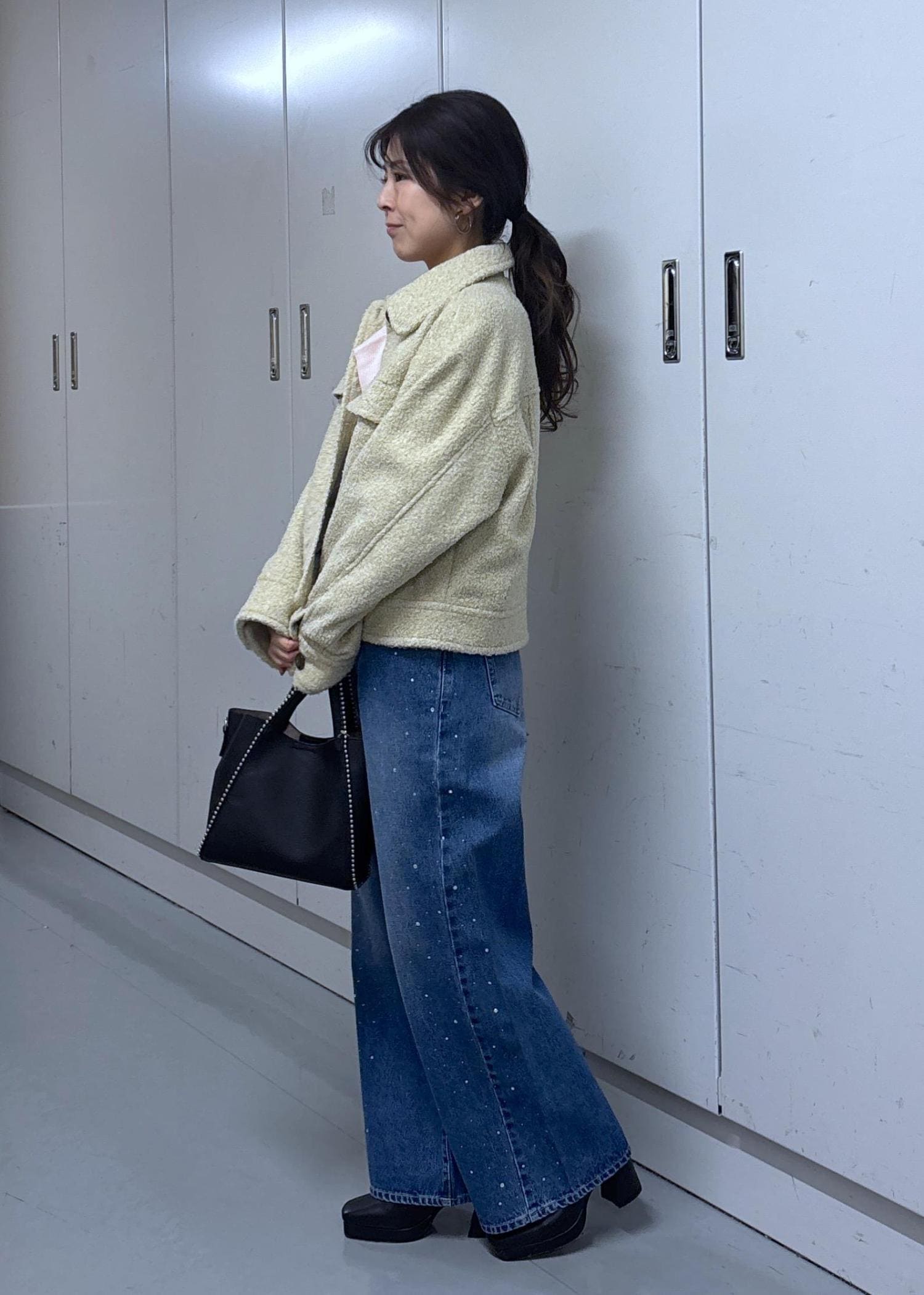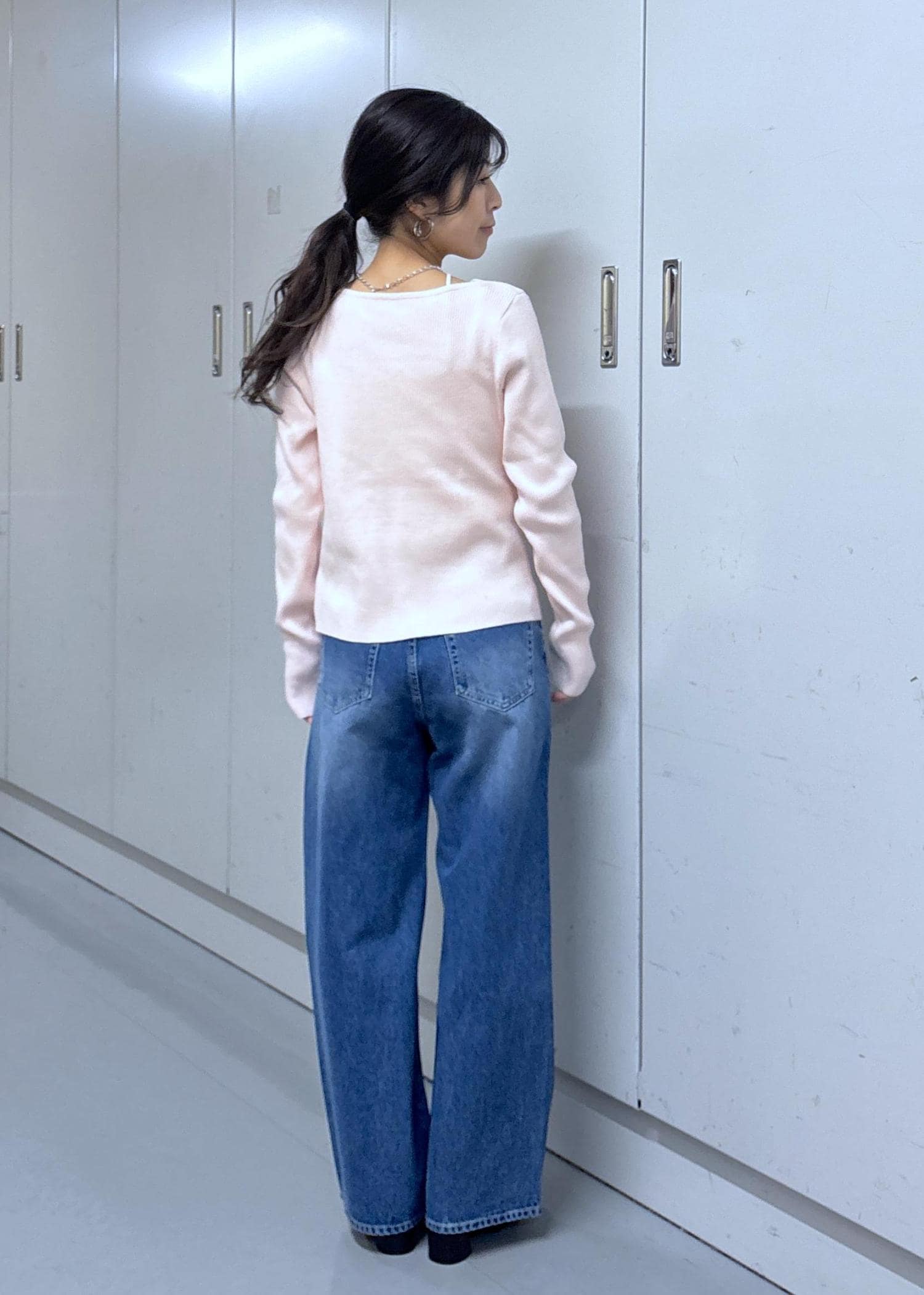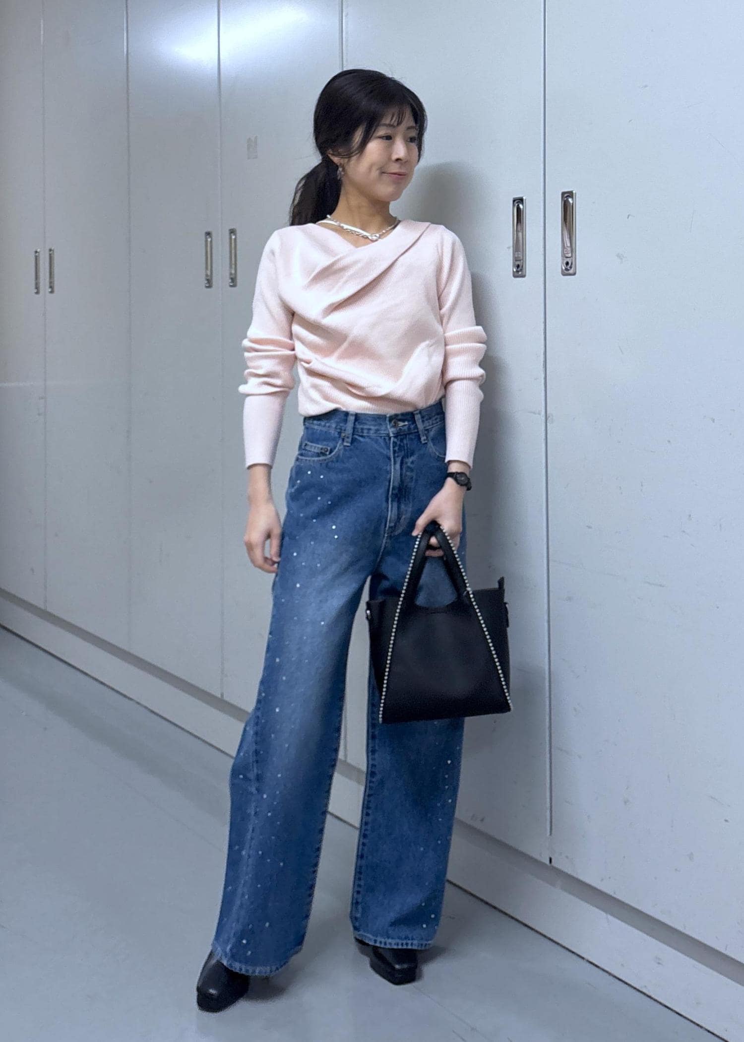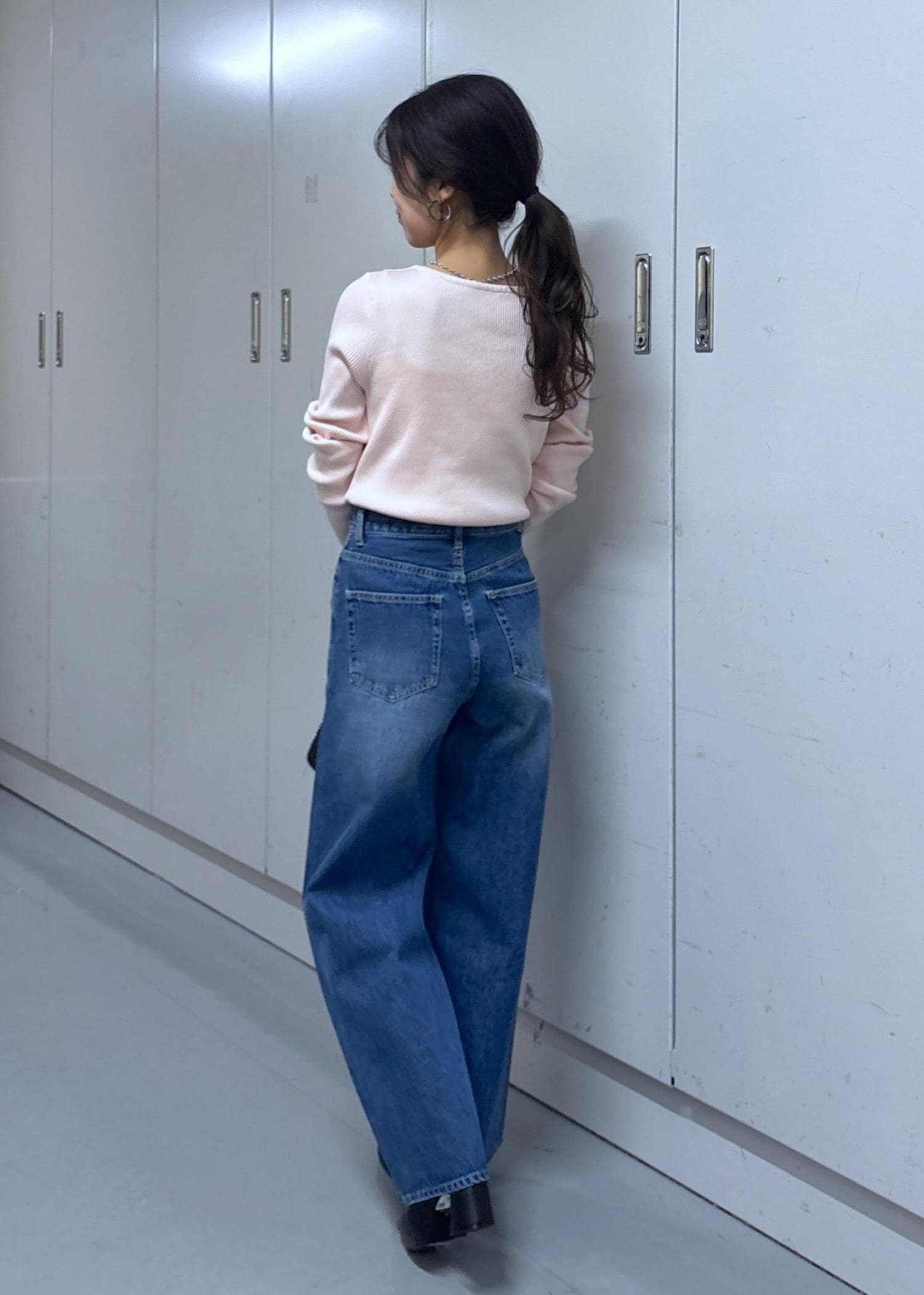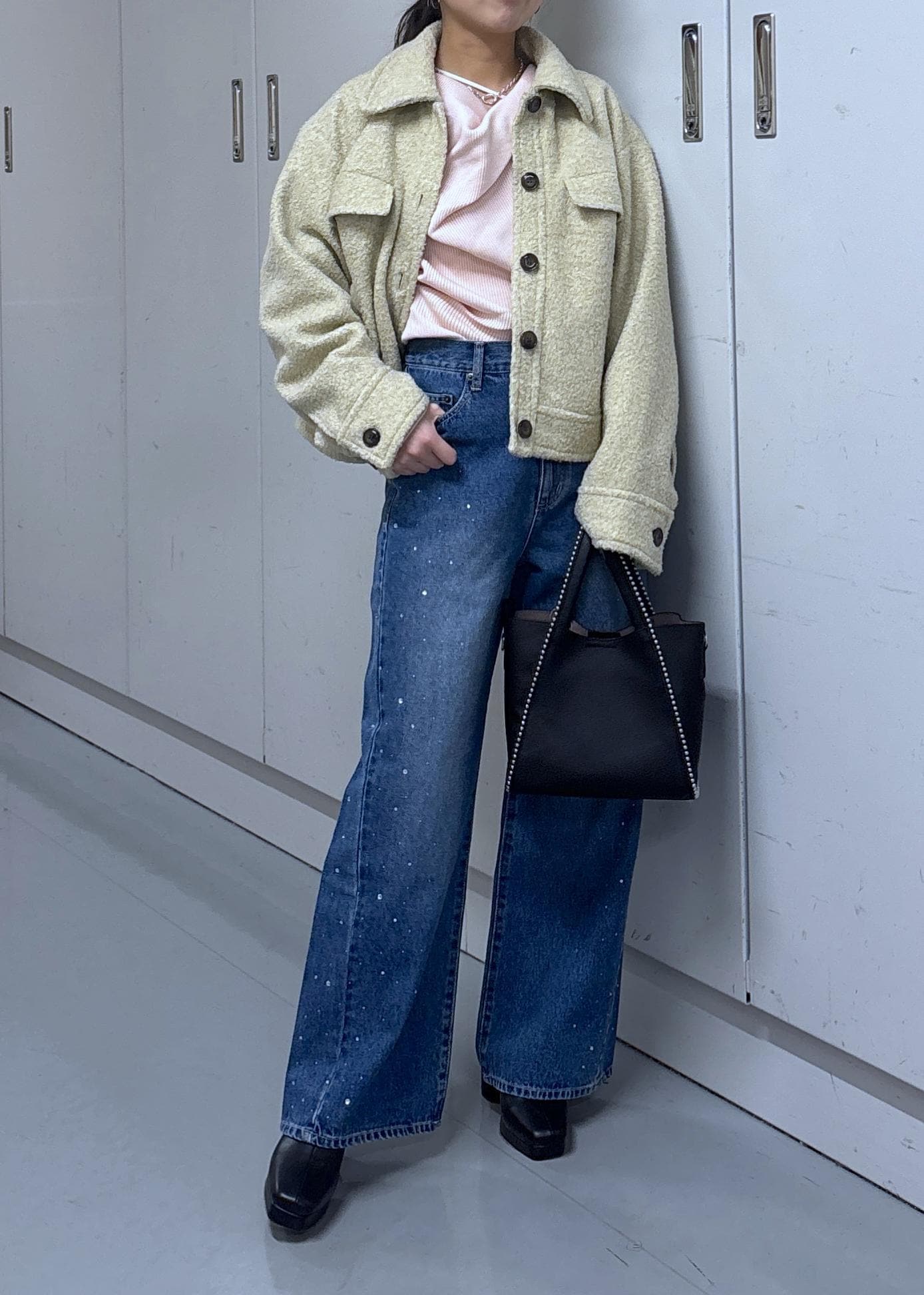VISビジューデニムパンツブルー / S¥6,327レビュー156cm/Sサイズ着用。ウエストは少し余裕があり、着丈は靴をはいてジャストです。ストレートで脚のラインをひろわず大人っぽくはけるデニムです。ビジューは粒が小さいのでギラギラせずさりげない感じがはきやすいです◎