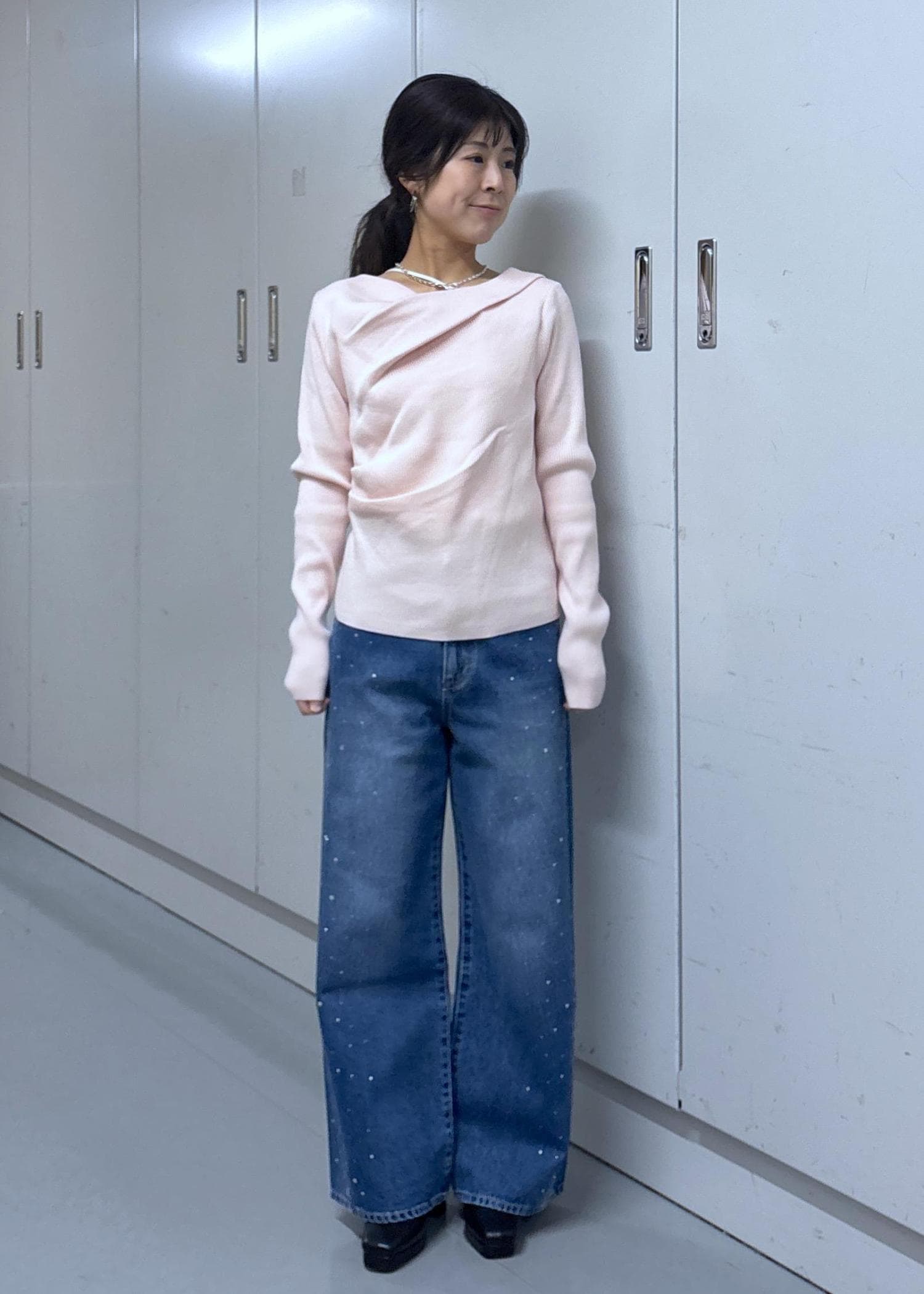 NEW!VIS【美得】もちもちドレープリブニットトップス/イージーケアピンク / F¥4,389レビュー156cm/F着用。着丈はお尻にかかる長さで袖丈は手の甲が隠れる長さです。カシュクールのようなドレープデザインが一枚でも着映えするトップス。チクチク感もなくしっとりした素材なので肌触りもよく着心地がいいです‼︎