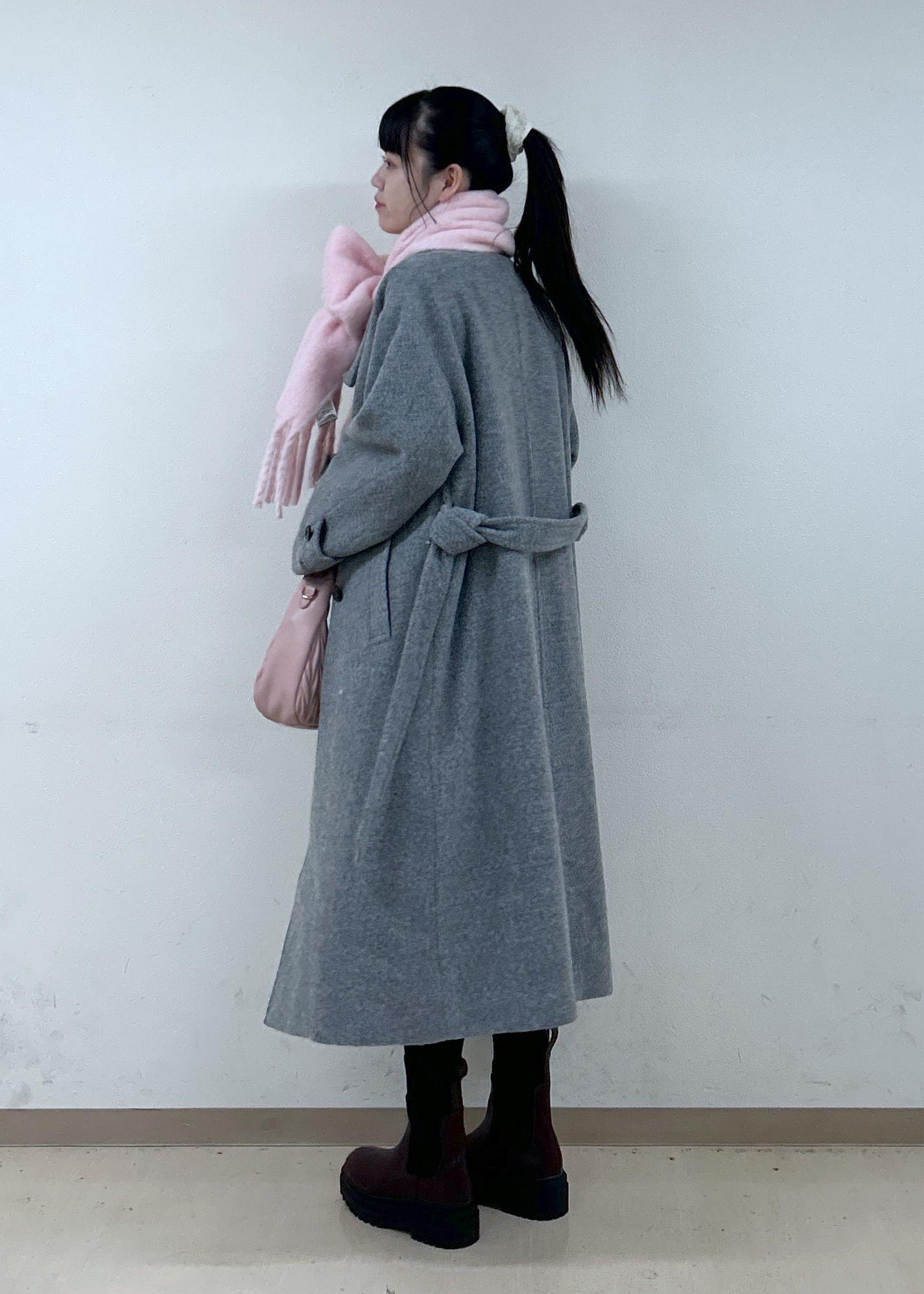 Sサイズでも下に厚手のニットや重ね着インナーが問題無く着られます。ベルトでウエストマークが出来るので着膨れしがちな寒い時期でもスタイリッシュに! -