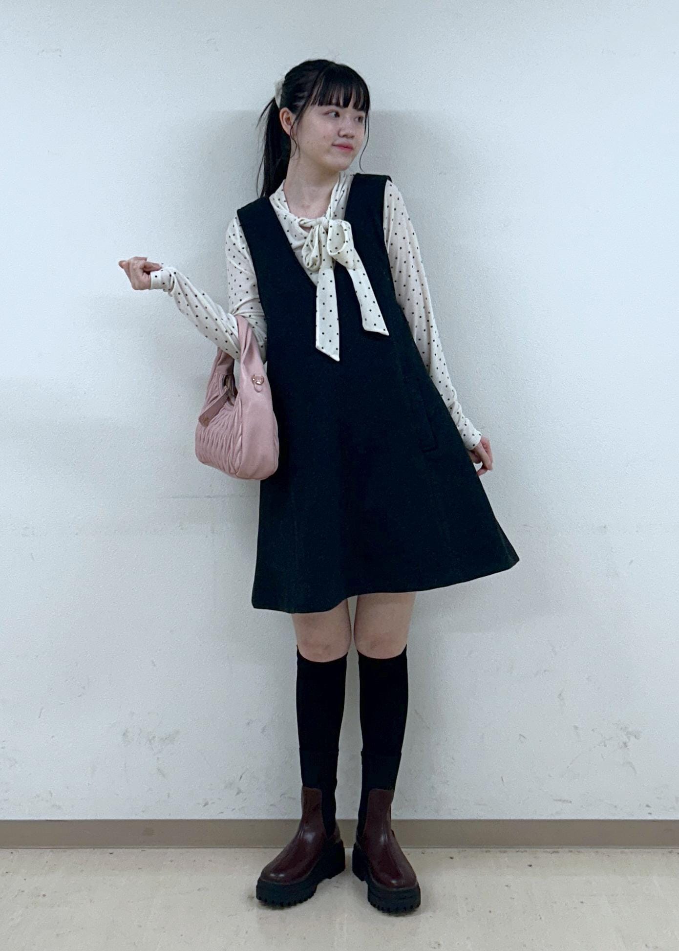 VISシャギーVネックミニ丈ジャンパースカートチャコール / F¥7,909レビューAラインのシルエットで腰周りがカバーできるので大人の方や骨格ウェーブさんには嬉しいポイントです!
