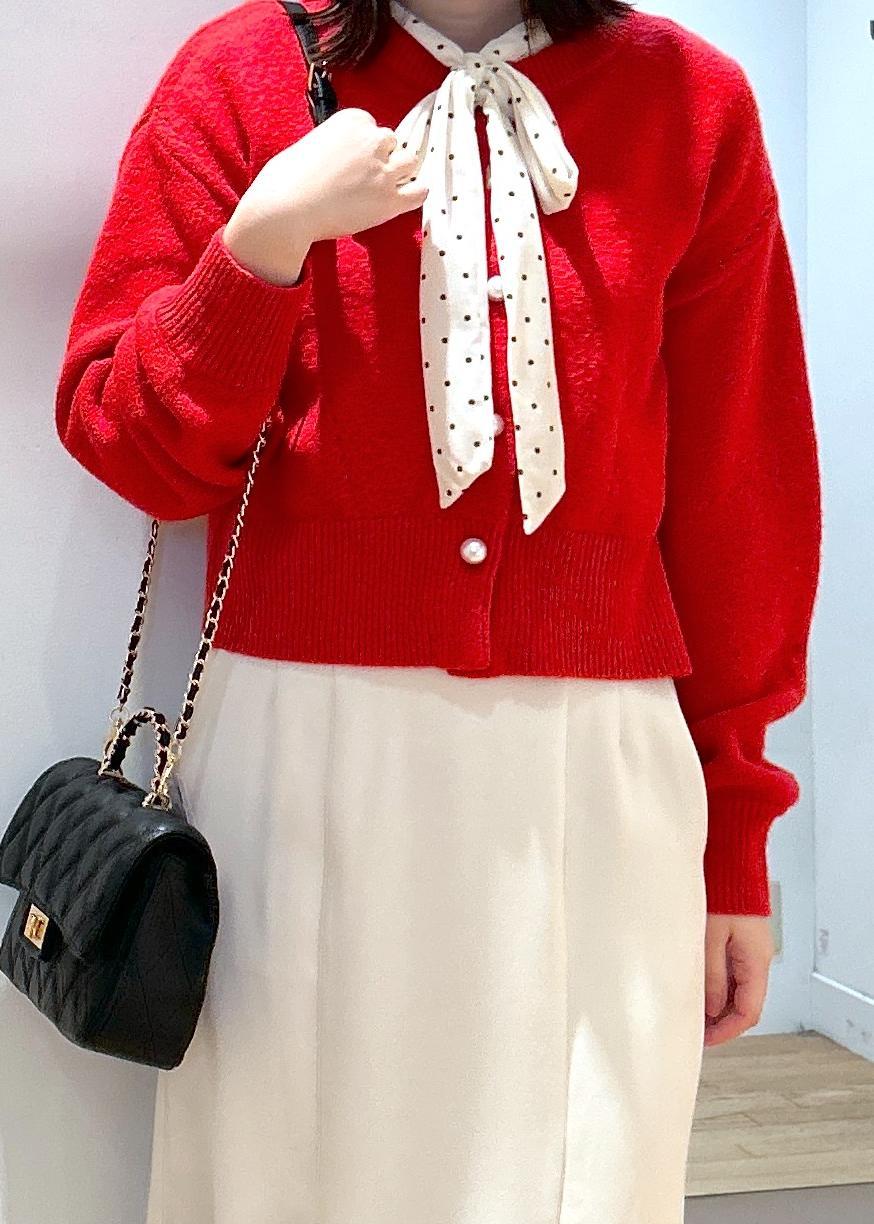 赤のカーディガンが主役の華やかコーデです。