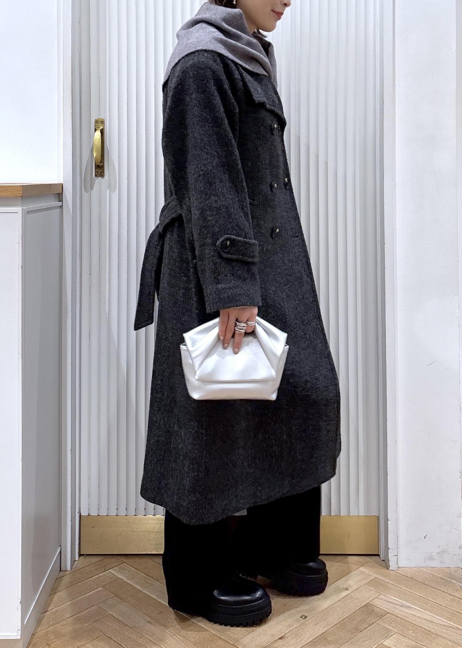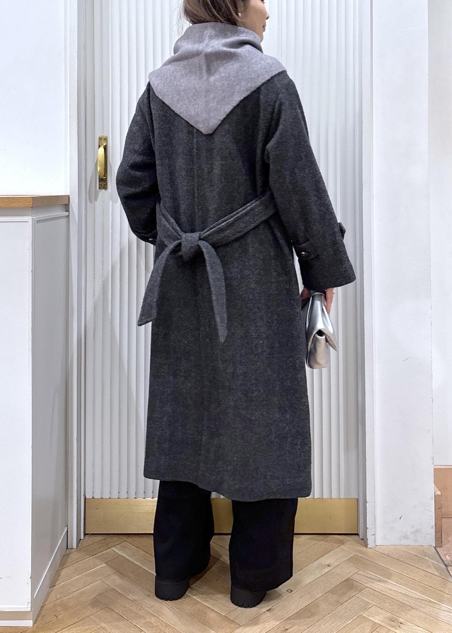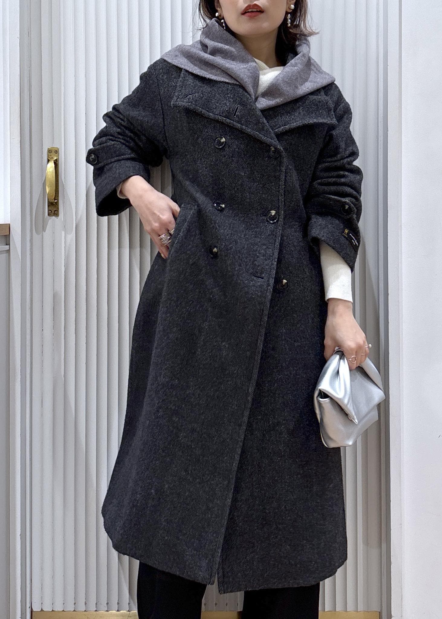 尾州のロングコートにドレープニットを合わせて、ニットスカーフを巻いたカジュアルなコーディネート。少しラフに着ることも出来るからデイリー使いにピッタリ♡