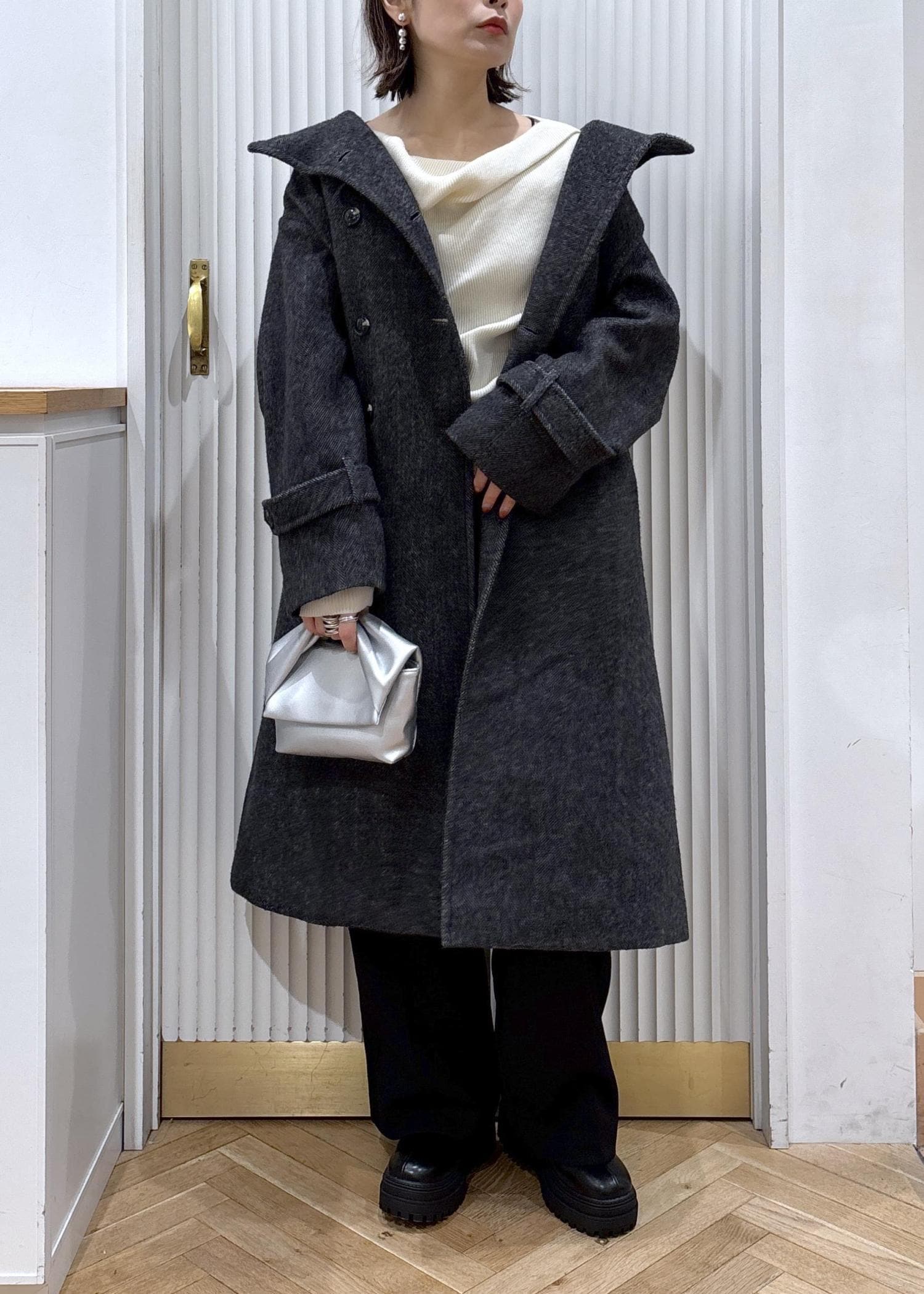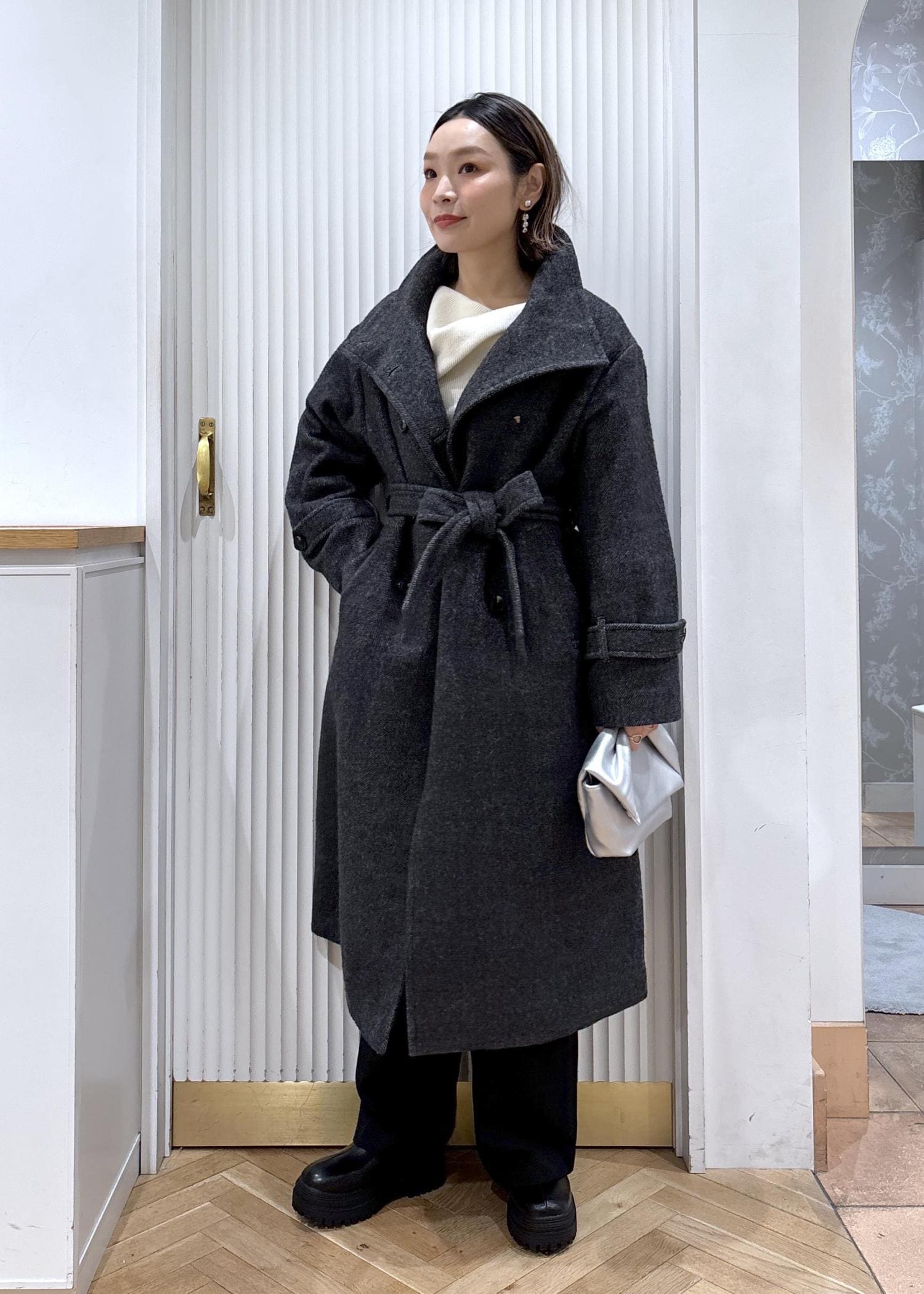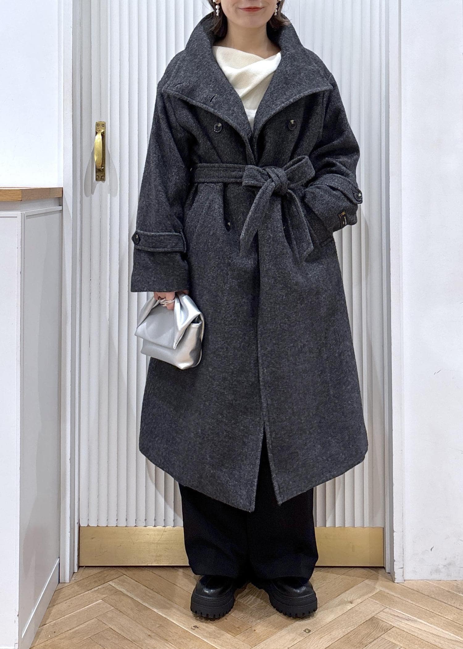 尾州のロングコートにドレープニットを合わせて、ニットスカーフを巻いたカジュアルなコーディネート。少しラフに着ることも出来るからデイリー使いにピッタリ♡