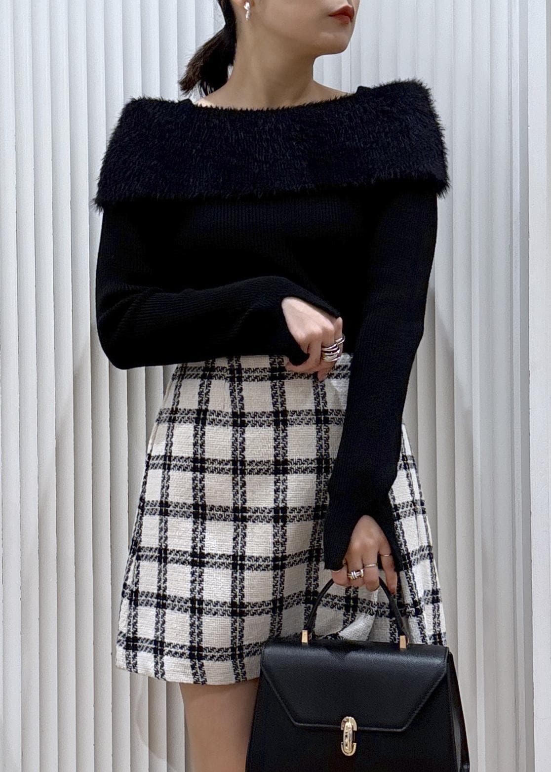 ボックススリットだからいやらしくない、大人のミニスカート♡モノトーンで合わせればシャープなキリッとしたスタイリングに。