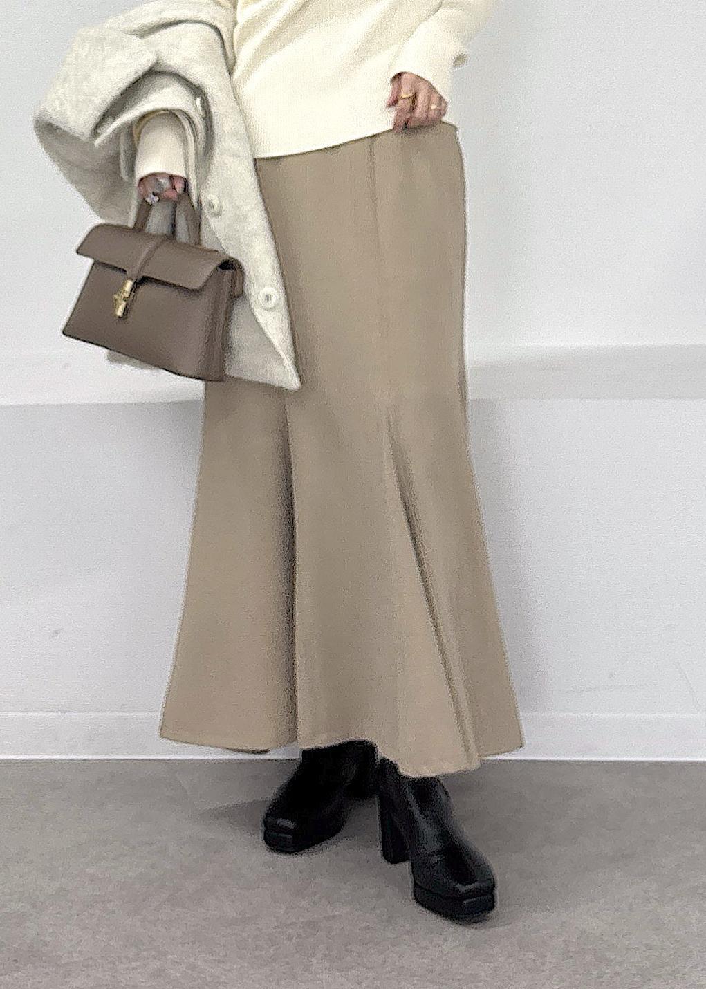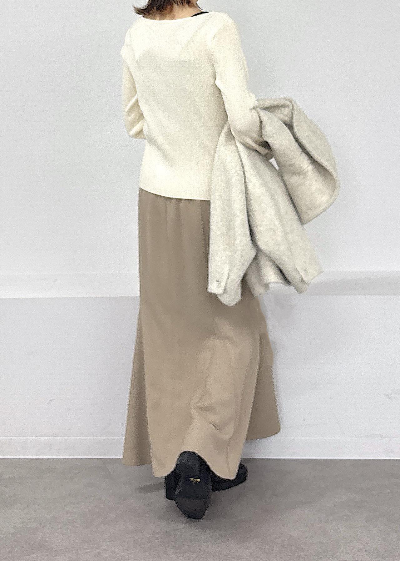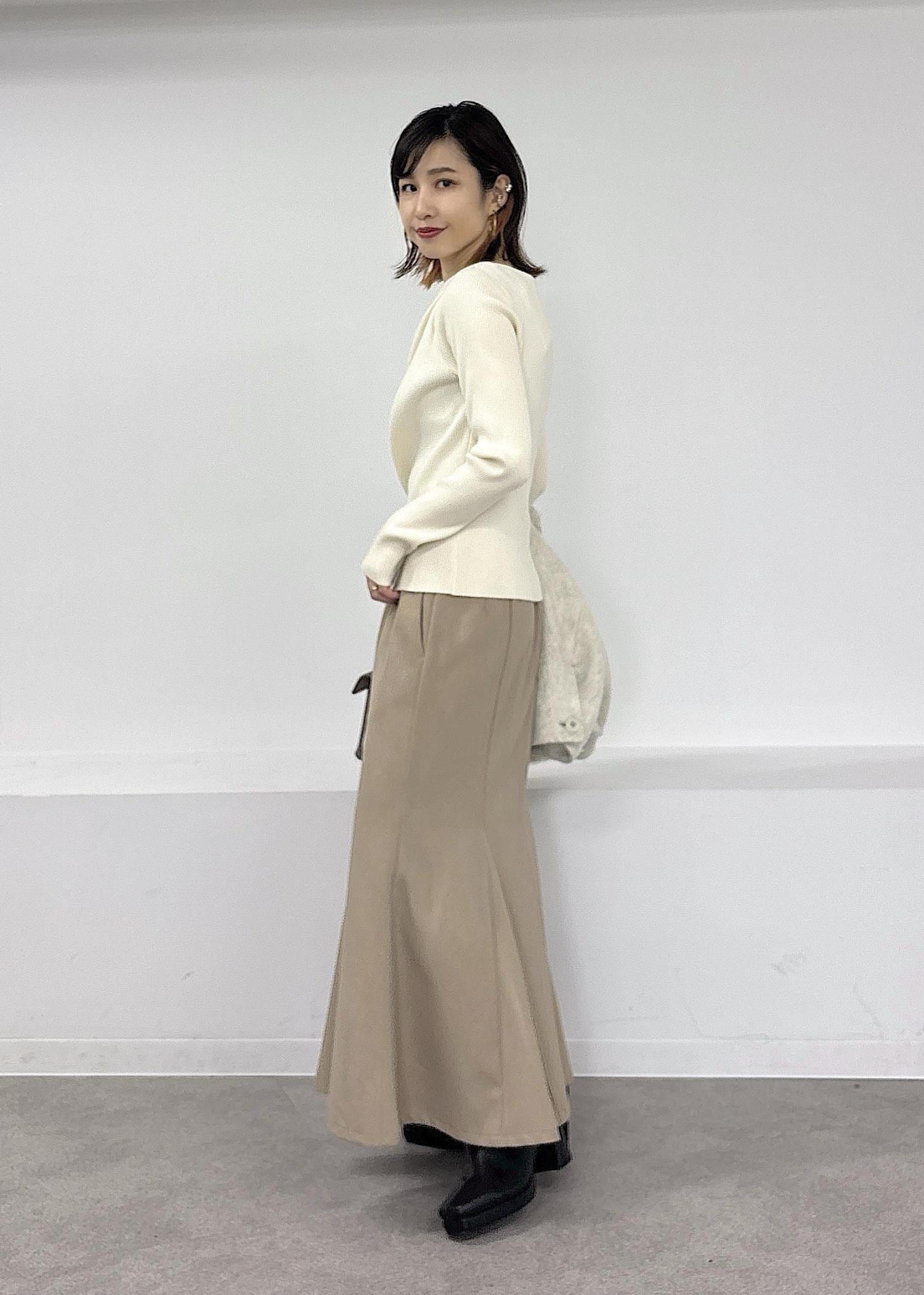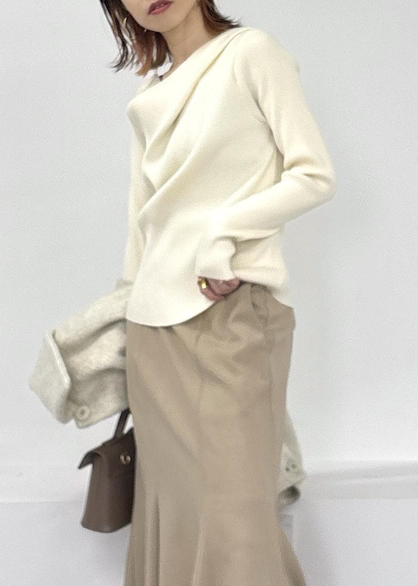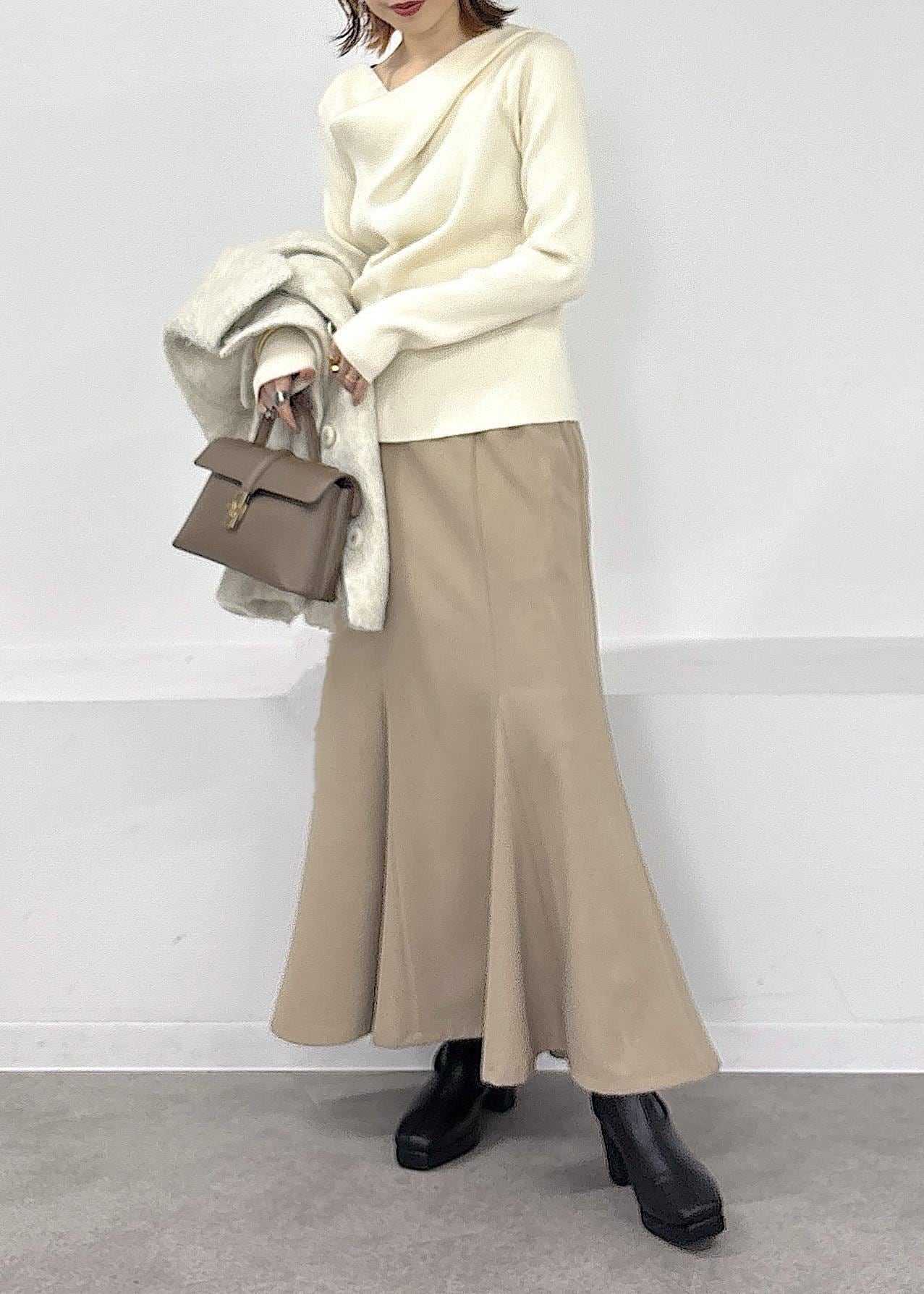 今年らしいドレープニットをポイントに、マーメイドスカートでスッキリ合わせたレディスタイル♪シルエットがとても女性らしく、お仕事、デートなど様々な予定に合わせて着れます◎優しい色合わせが冬から春まで長く使えるきれいめカジュアルコーデ。