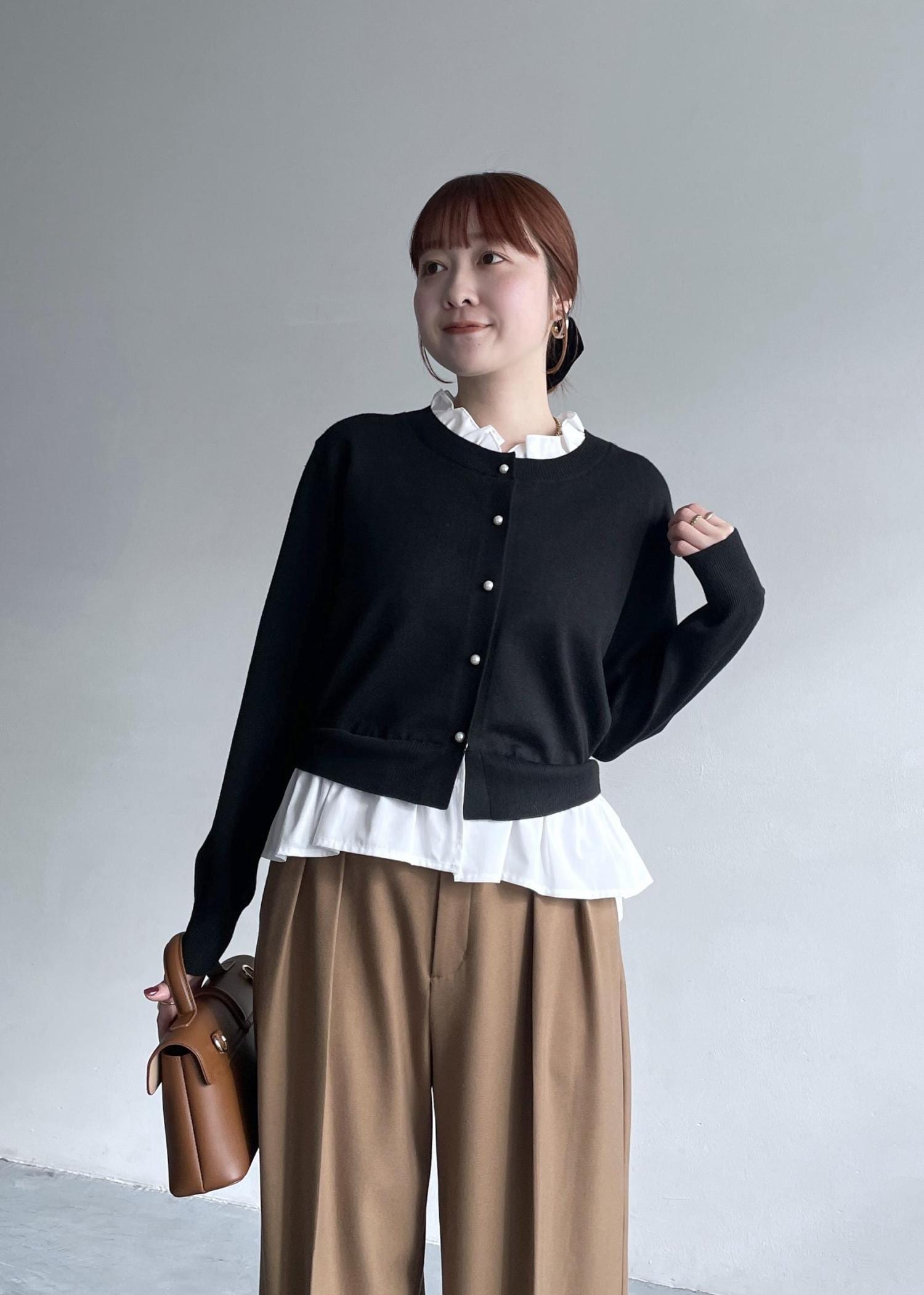 NEW! 予約VIS【美得】フリル襟ドッキングニットカーディガントップスブラック / F¥5,929レビュー1枚で完成するドッキングトップス♡ニット部分は程よくゆとりがありボトムを選ばないサイズ感、フリルブラウスがヒップ隠れるくらいの着丈なので体型カバーも叶います◎オフィスOKなきちんと感と休日も着れる程よい甘さでONOFF兼用使いにも!
