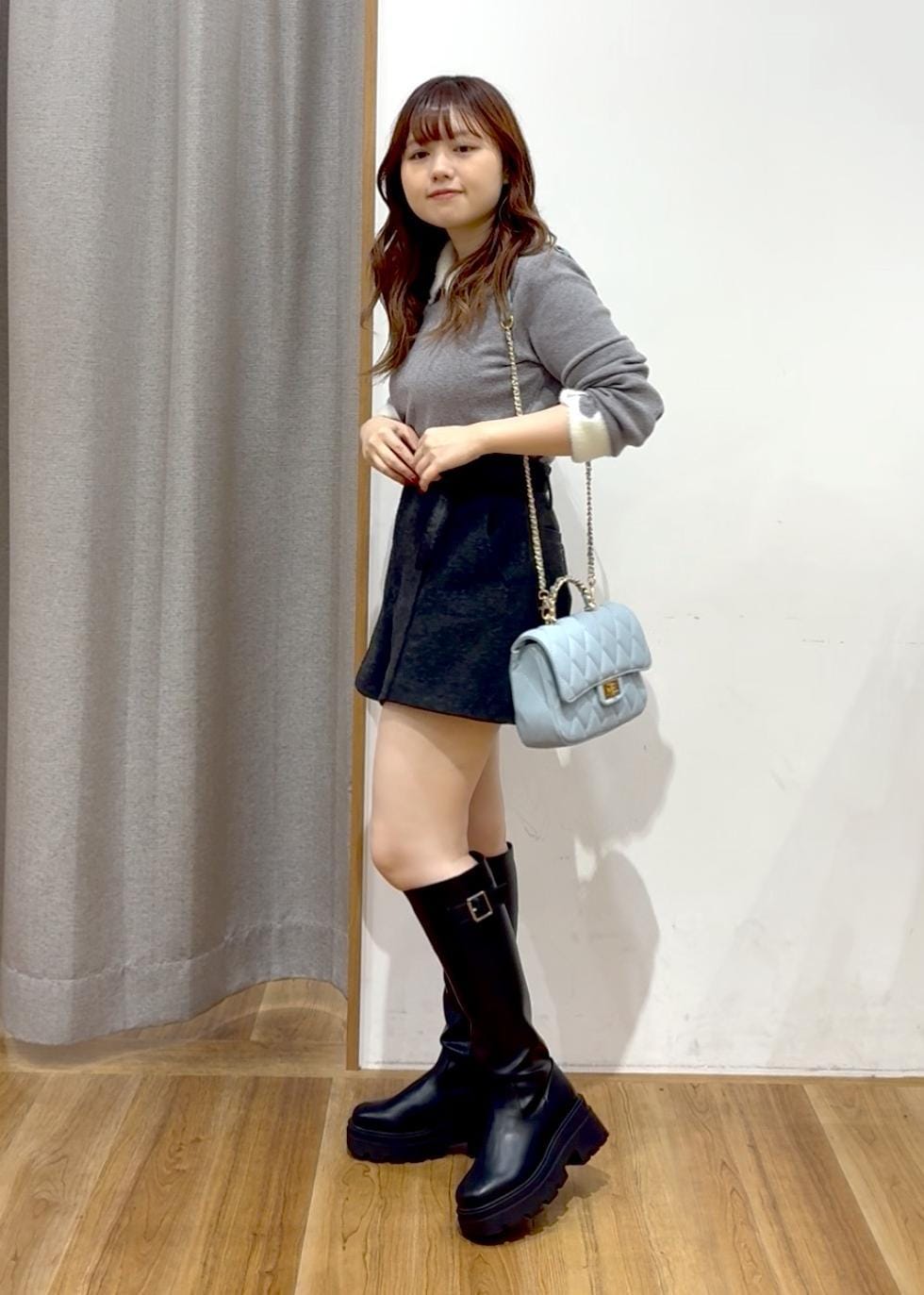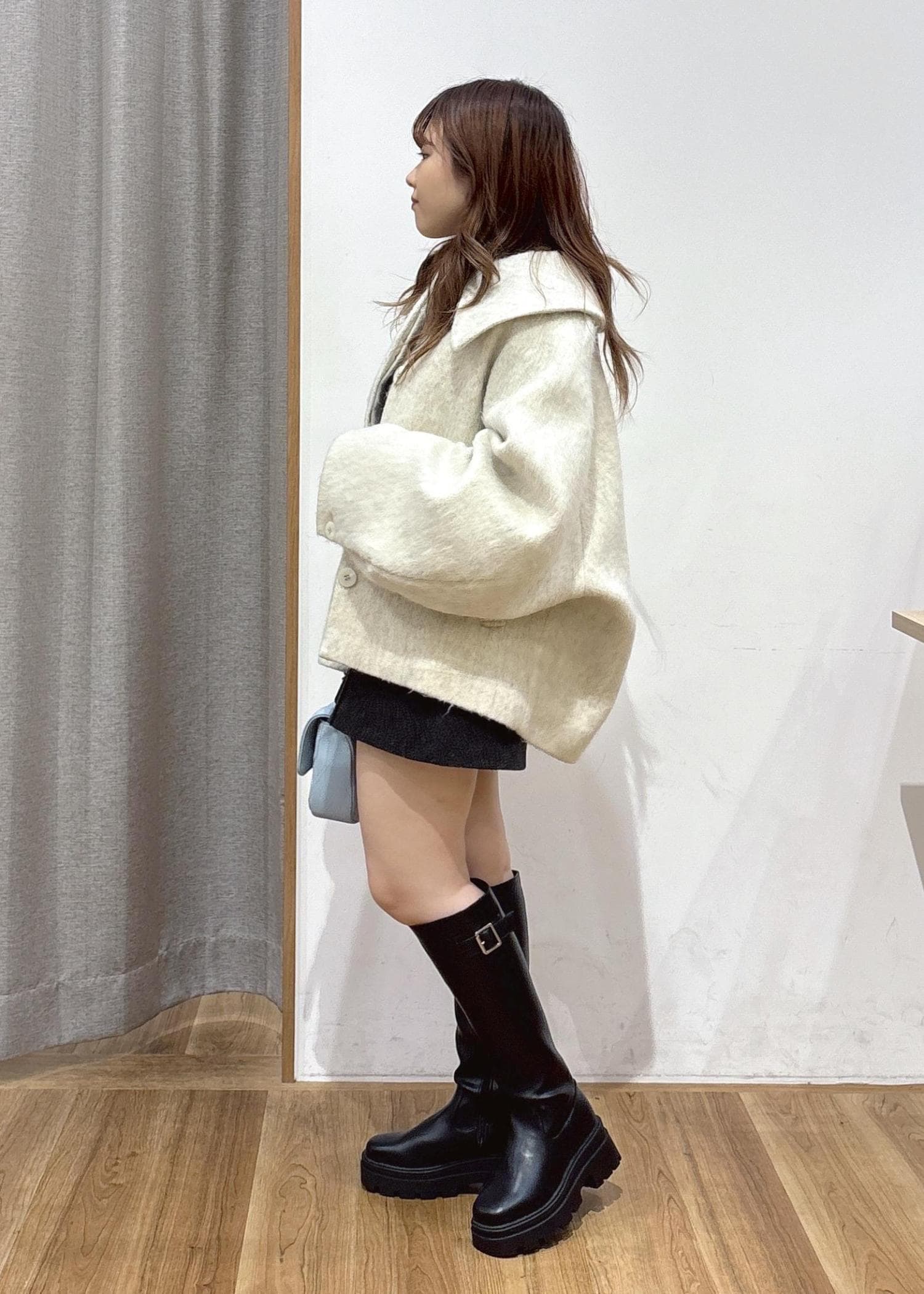 着膨れしやすい低身長の方でも暖かく過ごせる、シャギーやニットなどのあったか素材をチョイスしたコーディネートを組んでみました。