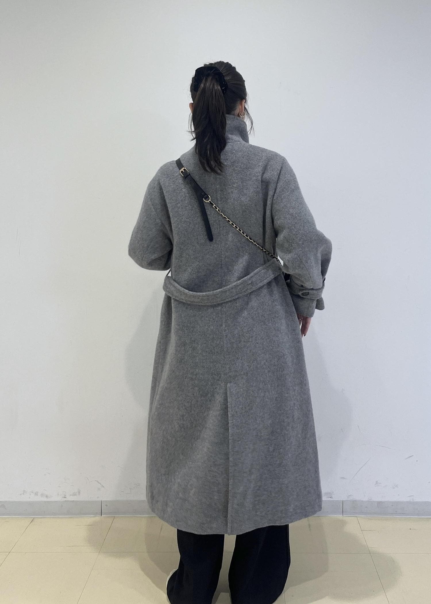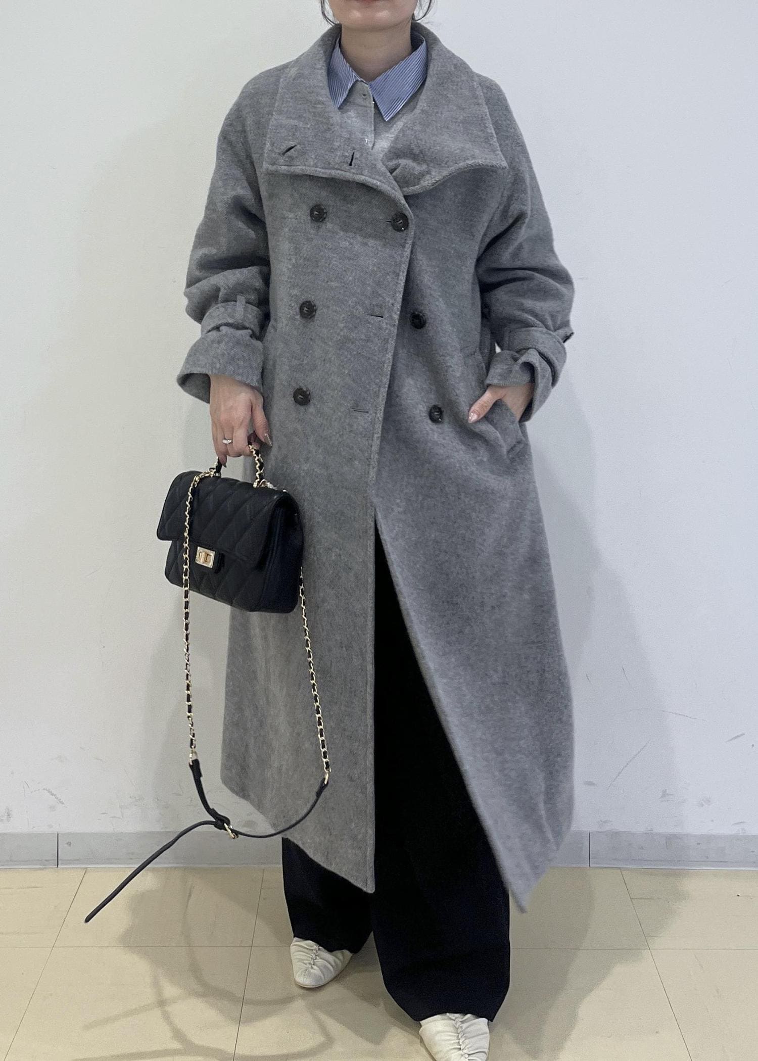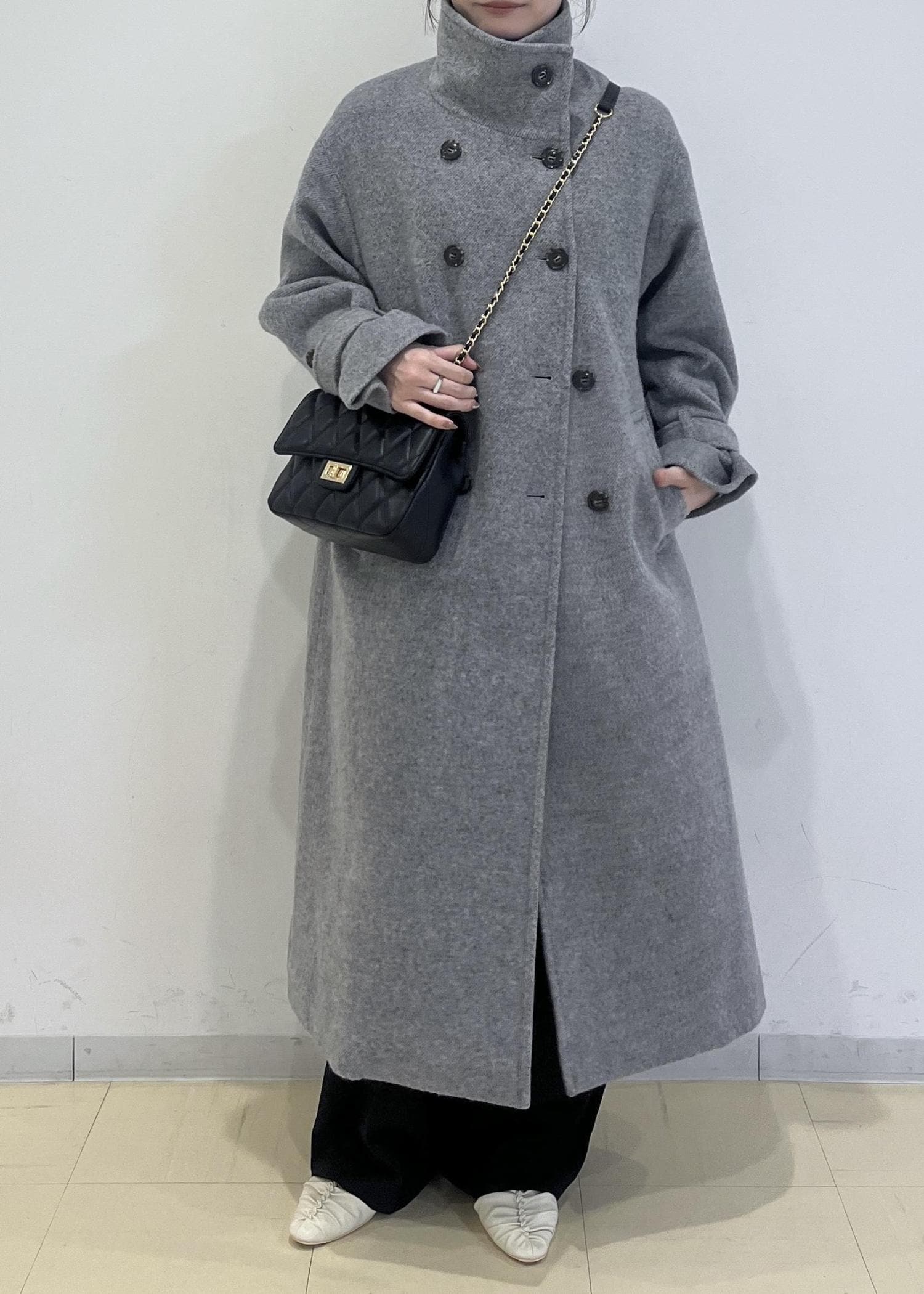フラットシューズで合わせると地面に引き摺る丈ですので
