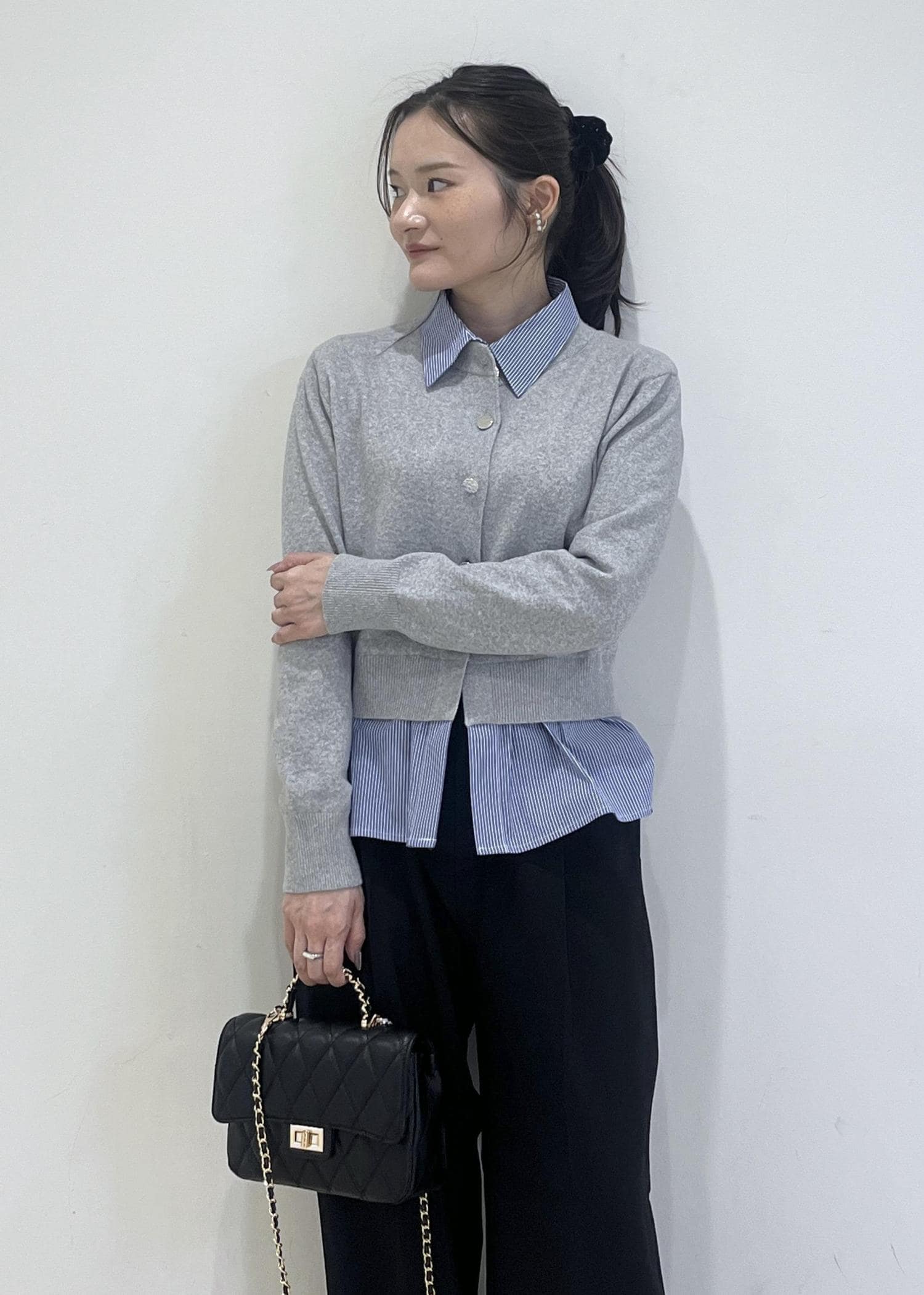 ポニーテール、チェーンバッグで女っぽさをプラスしました。