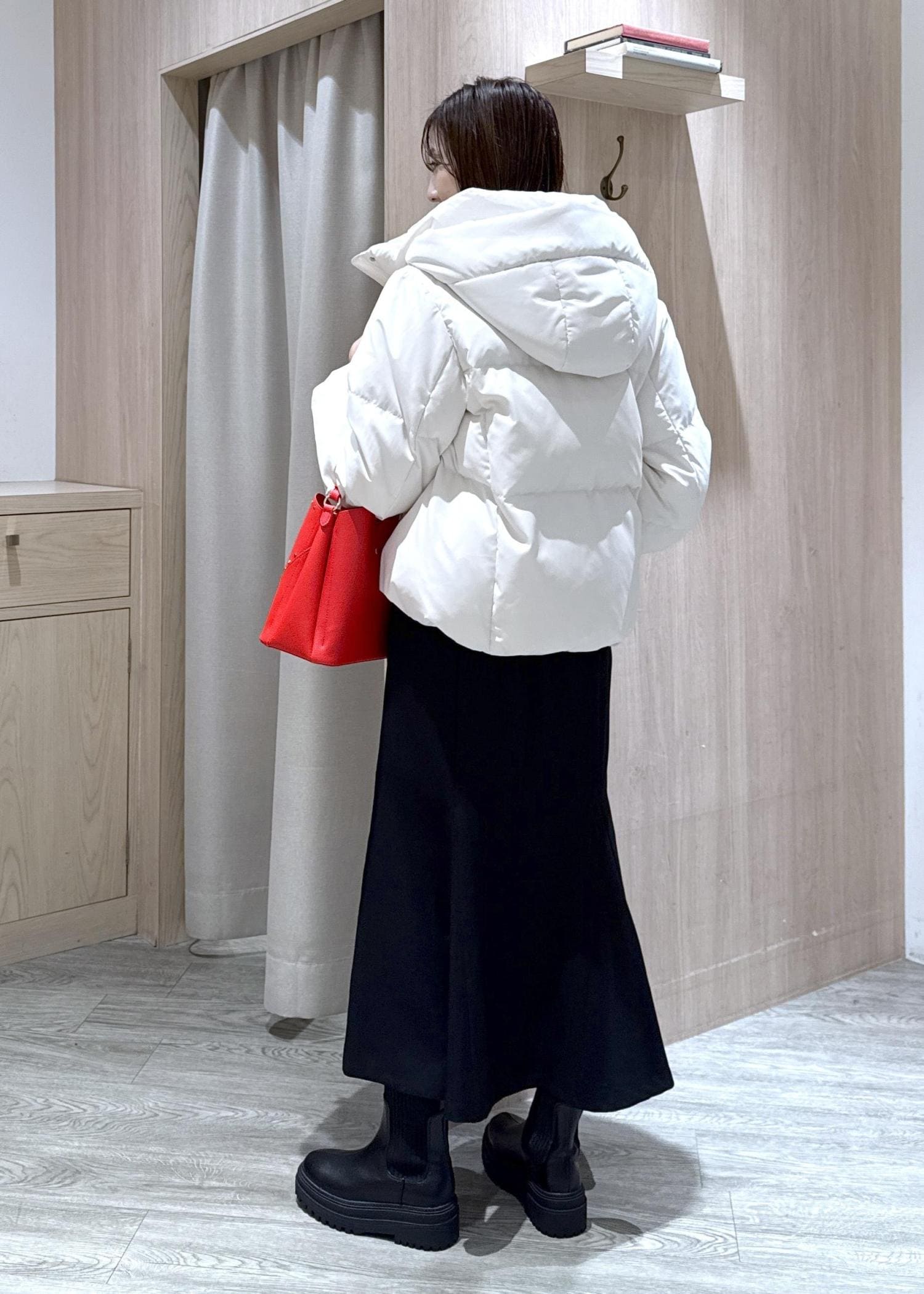 程よい肌見せのオフショルニットにダウンジャケットを合わせたお出かけコーデです!!首元まで暖かいダウンジャケットがあればオフショルニットでも安心◎