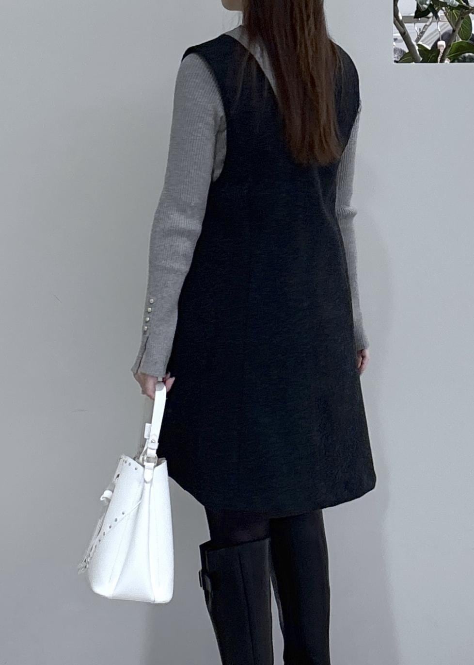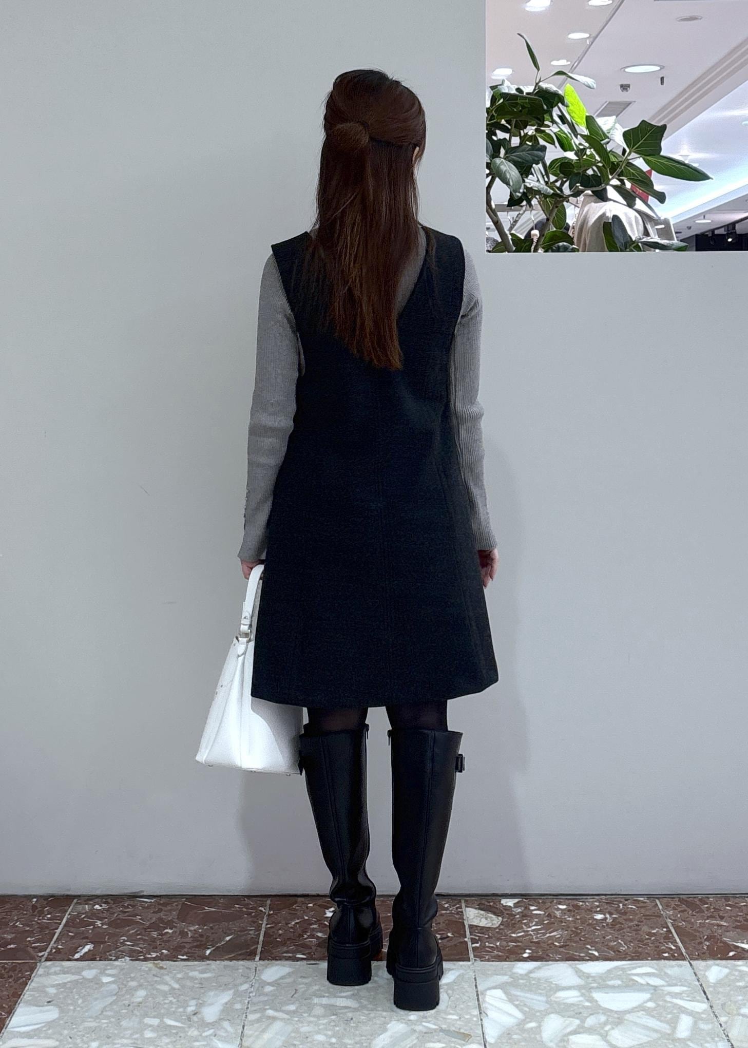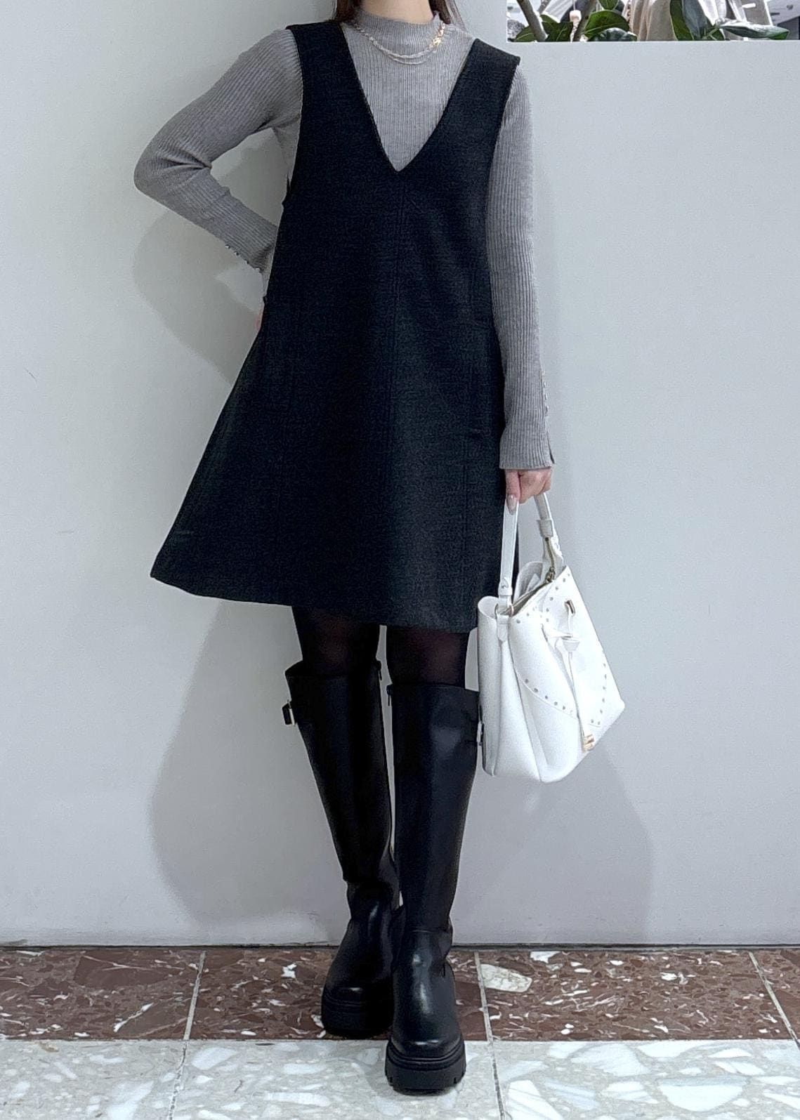 VISシャギーVネックミニ丈ジャンパースカートチャコール / F¥7,909レビュー158cmで膝丈くらいでした。スッキリしていてメリハリのあるAラインでヒップも目立ちませんでした!