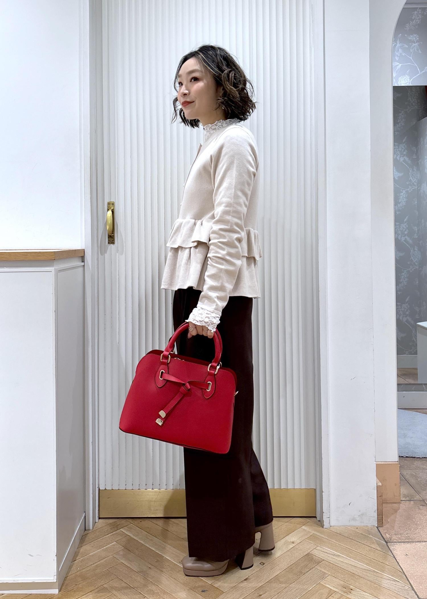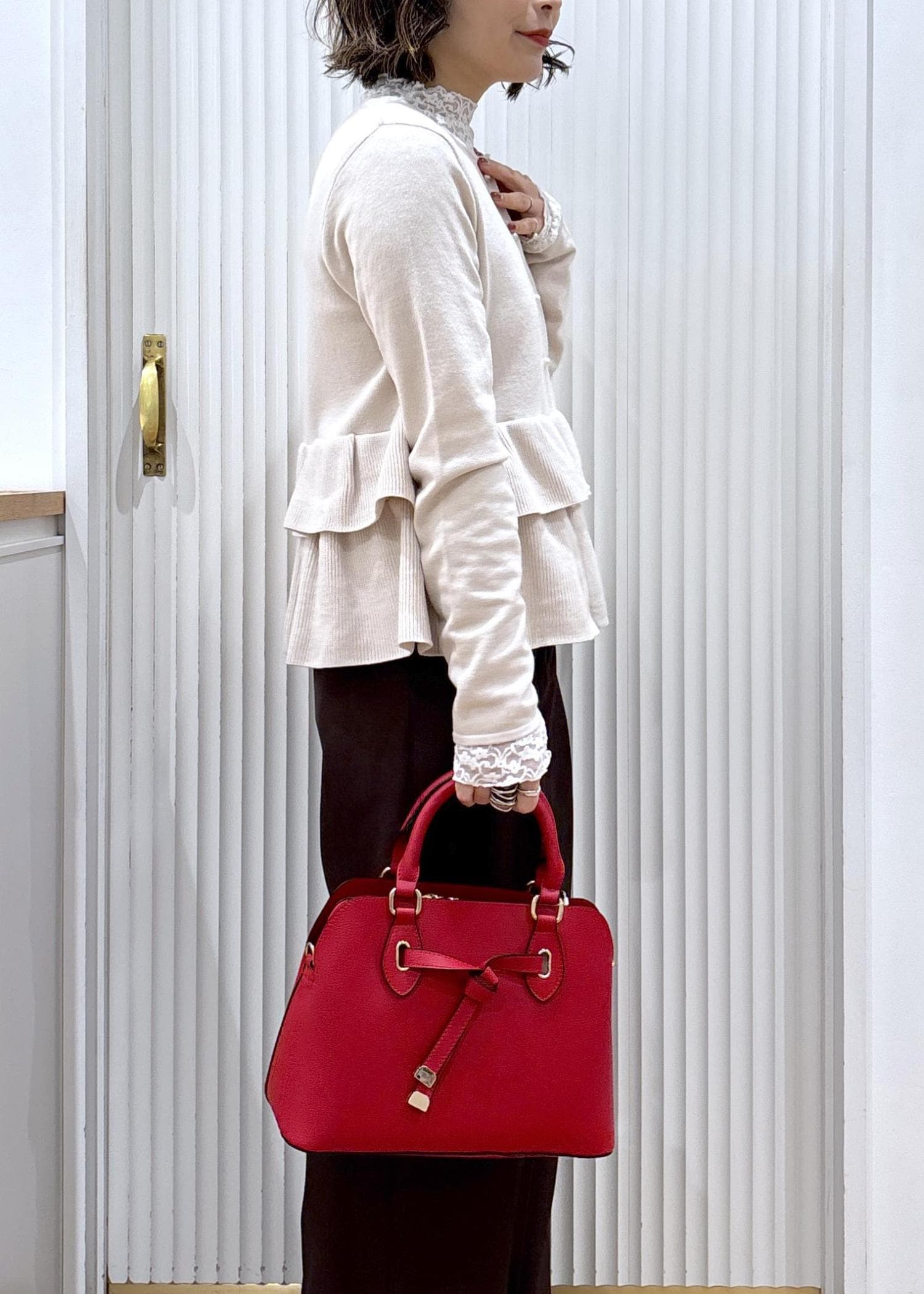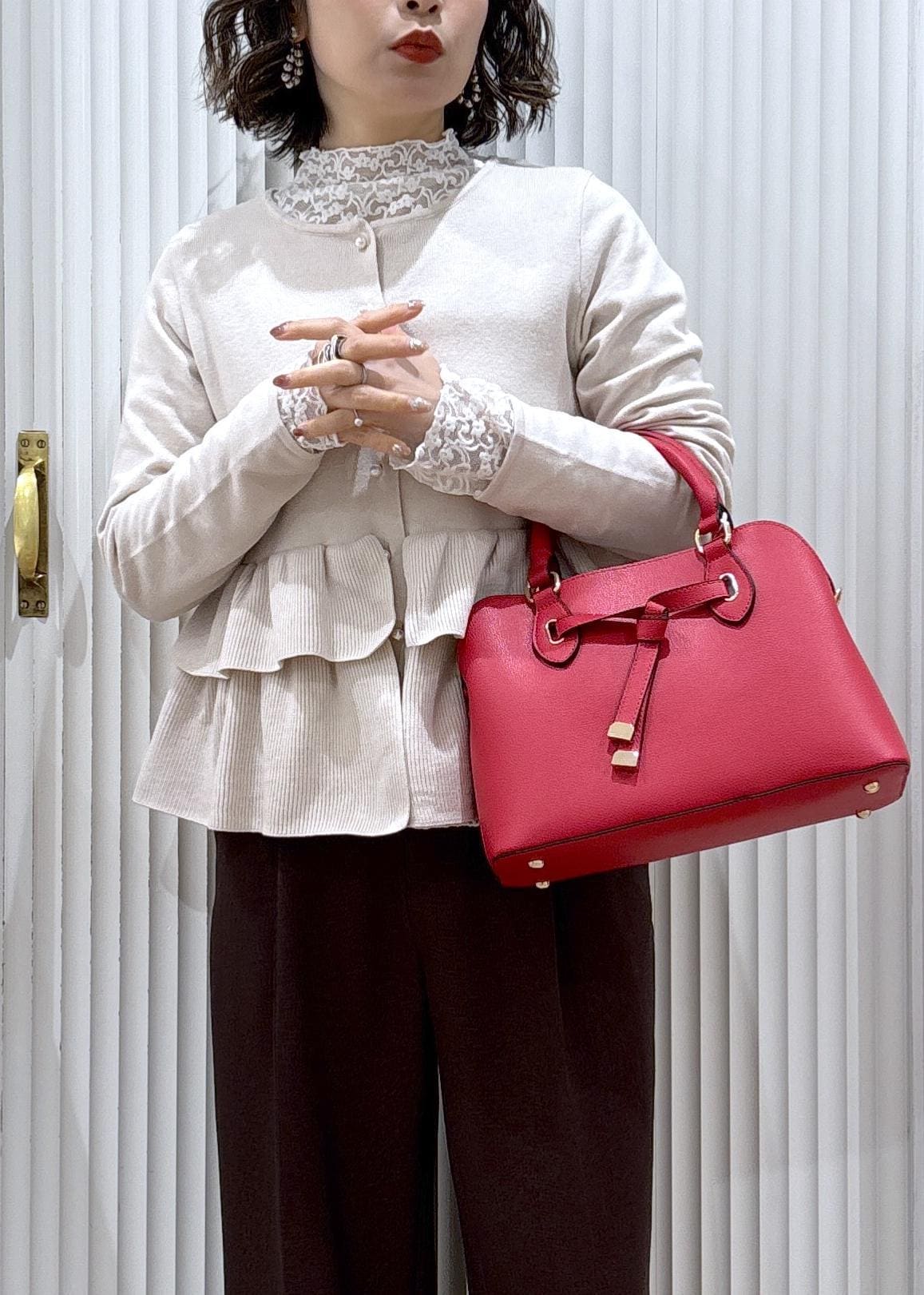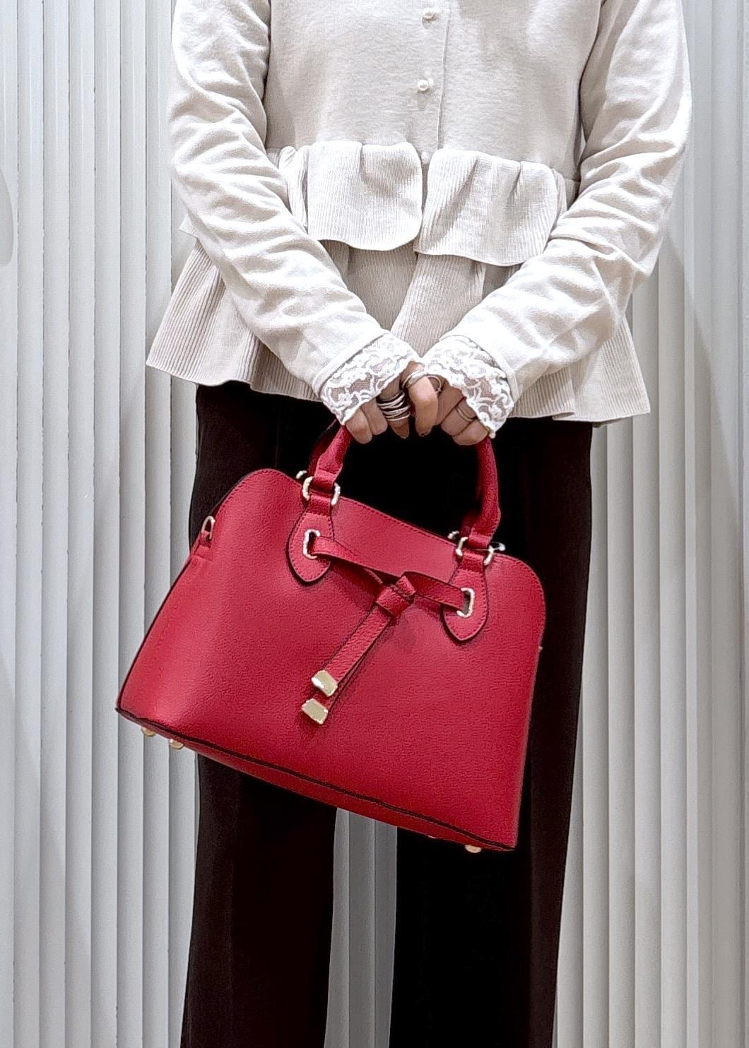 VISフロントタイ ブガッティ型ボストンバッグ/2WAYレッド / F¥7,909レビューフロントのリボンが可愛い高見えバッグ。長財布や500mlのペットボトルまで入る安心の容量です。肩掛けのストラップも付属されており、荷物が増えた際は両手が使えてとっても便利。ファスナー付きで安心感があり、リアルレザーのような見た目が高級感がありオフィスにも◎また、セレモニーシーンにもお勧め。