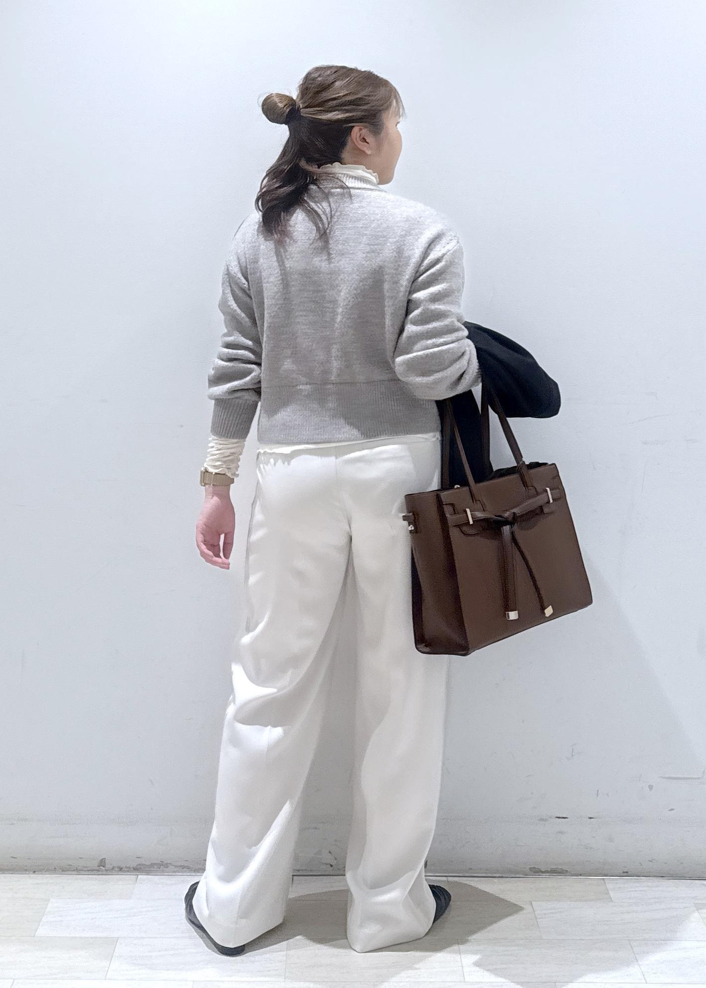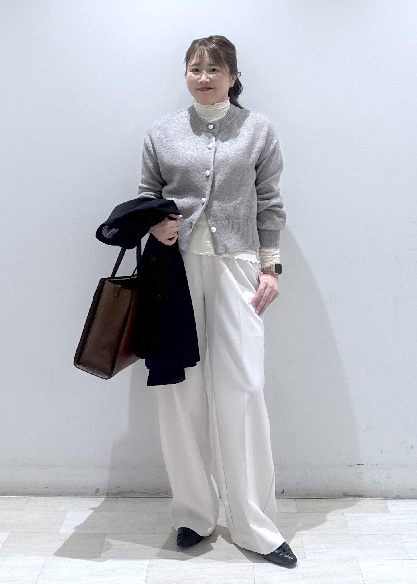 今回はシワにもなりにくいウーリッシュジャケットのセットアップで、お仕事でも使える綺麗めなコーディネートにしてみました。カーディガンもレイヤードスタイルで、ウール素材なのでこの寒い時期にも暖かいです。第二ボタンがハートのデザインになっているのもpoint◎