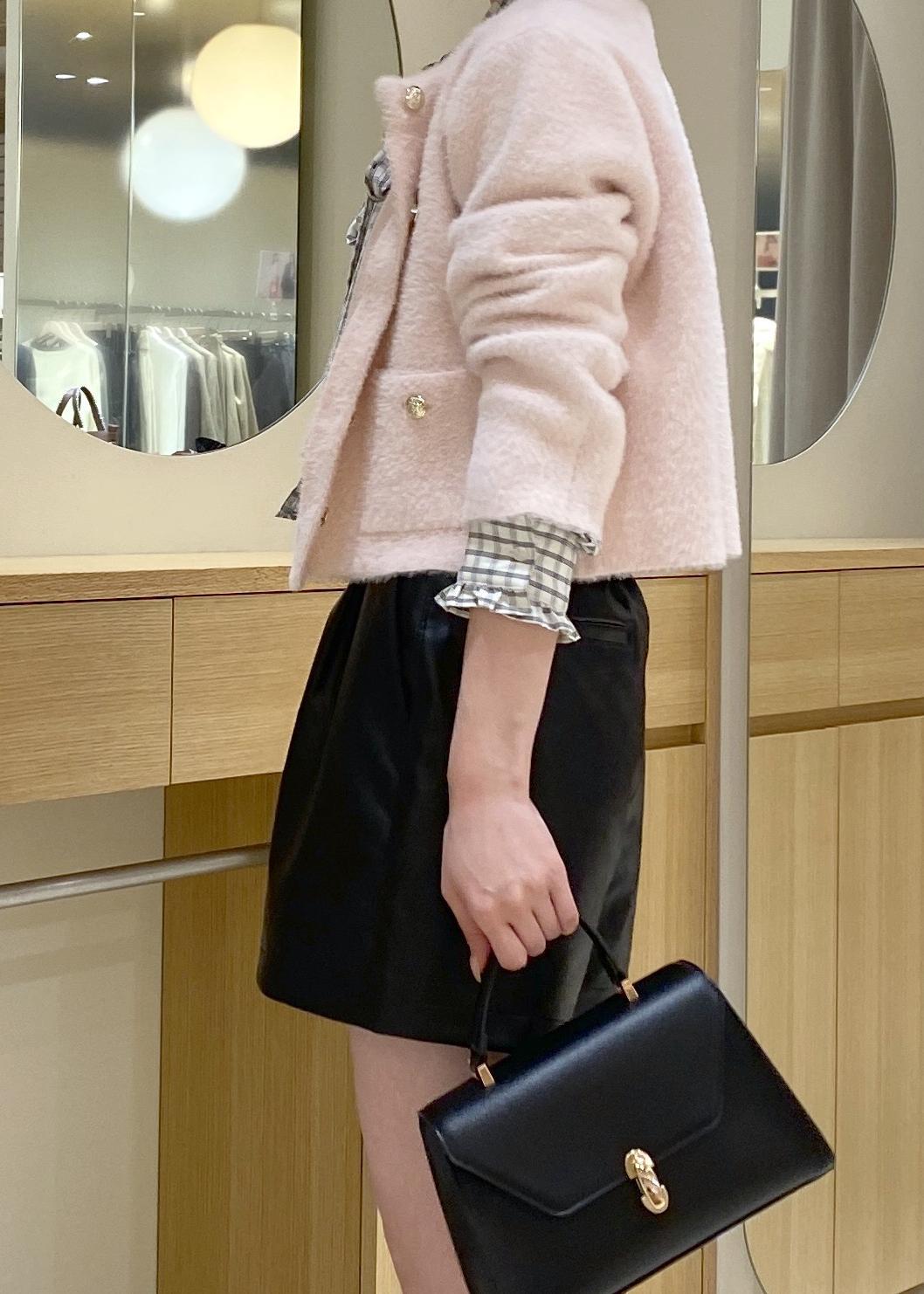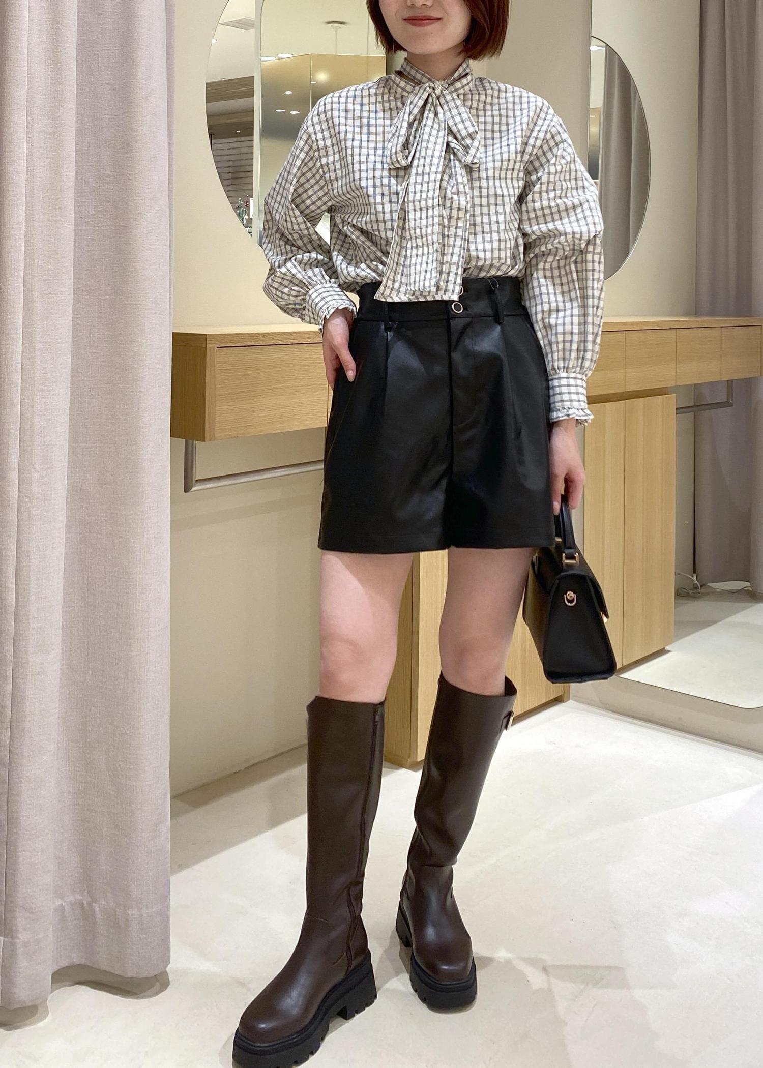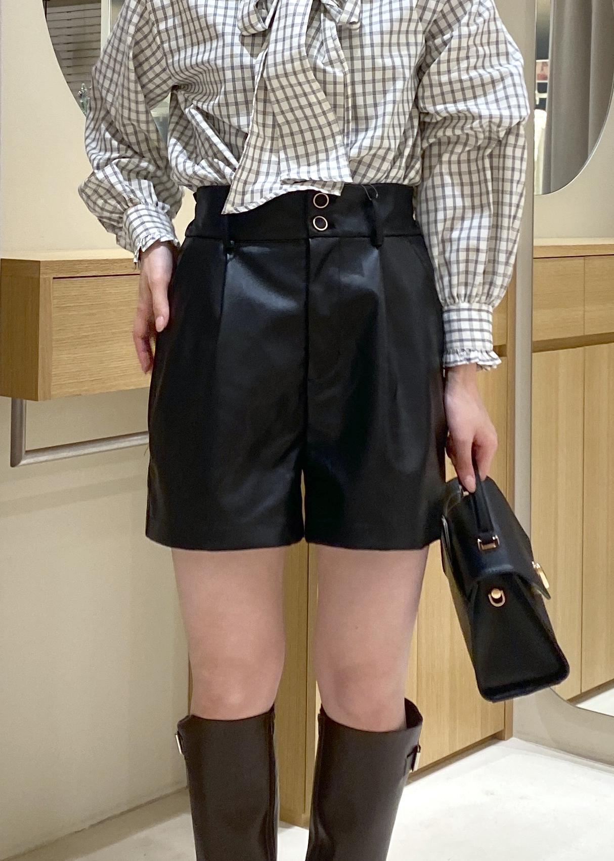 ミニフェザーカーデとシャツのレイヤードにレザーのショートパンツを合わせた、大人ミニ丈パンツコーデです!