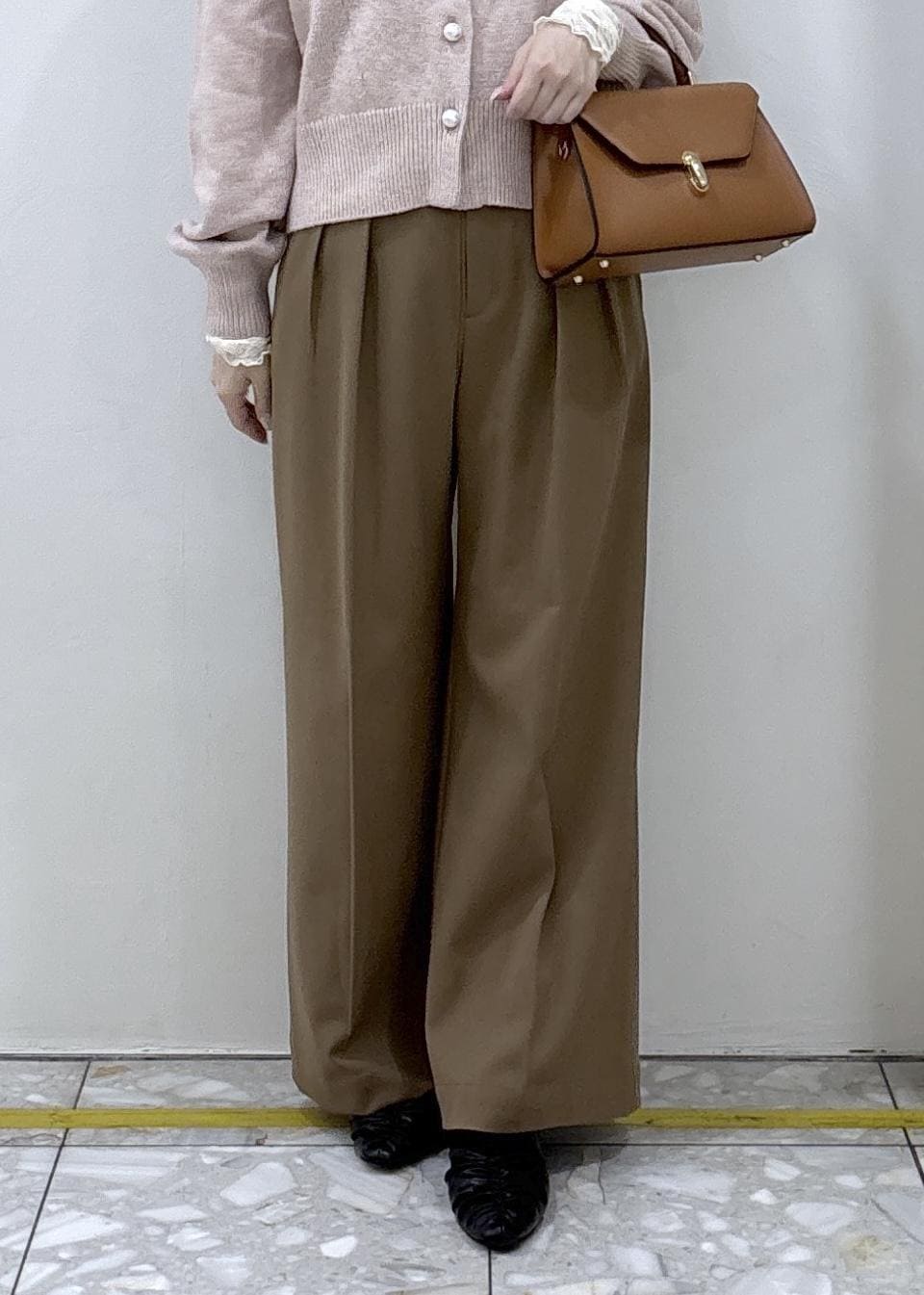 VISHot Beautyツータックワイドパンツ/イージーケアキャメル / S¥6,589レビュー158cmSサイズ着用。太めのウエストマークで、メリハリも◎裏起毛付きで暖かく快適な着用感です◎
