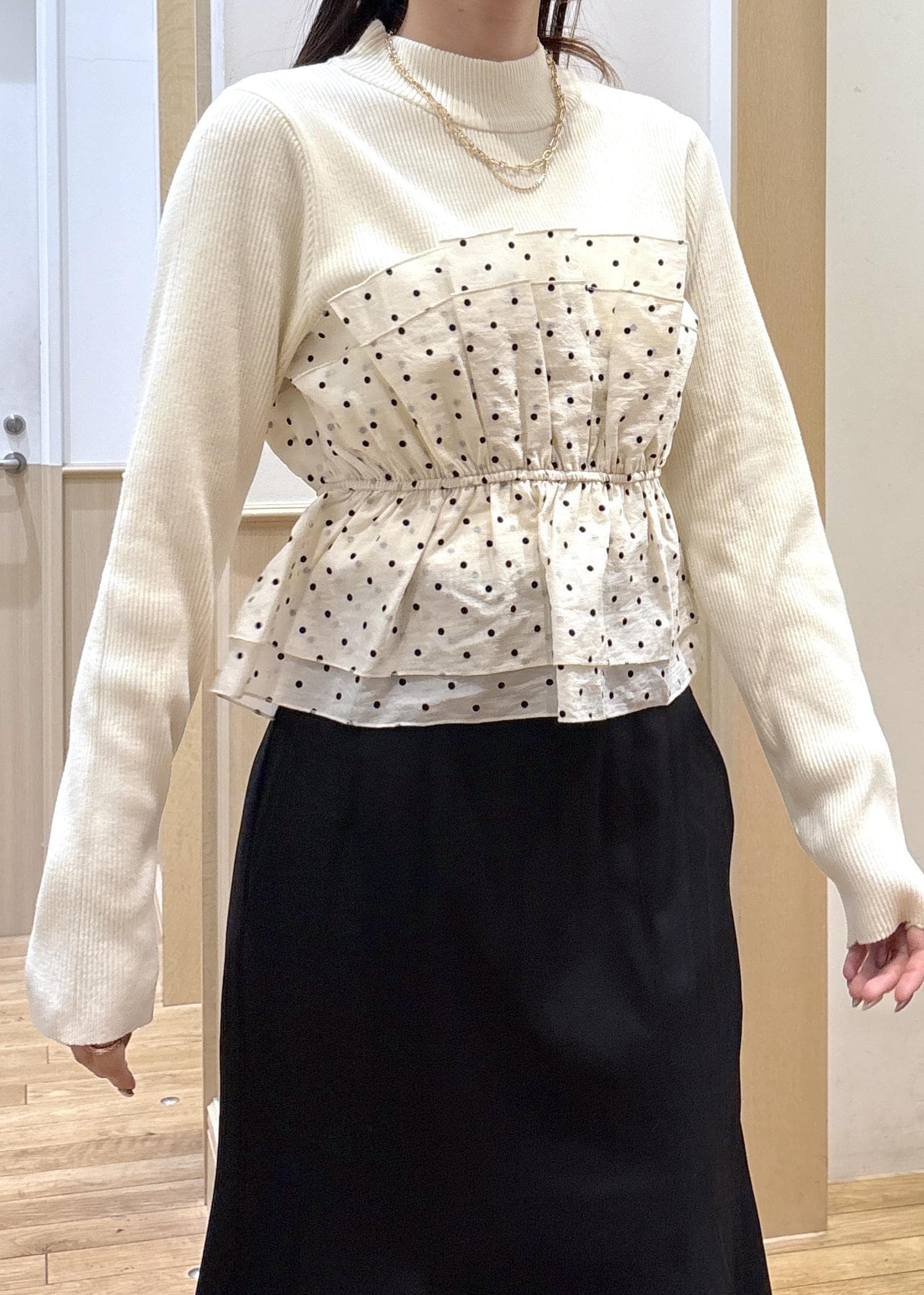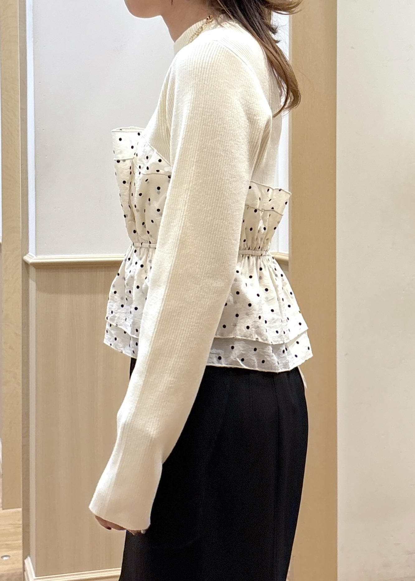 ニット生地は伸びが良く、ほどよい厚みなので秋から冬のトップスとしてしっかりあたたかく着用できます。