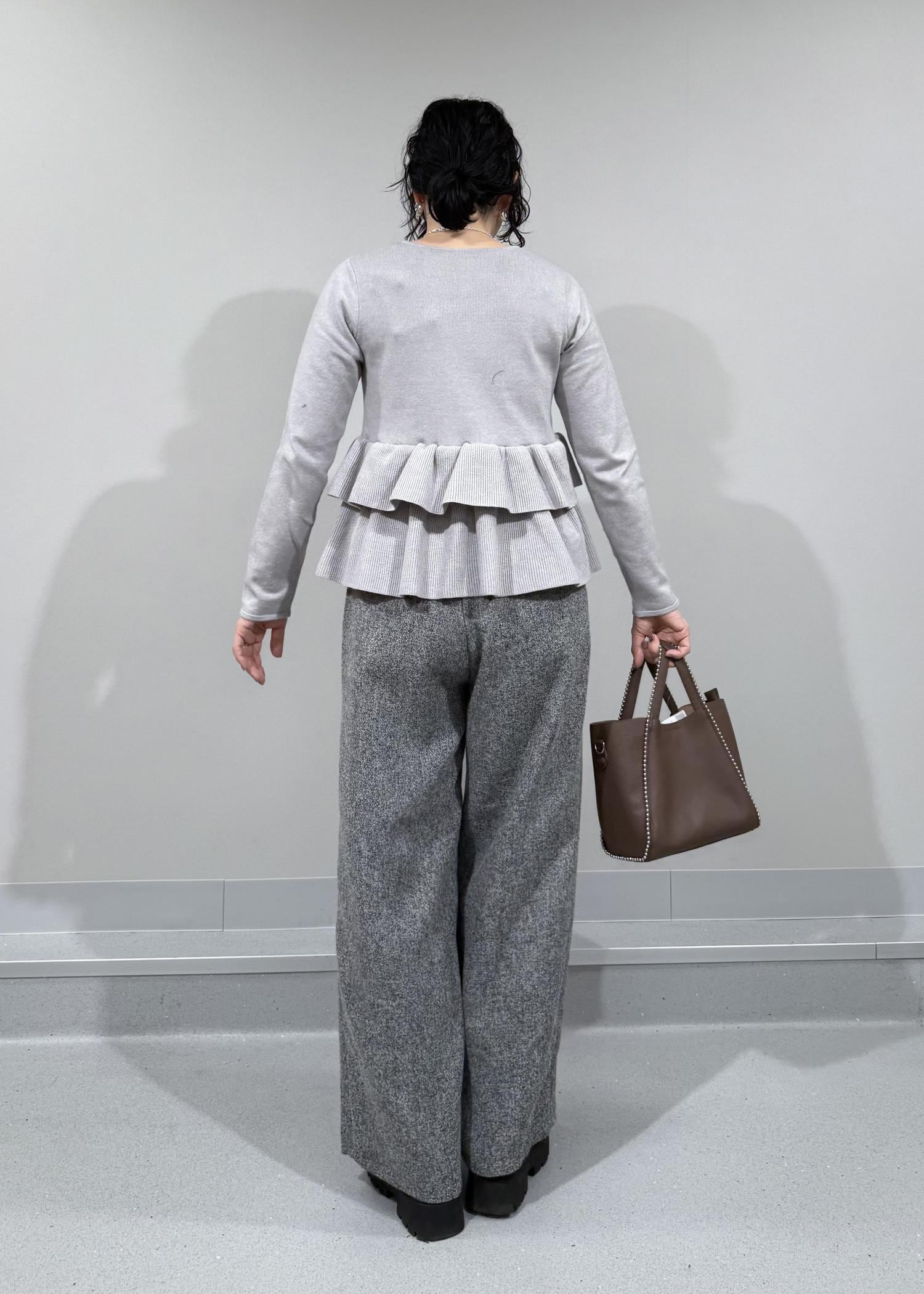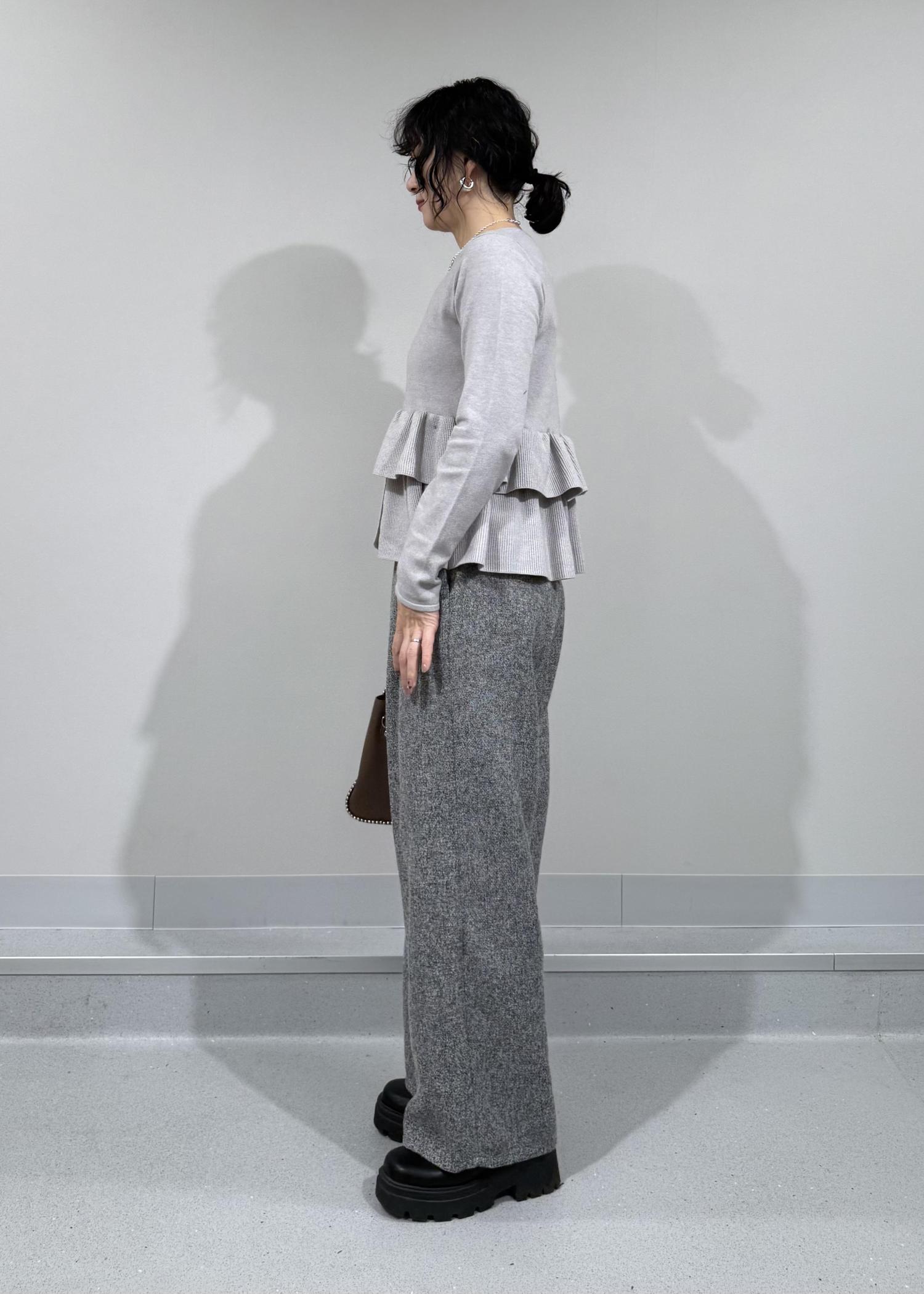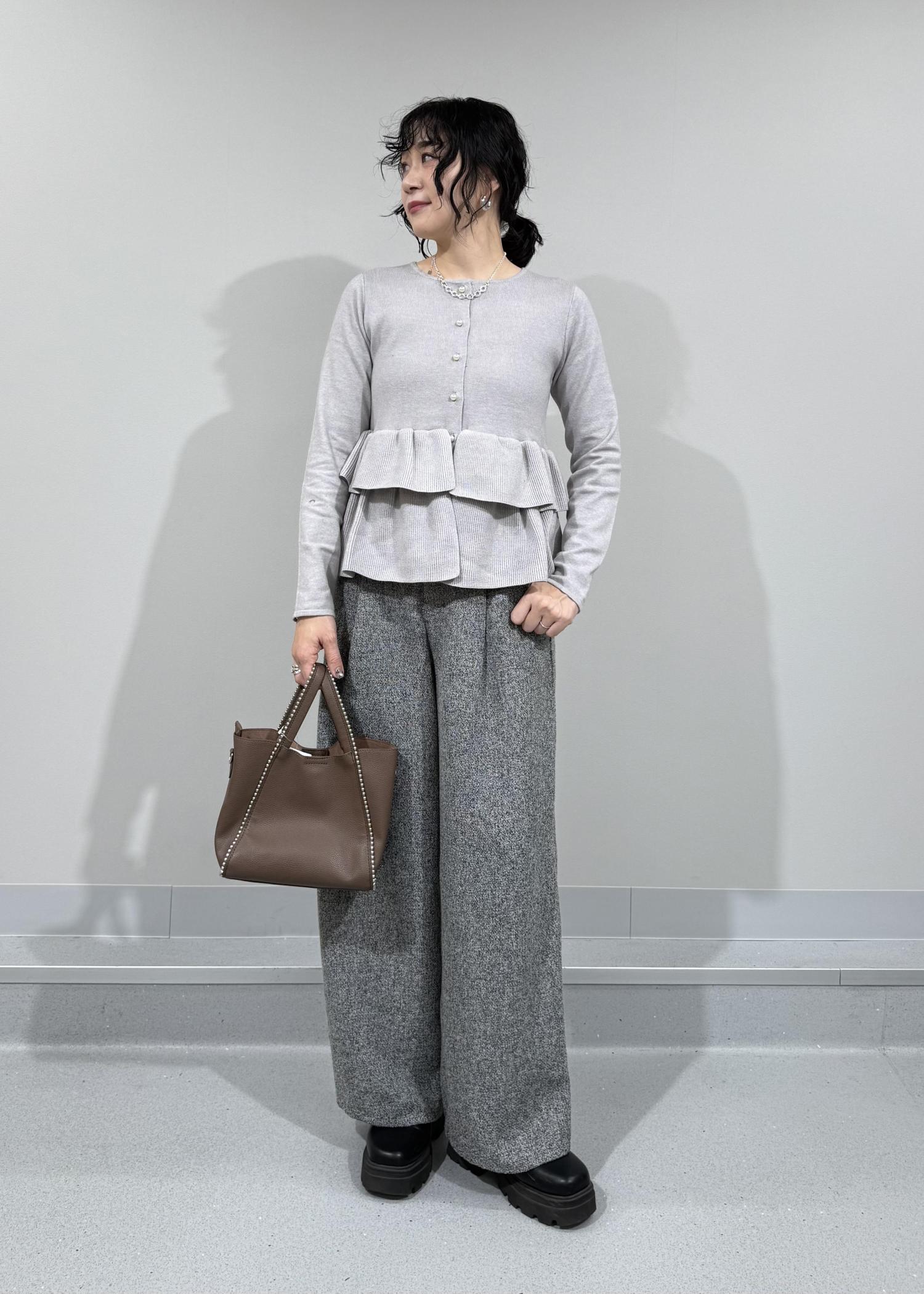 柔らかいグレーカラーに2段のペプラムフリルが可愛いらしいカーディガン。