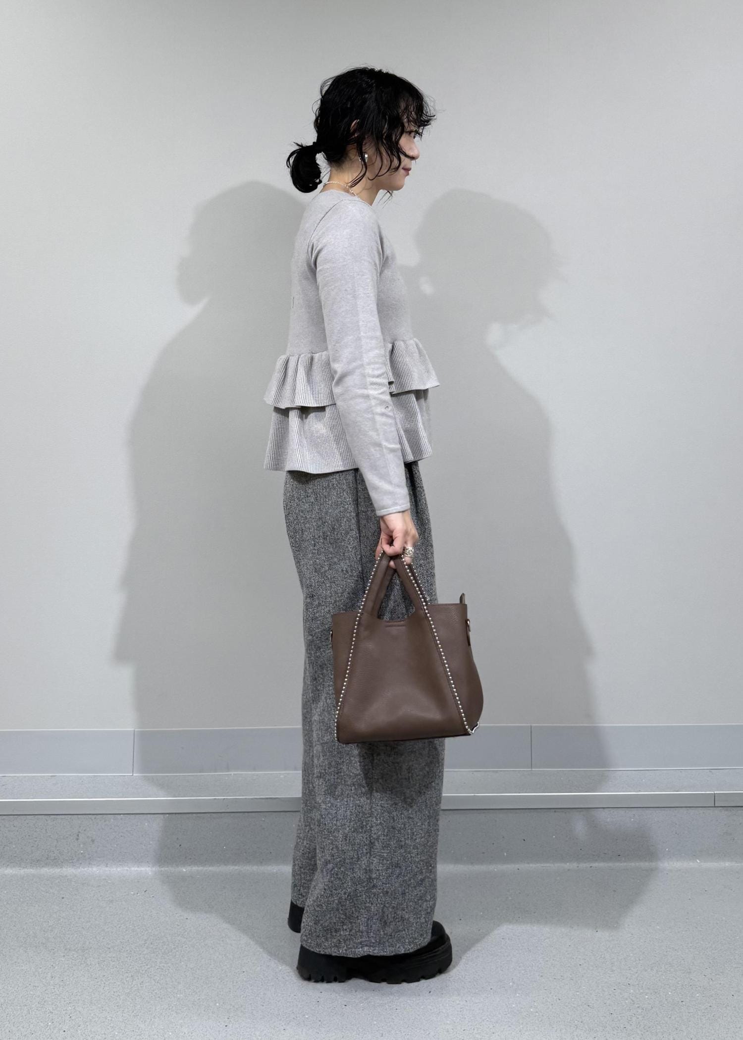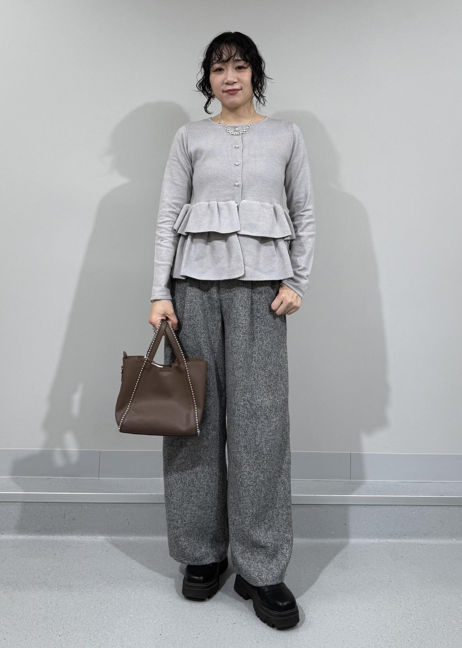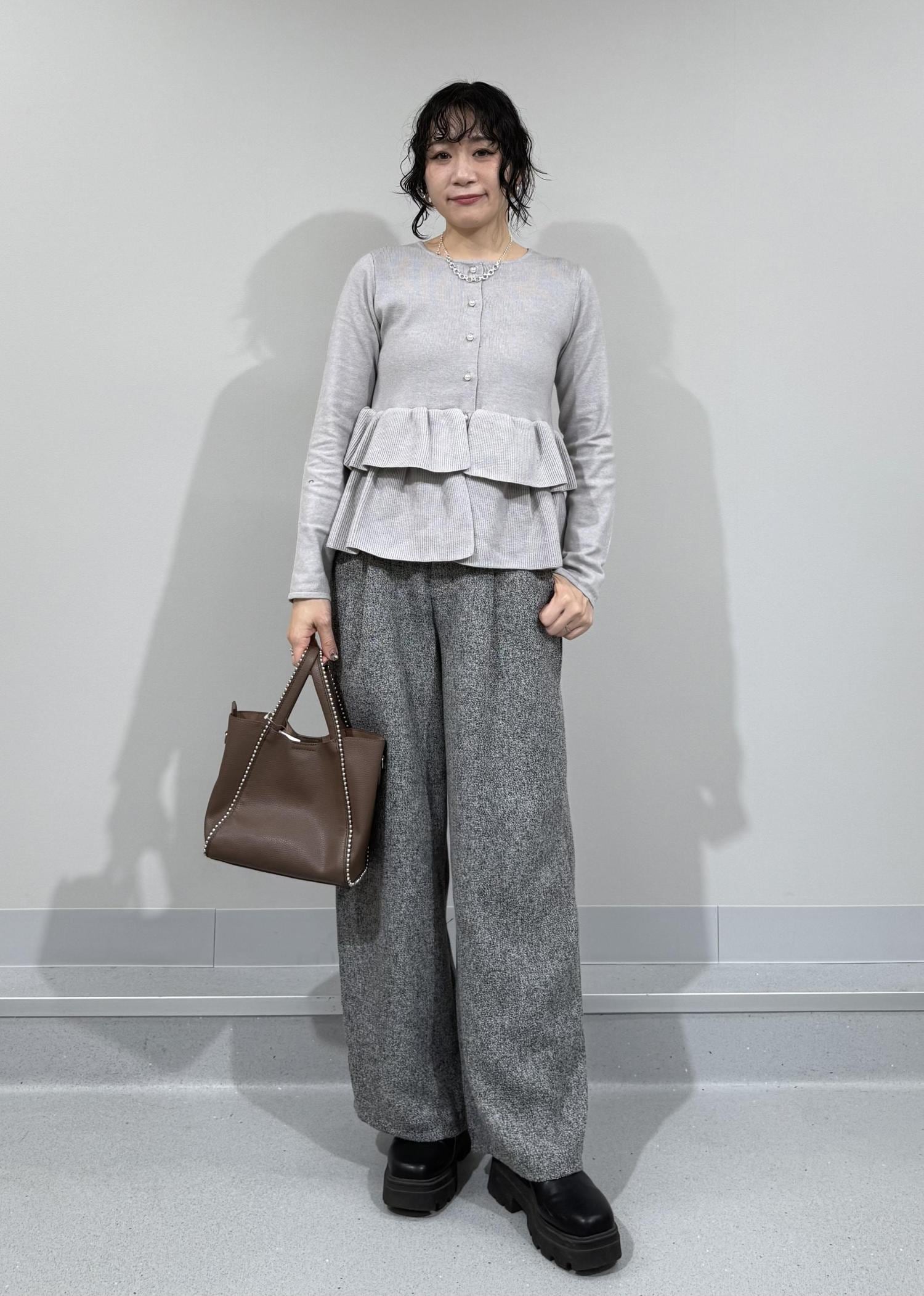 柔らかいグレーカラーに2段のペプラムフリルが可愛いらしいカーディガン。