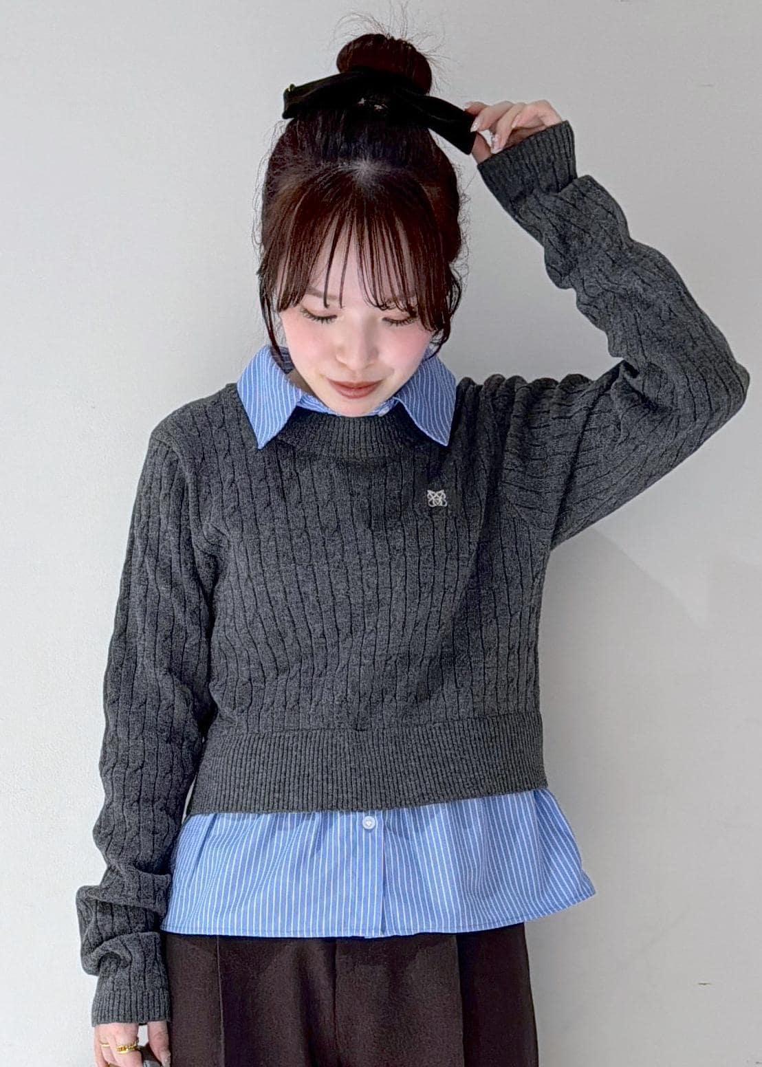 NEW!VIS【美得】ハイゲージケーブシャツドッキングプルオーバーチャコール / F¥5,489レビューシャツとニットがくっついてレイヤード風になっているプルオーバーです!