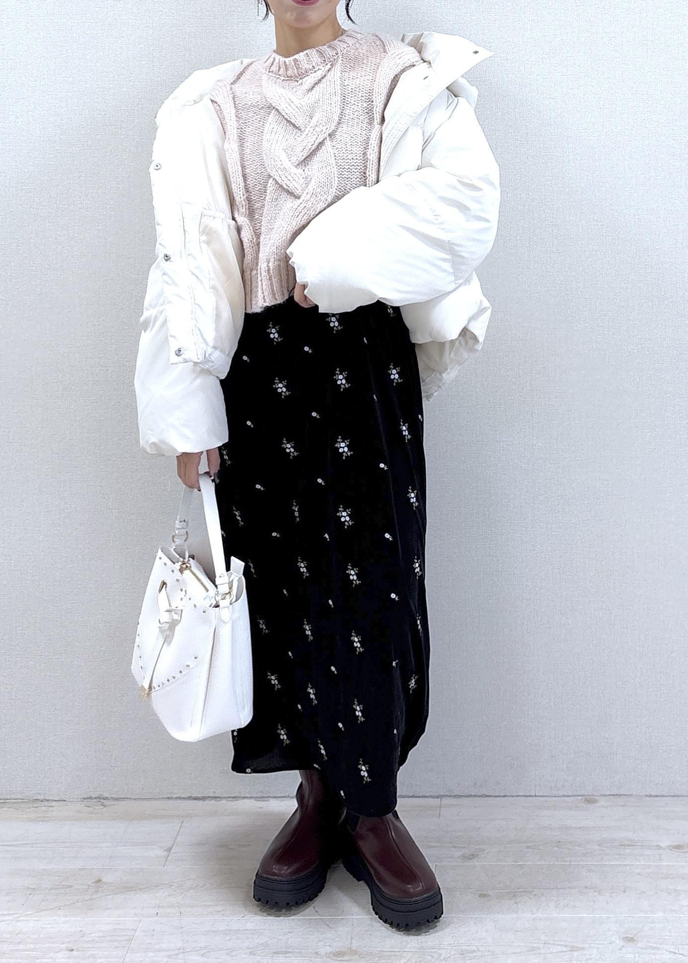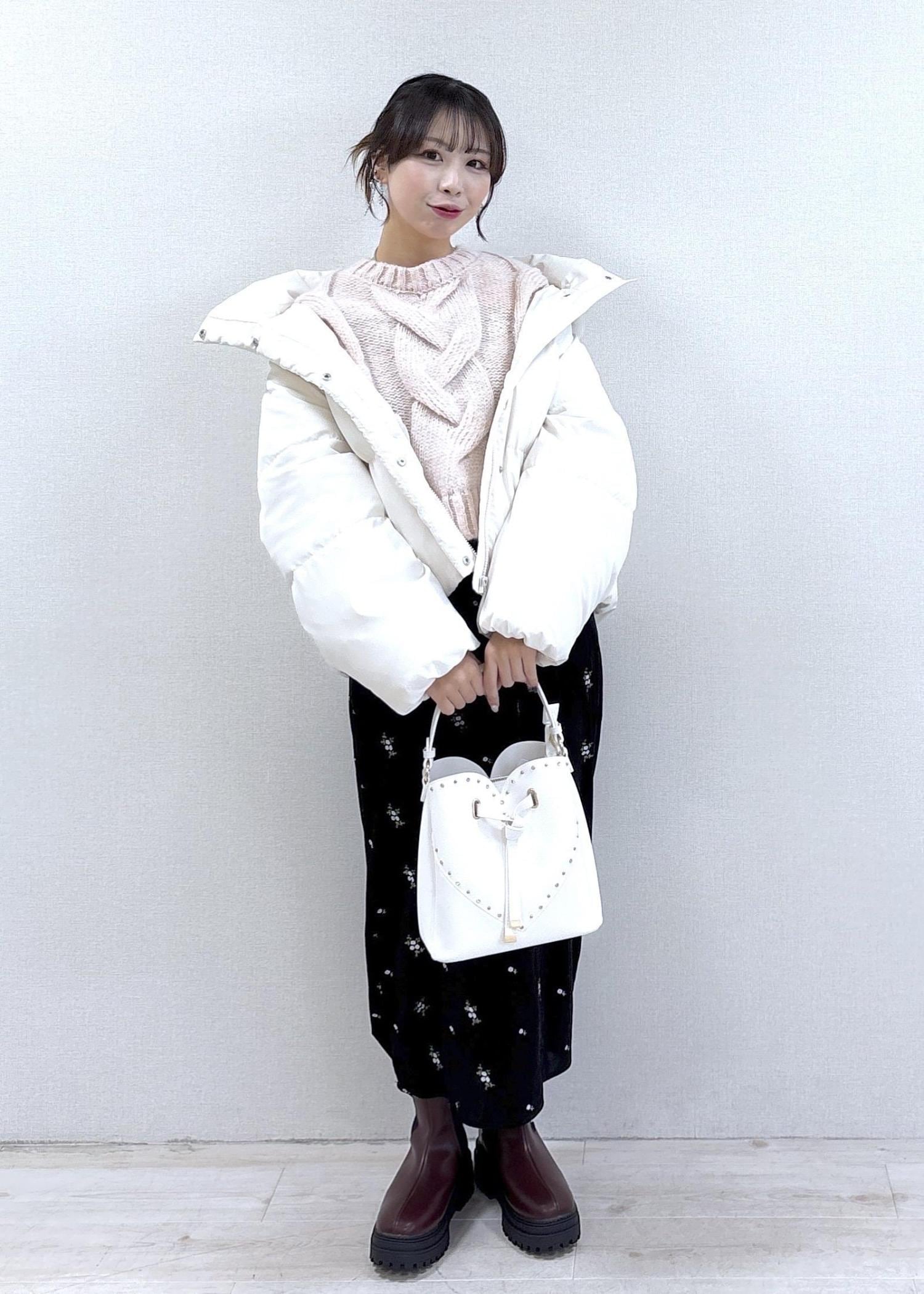 個人的にはマフラーをつけたりハイネックのニットを着ることが多いので、ダウンは肩を抜いてラフに着るのがオシャレ見えでお気に入りです☺︎